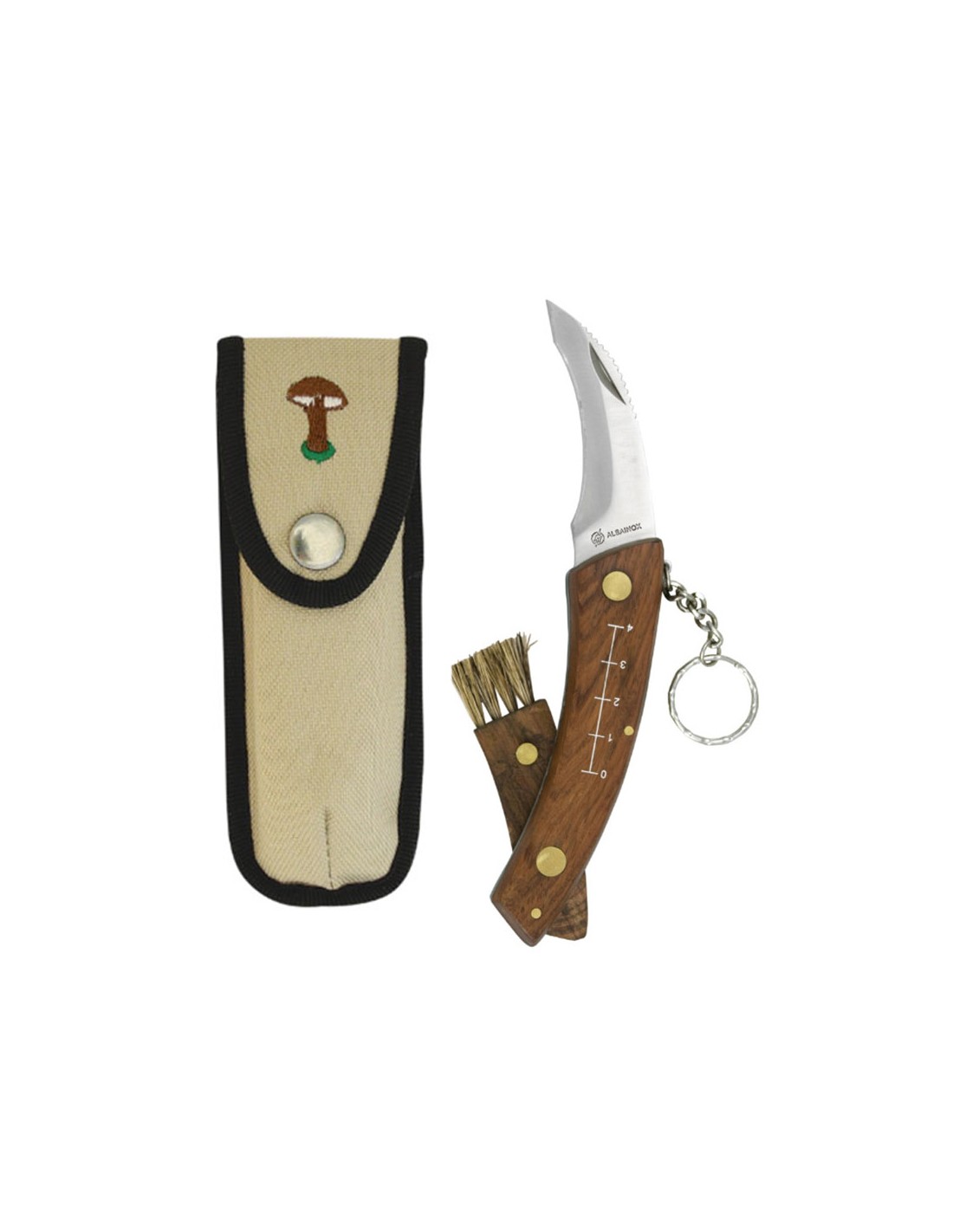 Navaja setas acero inoxidable con mango de madera, llavero + funda hoja 7,5 cm