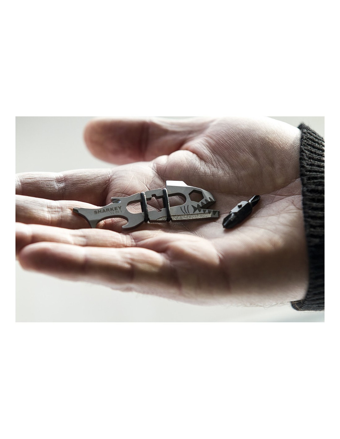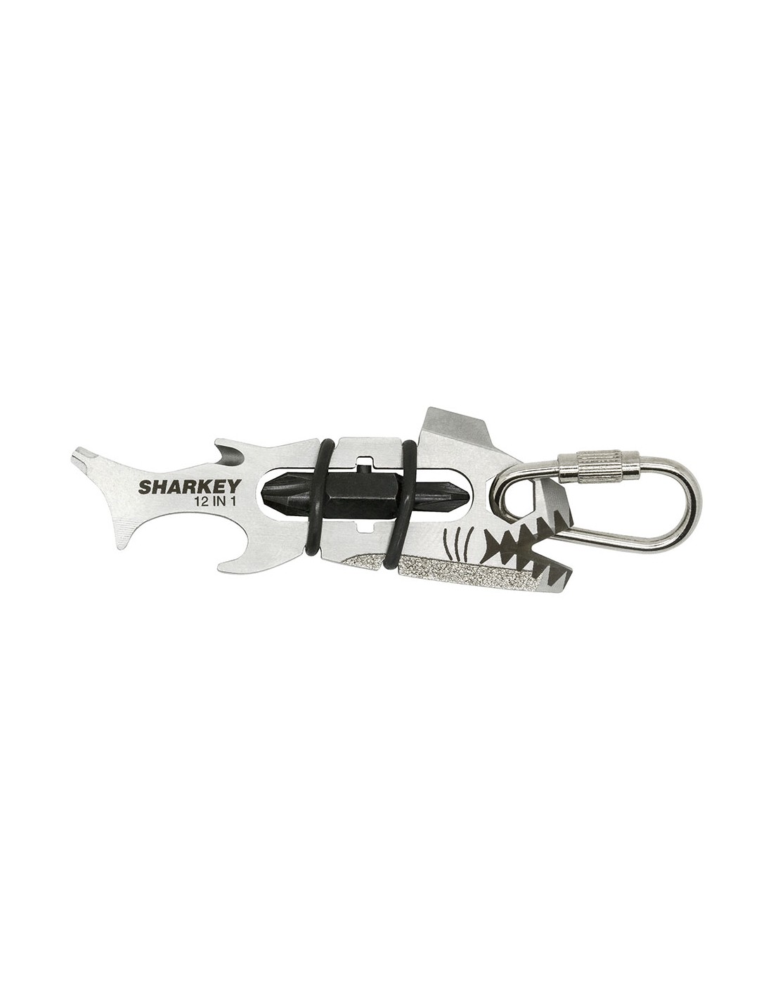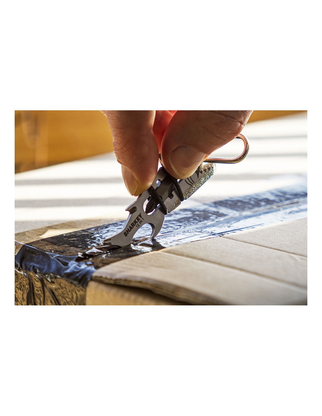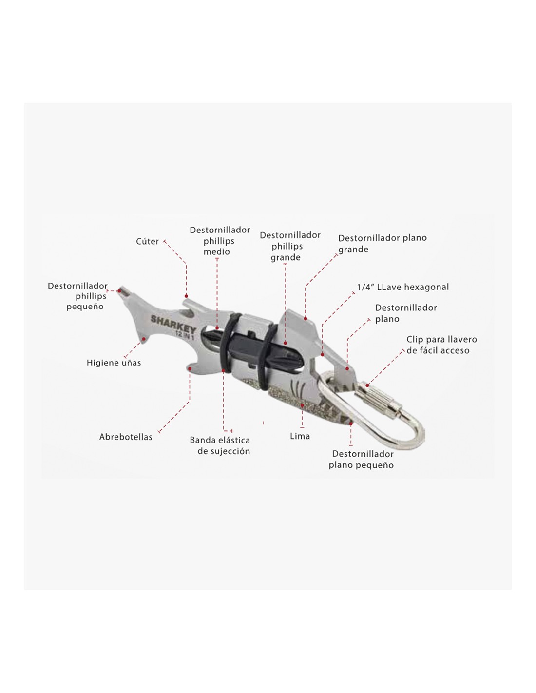Multiherramienta sharkey 12 en 1 es tiene un tamaño de una llave que viene con una mordida. contiene 6 destornilladores planos pequeños, medianos y grande. también es una barra de palanca y abrebotellas y abrelatas, cortahilos y lima funciona también como un cortador de cajas