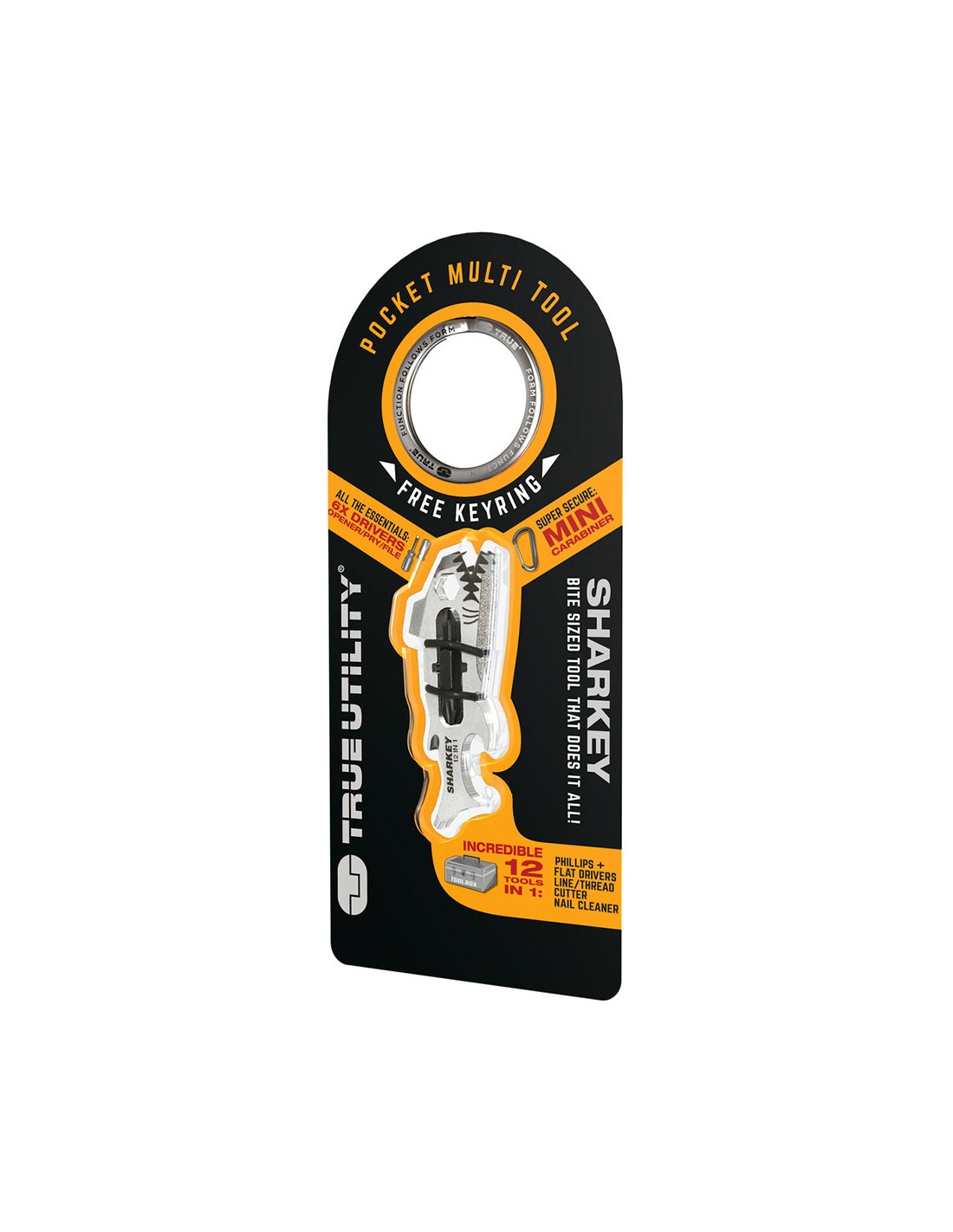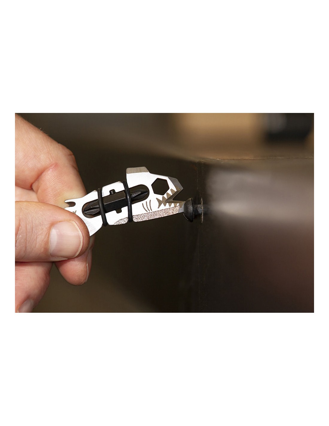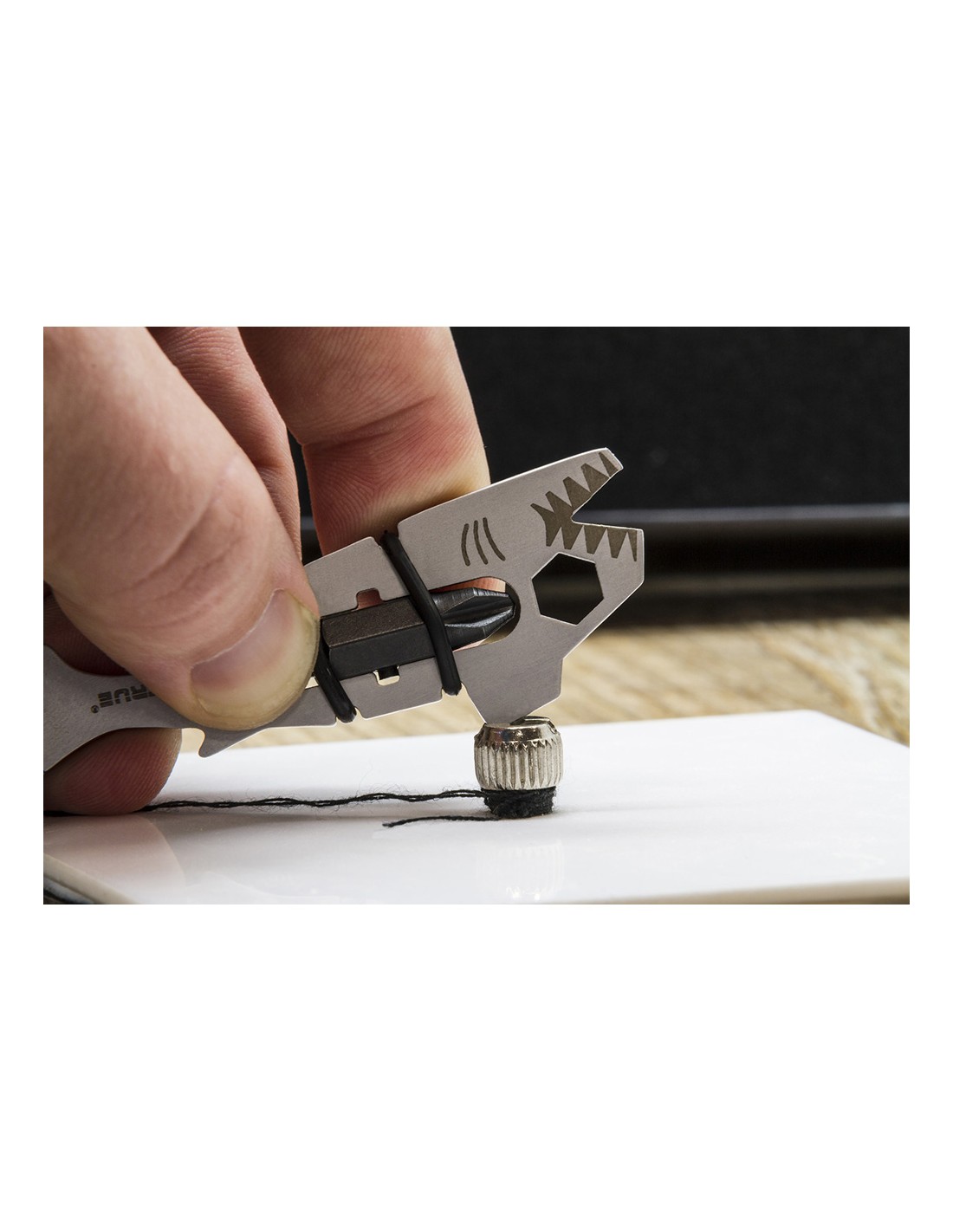 Multiherramienta sharkey 12 en 1 es tiene un tamaño de una llave que viene con una mordida. contiene 6 destornilladores planos pequeños, medianos y grande. también es una barra de palanca y abrebotellas y abrelatas, cortahilos y lima funciona también como un cortador de cajas