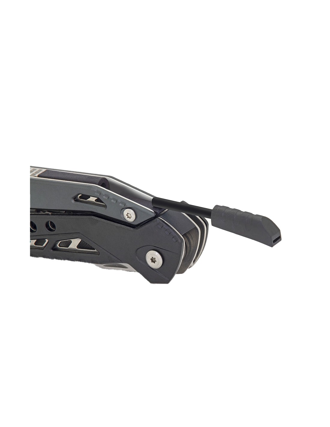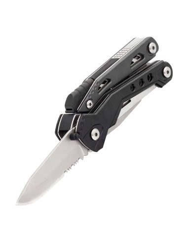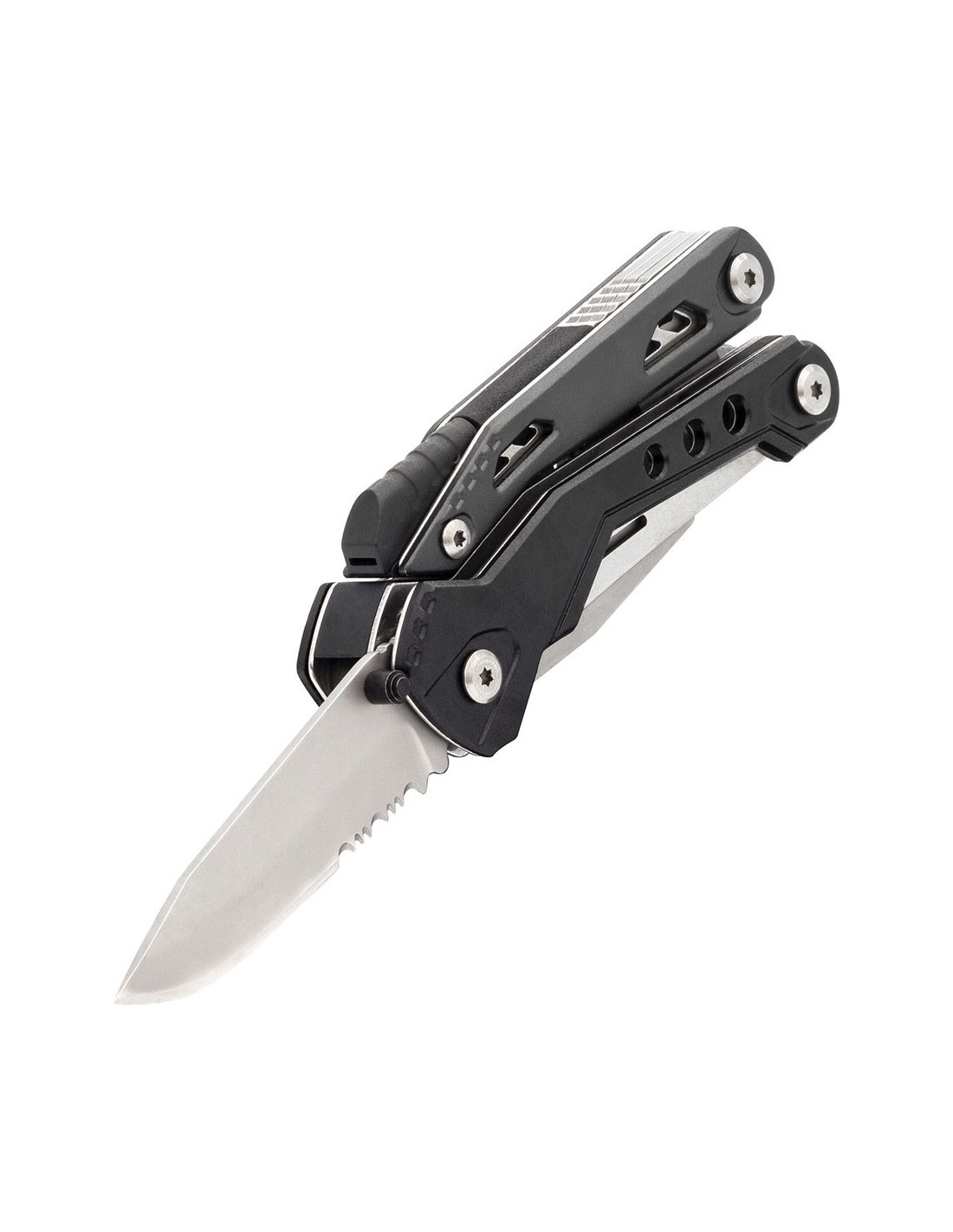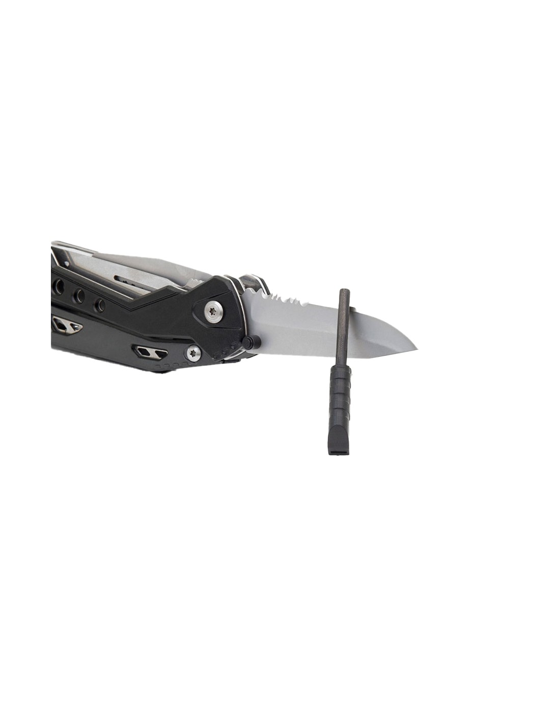 Multiherramienta outdoor para supervivencia de emergencia. acceso al cuchillo con una sola mano, todas las demás herramientas encajan dentro del marco ergonómico estilo esqueleto. incluye varilla de ferrocerio con un silbato de emergencia. navaja parcialmente dentada de 70 mm con perno para el pulgar alicates de punta de aguja con cortadores de carburo/pelacables, con resorte. sierra de corte de dientes de tiburón de 50 mm, triple punta endurecida + lima doble cara, corte de diamante abridor de botellas un destornillador plano grande, 1 phillips bolsa de transporte de nailon con presilla para cinturón