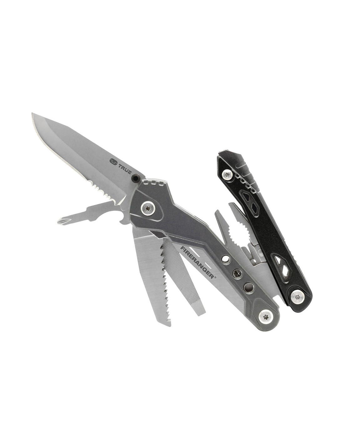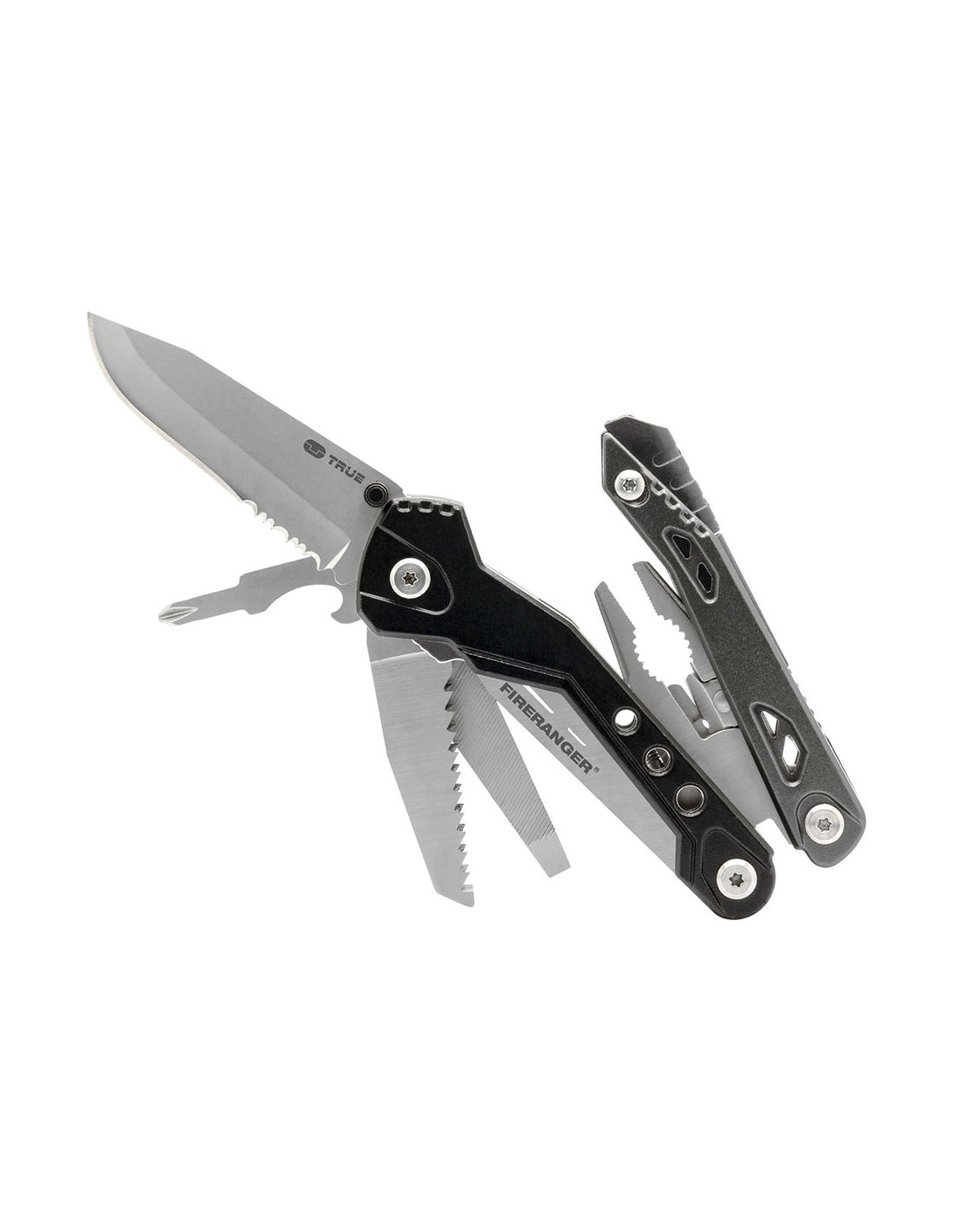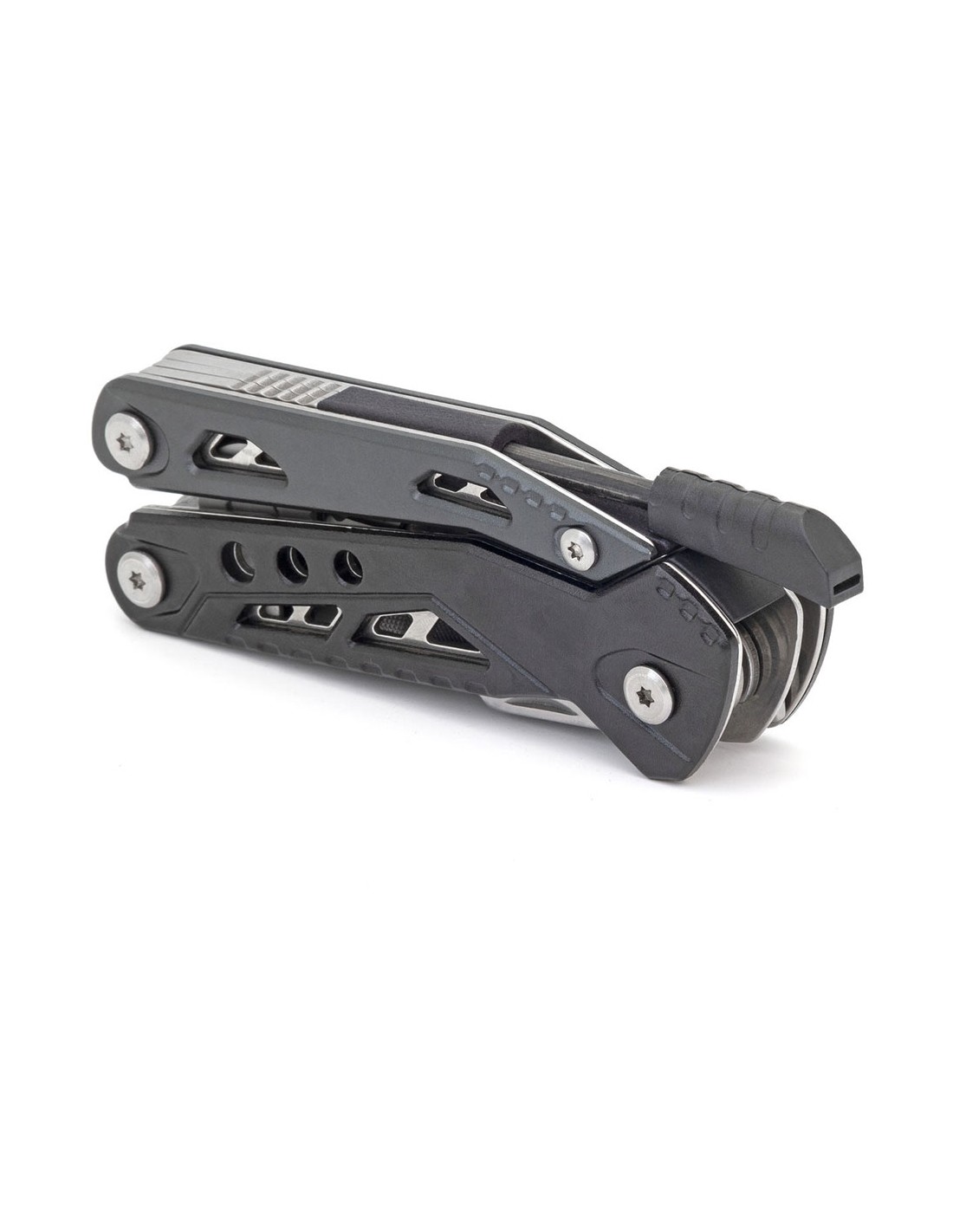 Multiherramienta outdoor para supervivencia de emergencia. acceso al cuchillo con una sola mano, todas las demás herramientas encajan dentro del marco ergonómico estilo esqueleto. incluye varilla de ferrocerio con un silbato de emergencia. navaja parcialmente dentada de 70 mm con perno para el pulgar alicates de punta de aguja con cortadores de carburo/pelacables, con resorte. sierra de corte de dientes de tiburón de 50 mm, triple punta endurecida + lima doble cara, corte de diamante abridor de botellas un destornillador plano grande, 1 phillips bolsa de transporte de nailon con presilla para cinturón