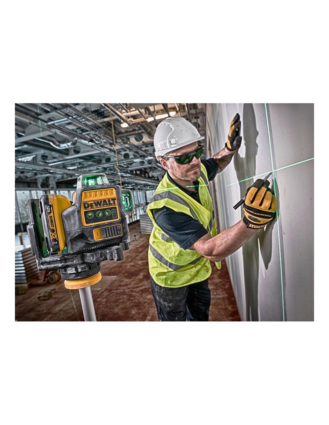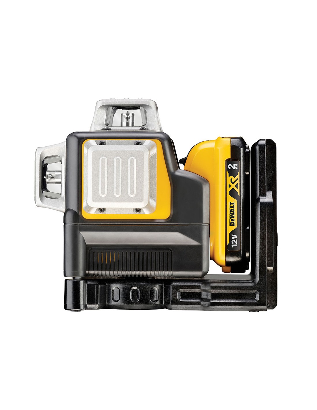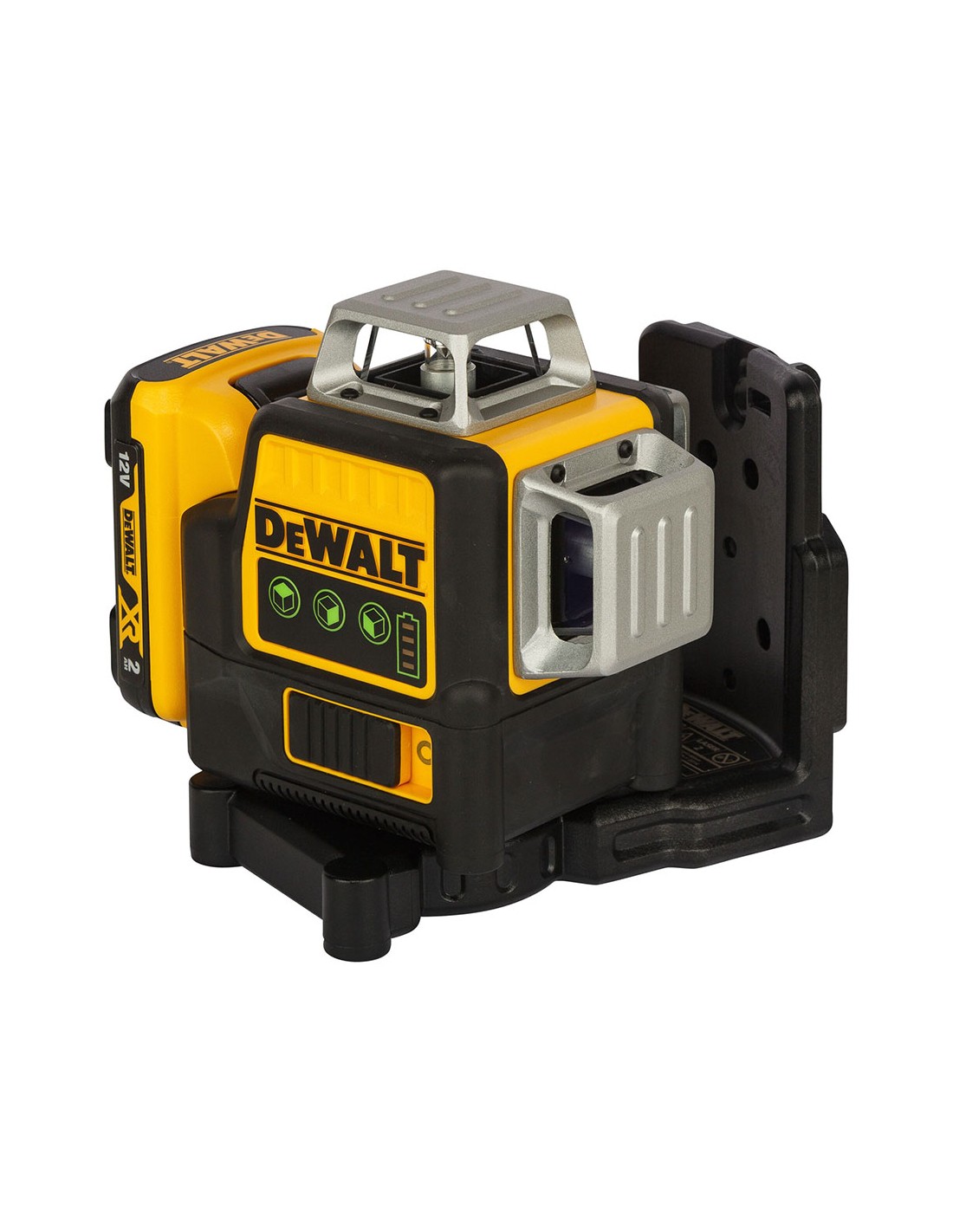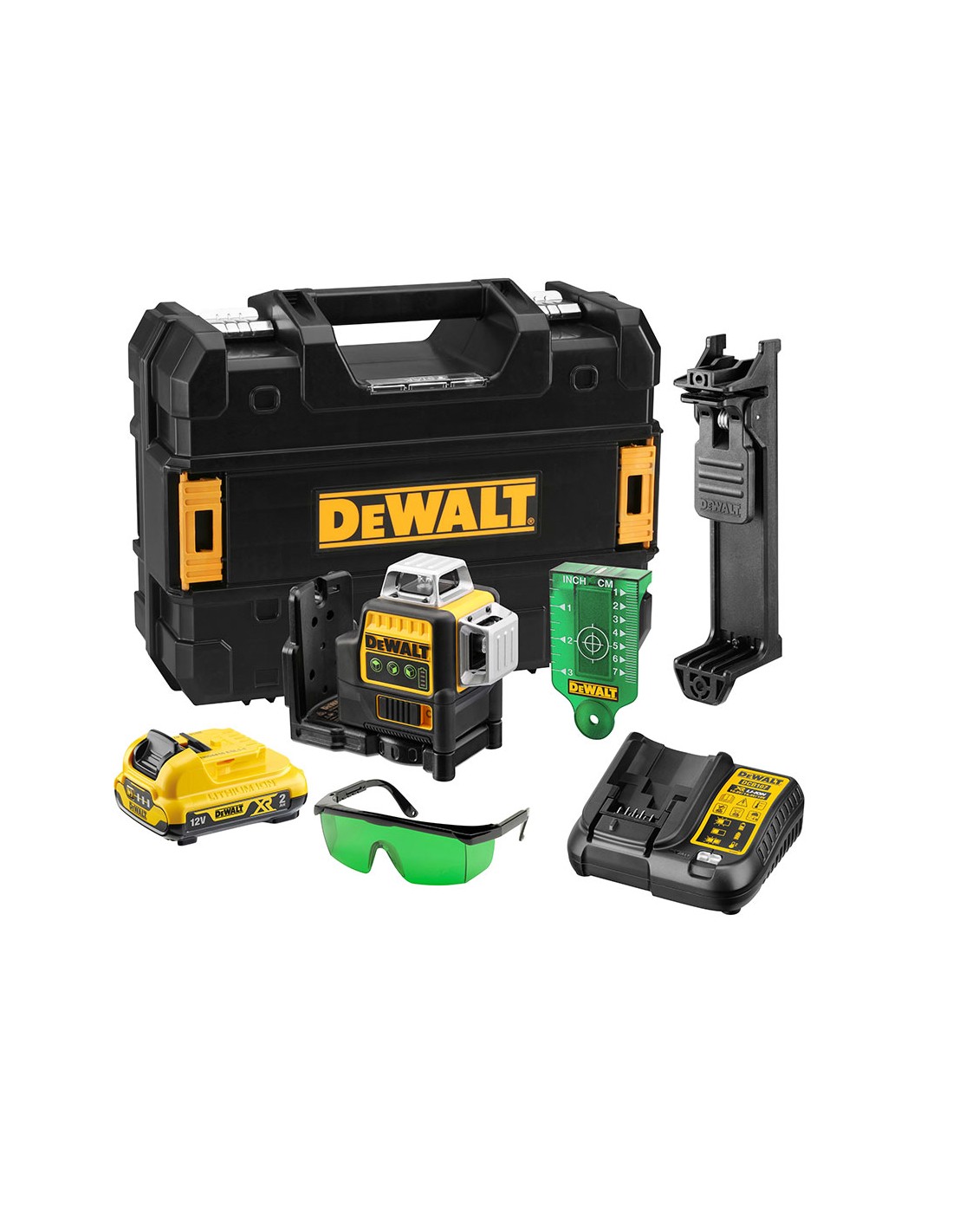 Nivel láser autonivelante verde de 3 líneas 360° xr 12v con batería li-ion 2ah. láser autonivelante 3 lineas 360° - verde. autonivelación +/-4, precisión +/-3mm@10m. capacidad 30m sin el receptor, 60m con el receptor. incluye batería li-ion 10,8v 2,0ah con indicador de estado de carga. secuencia de proyección intermitente para uso con nivelación manual. base pivotante e imantada integrada con rosca 1/4 para uso con trípode. resistente carcasa engomada con sellado ip65 contra polvo y agua y resistente a caídas de hasta 2m de altura. incluye: batería 10,8v, cargador, soporte de pared y maletín"