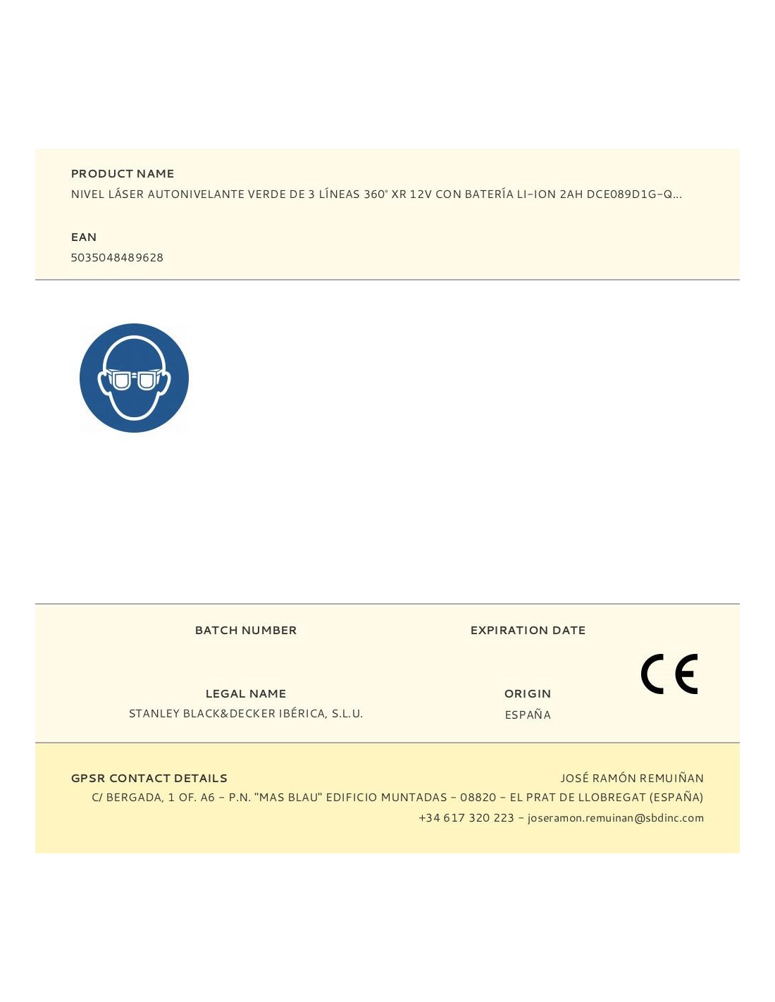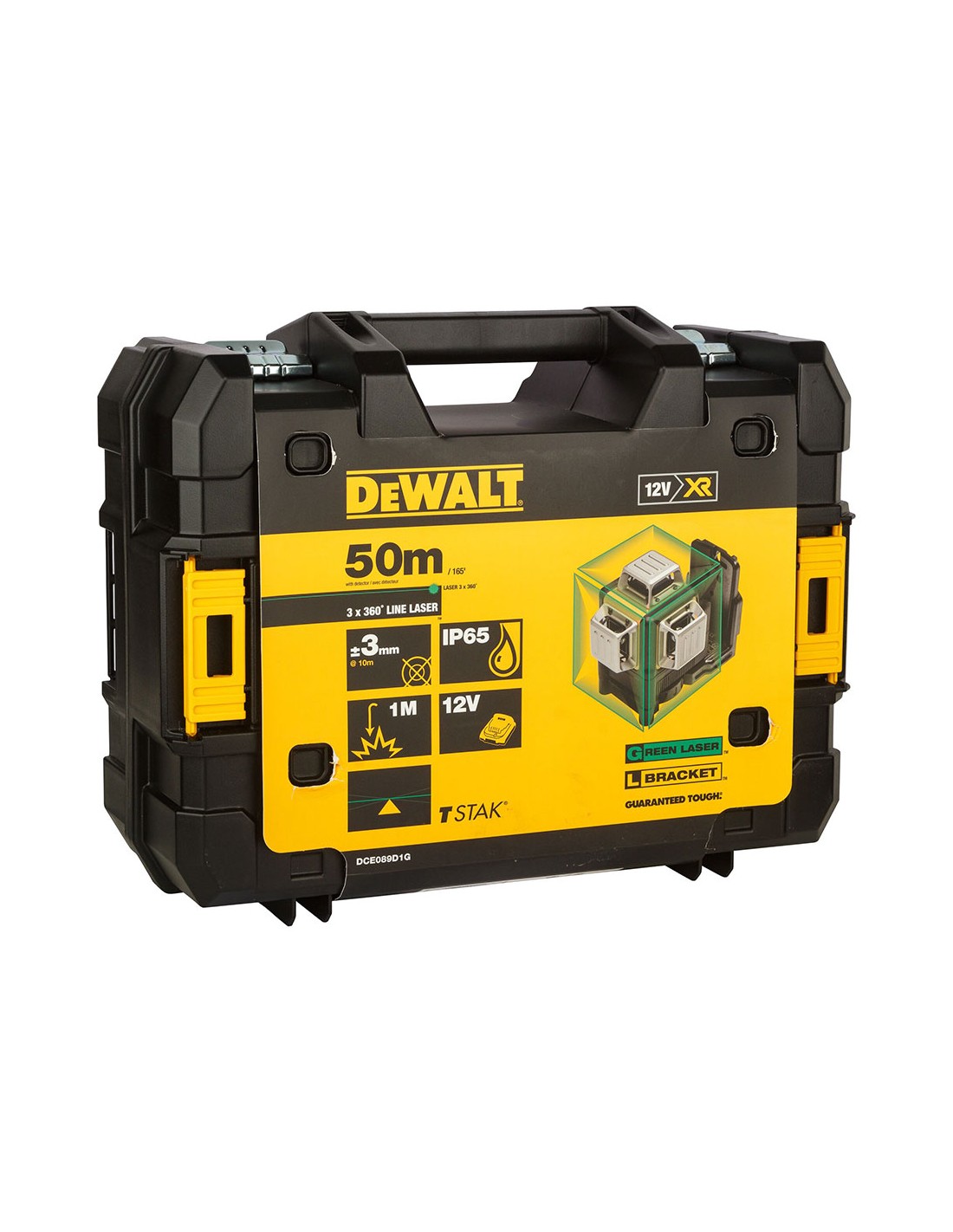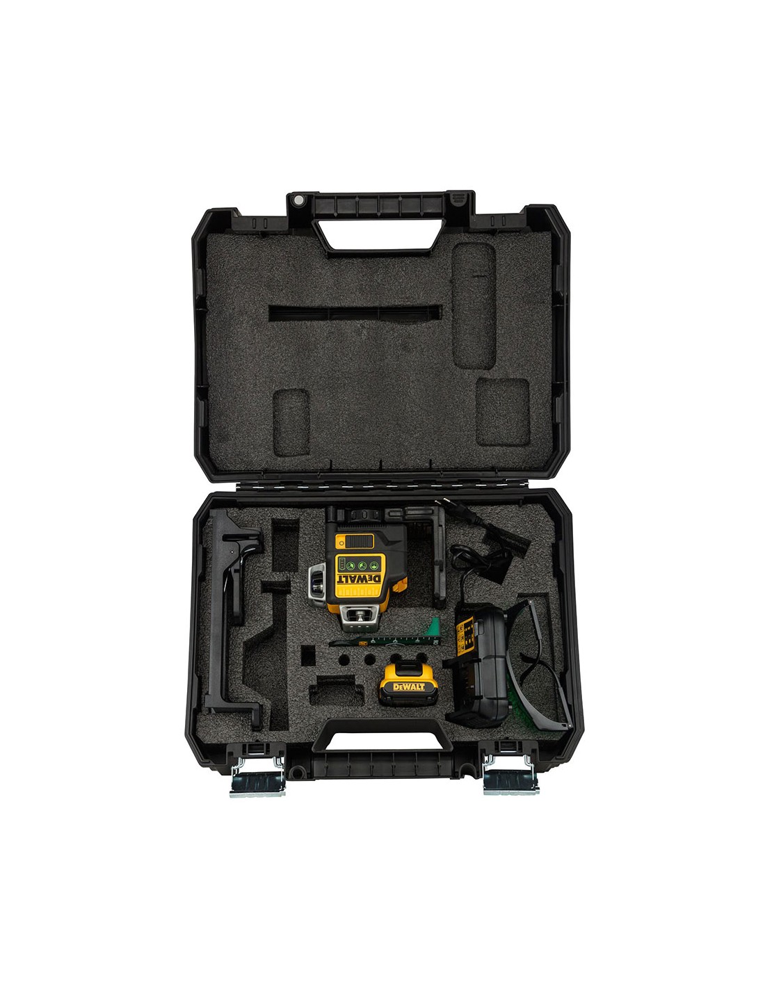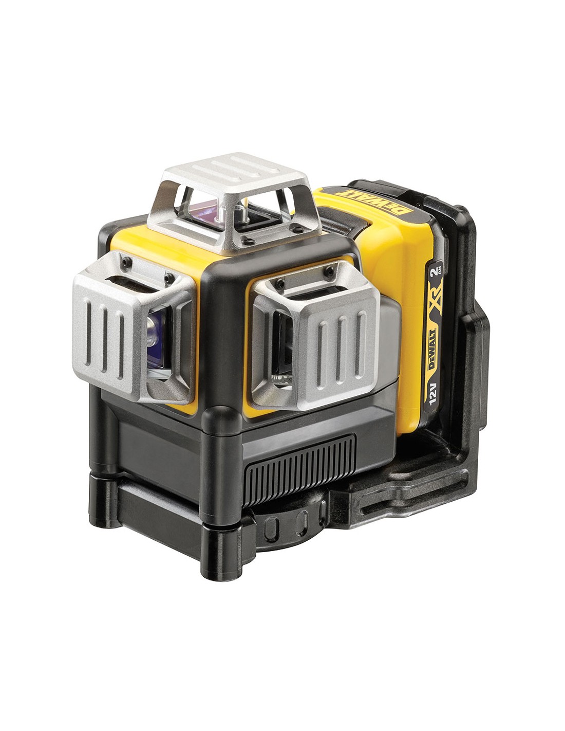 Nivel láser autonivelante verde de 3 líneas 360° xr 12v con batería li-ion 2ah. láser autonivelante 3 lineas 360° - verde. autonivelación +/-4, precisión +/-3mm@10m. capacidad 30m sin el receptor, 60m con el receptor. incluye batería li-ion 10,8v 2,0ah con indicador de estado de carga. secuencia de proyección intermitente para uso con nivelación manual. base pivotante e imantada integrada con rosca 1/4 para uso con trípode. resistente carcasa engomada con sellado ip65 contra polvo y agua y resistente a caídas de hasta 2m de altura. incluye: batería 10,8v, cargador, soporte de pared y maletín"