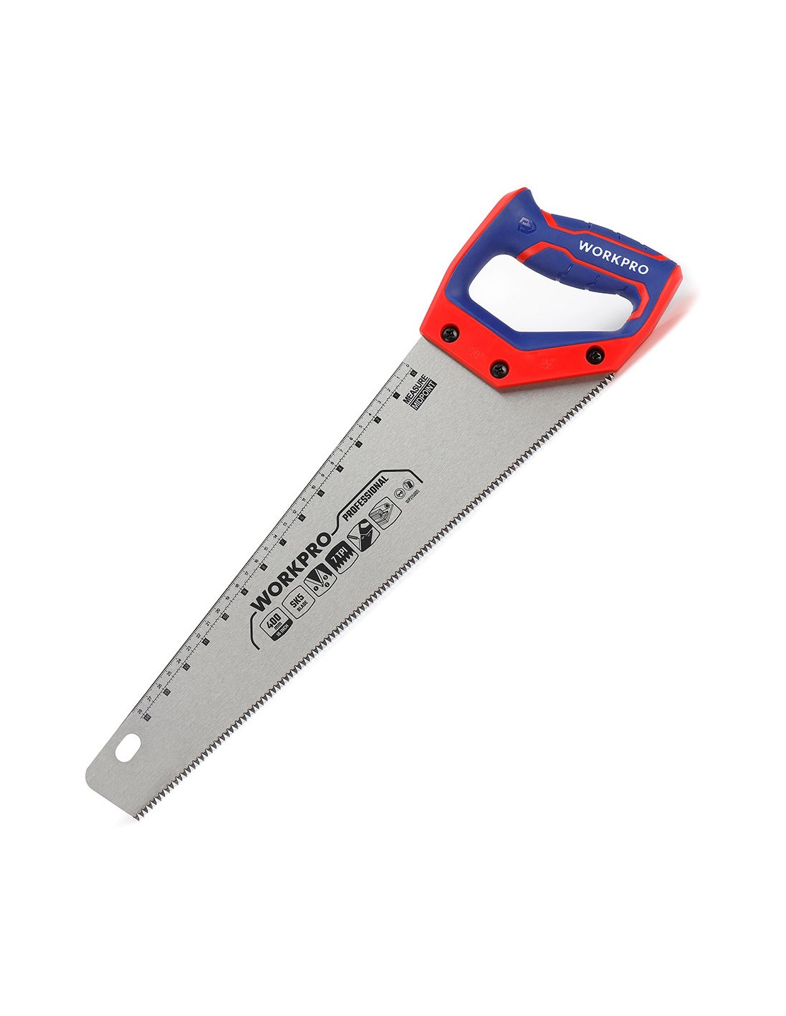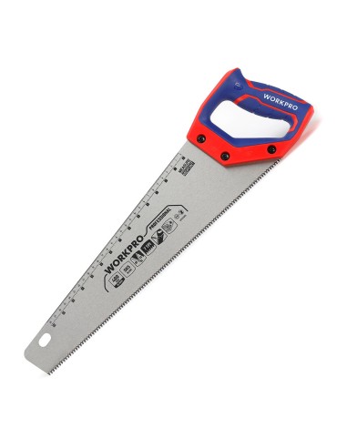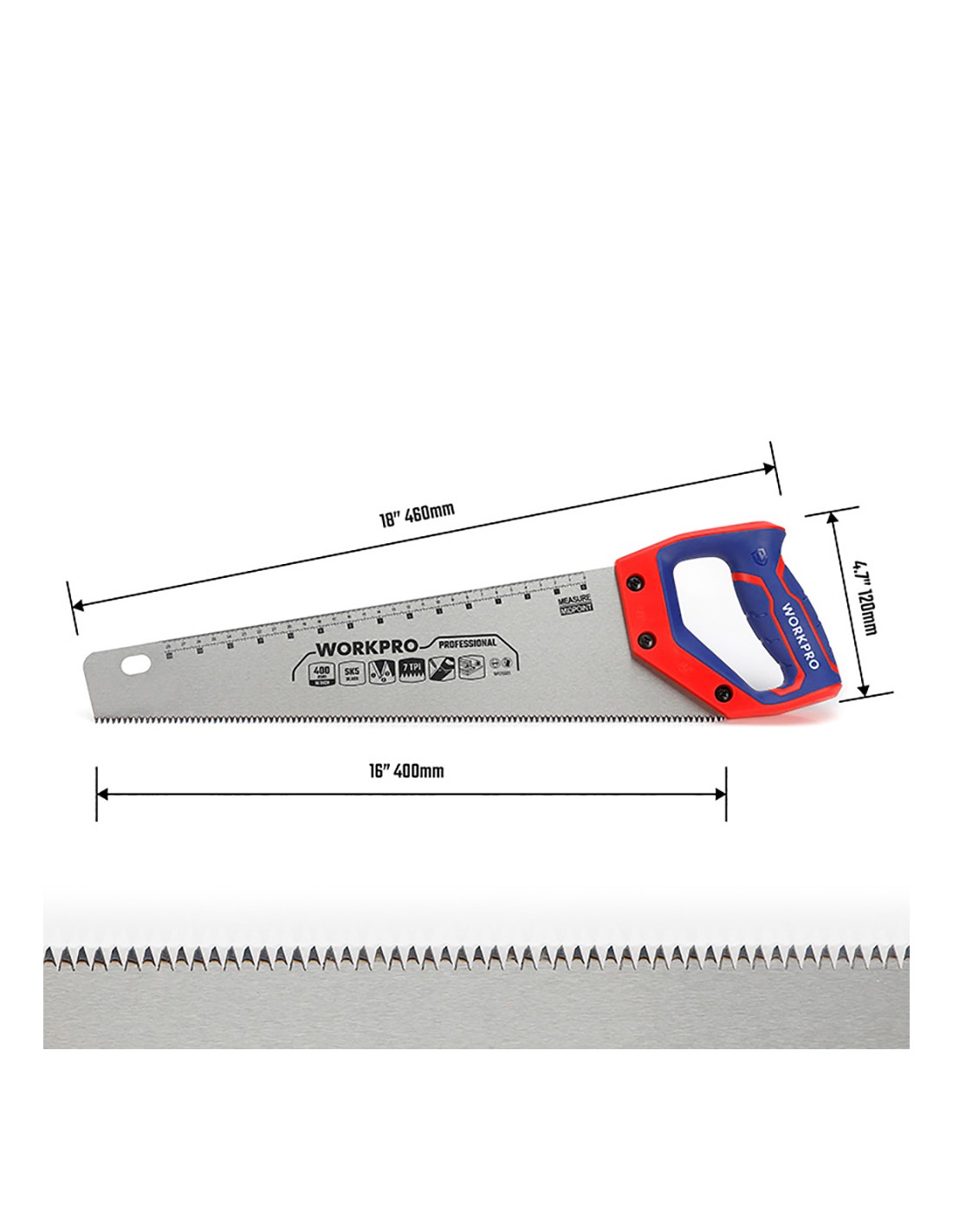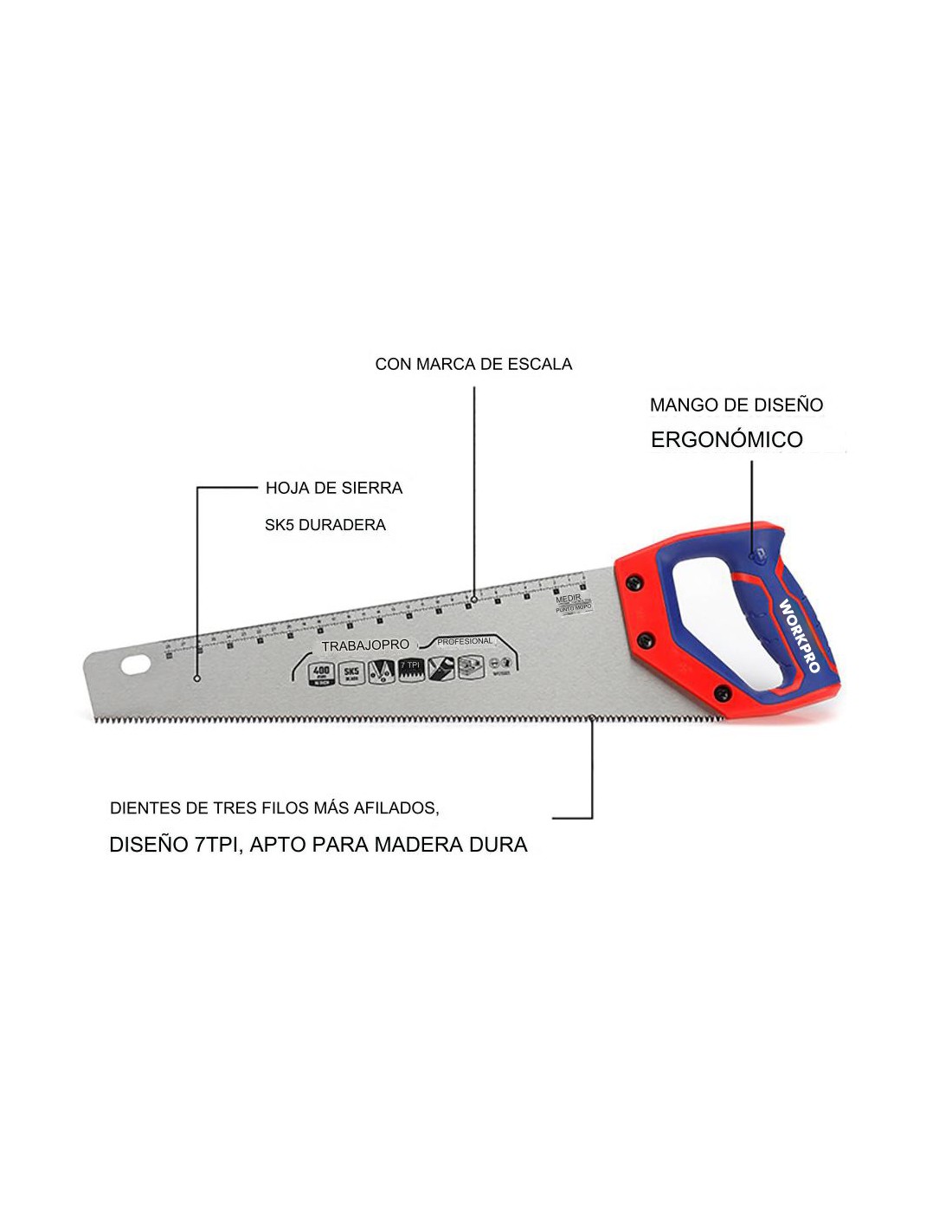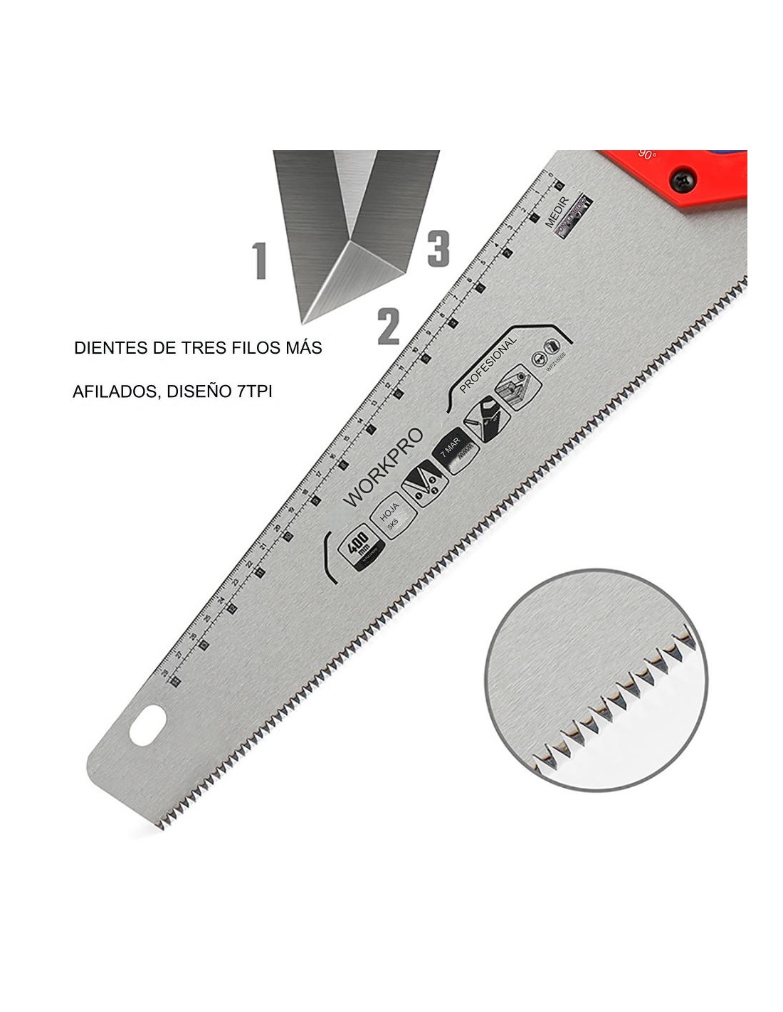 Sierra de mano de 400 mm (16"), 7tpi. mango de diseño ergonomico. con marca de escala. hoja de sierra sk5, más duradera. dientes rectificados triples. diseño de dientes grandes y pequeños para una eliminación de virutas más rápida y una mayor eficiencia. adecuado para cortes rápidos de madera, bambú, pvc y otros materiales
