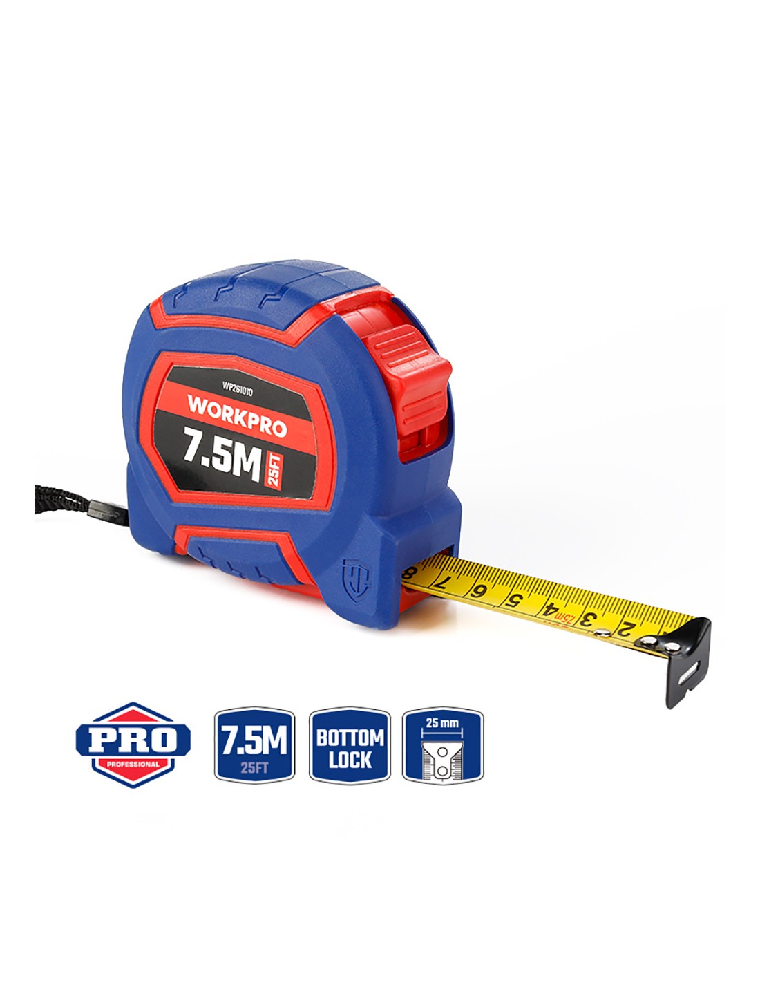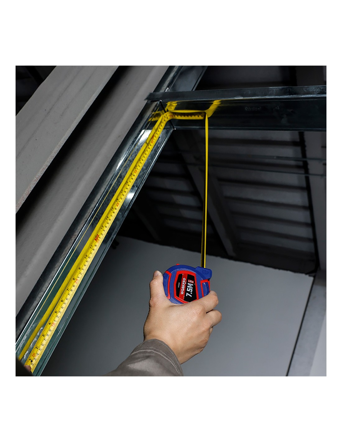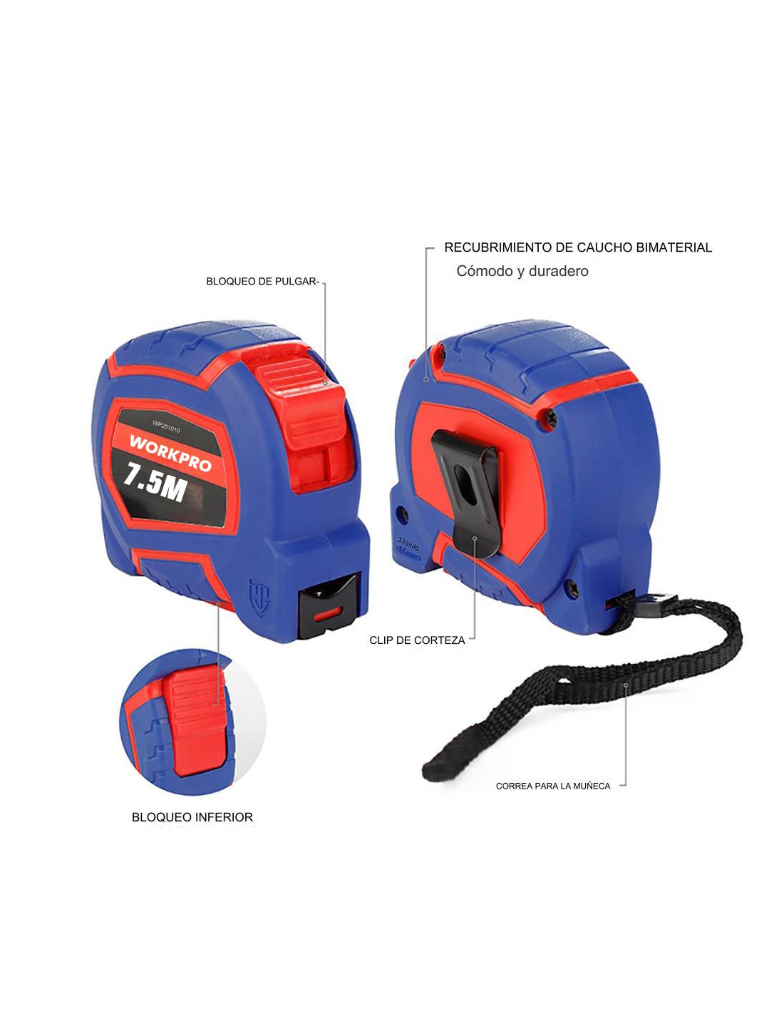 Flexómetro 7,5 m x 25 mm. con hoja revestida de nylon. escalas métricas e imperiales. resorte tratado térmicamente. revestimiento de goma bimaterial, cómodo y duradero. con clip para cinturón y cordón, cómodo de llevar. mecanismo adiccional de bloqueo en la parte inferior. carcasa ergonomica, azul y rojo