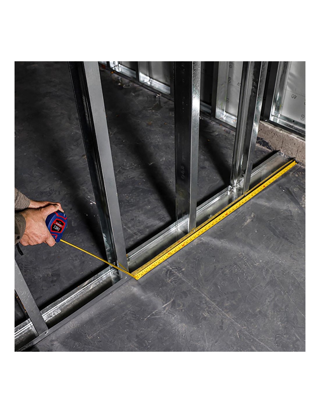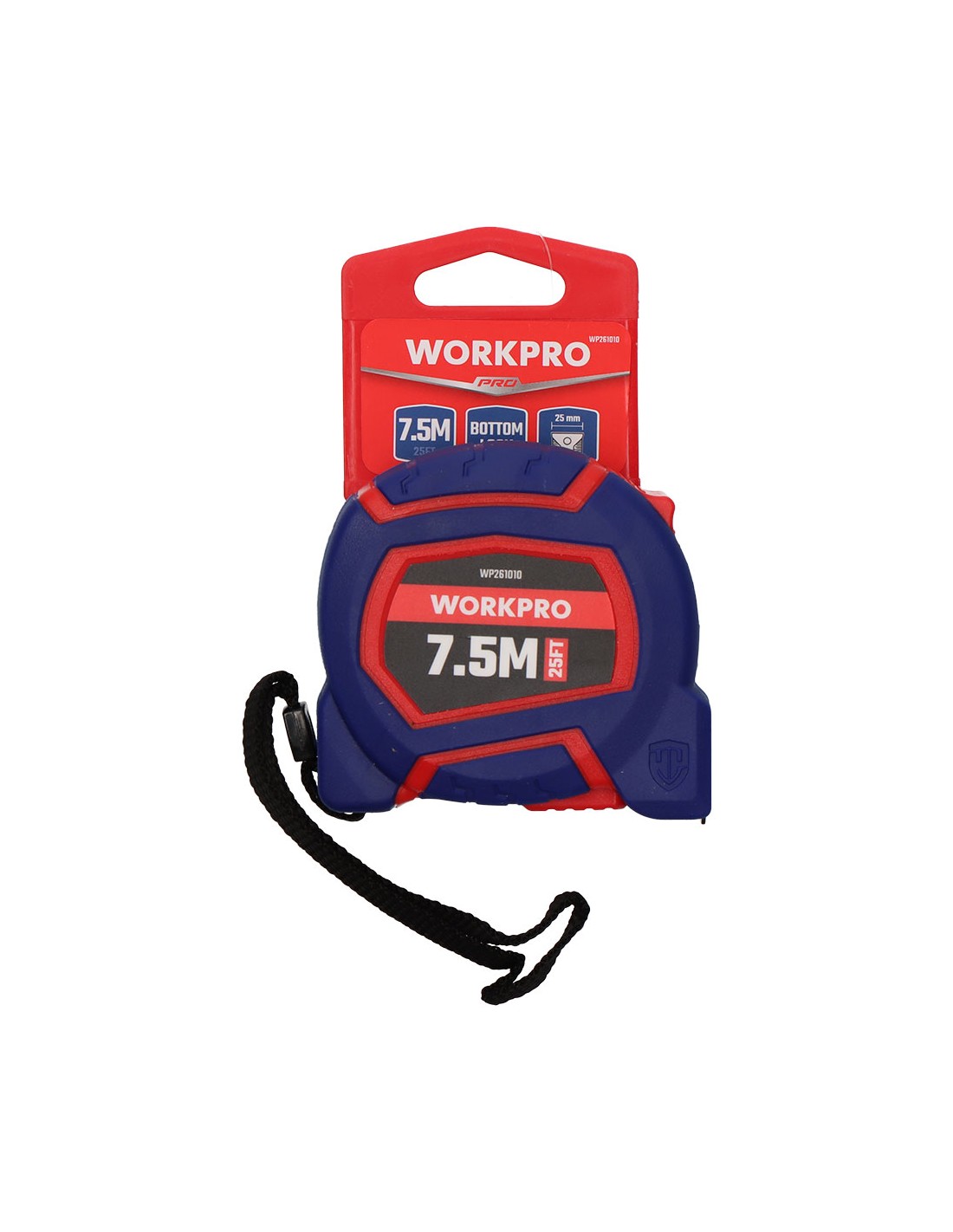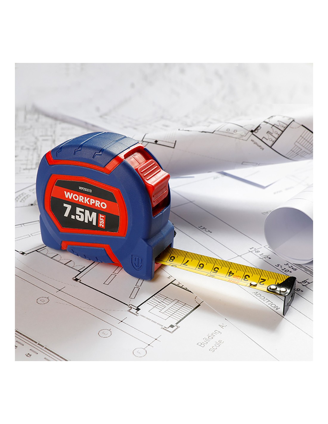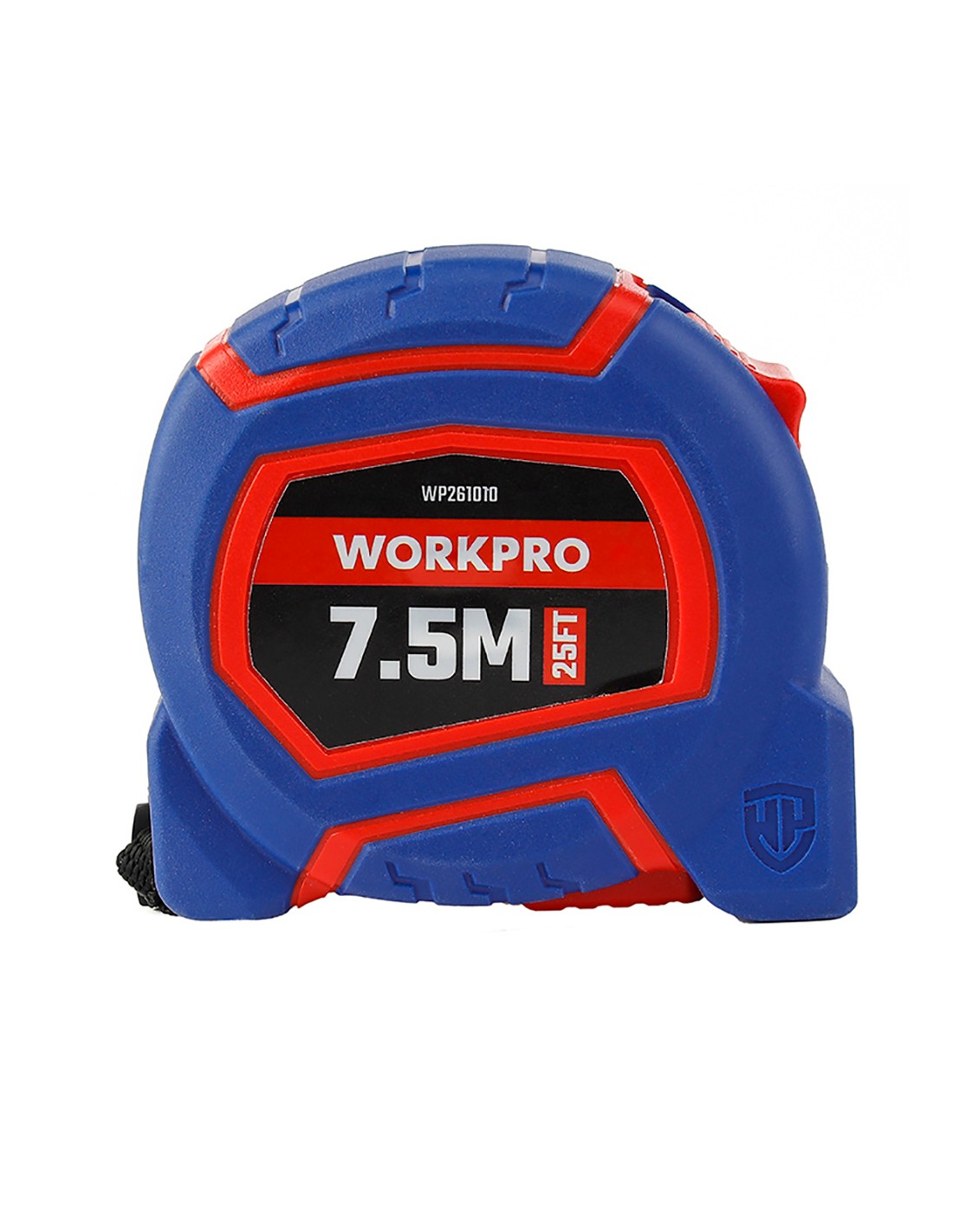 Flexómetro 7,5 m x 25 mm. con hoja revestida de nylon. escalas métricas e imperiales. resorte tratado térmicamente. revestimiento de goma bimaterial, cómodo y duradero. con clip para cinturón y cordón, cómodo de llevar. mecanismo adiccional de bloqueo en la parte inferior. carcasa ergonomica, azul y rojo