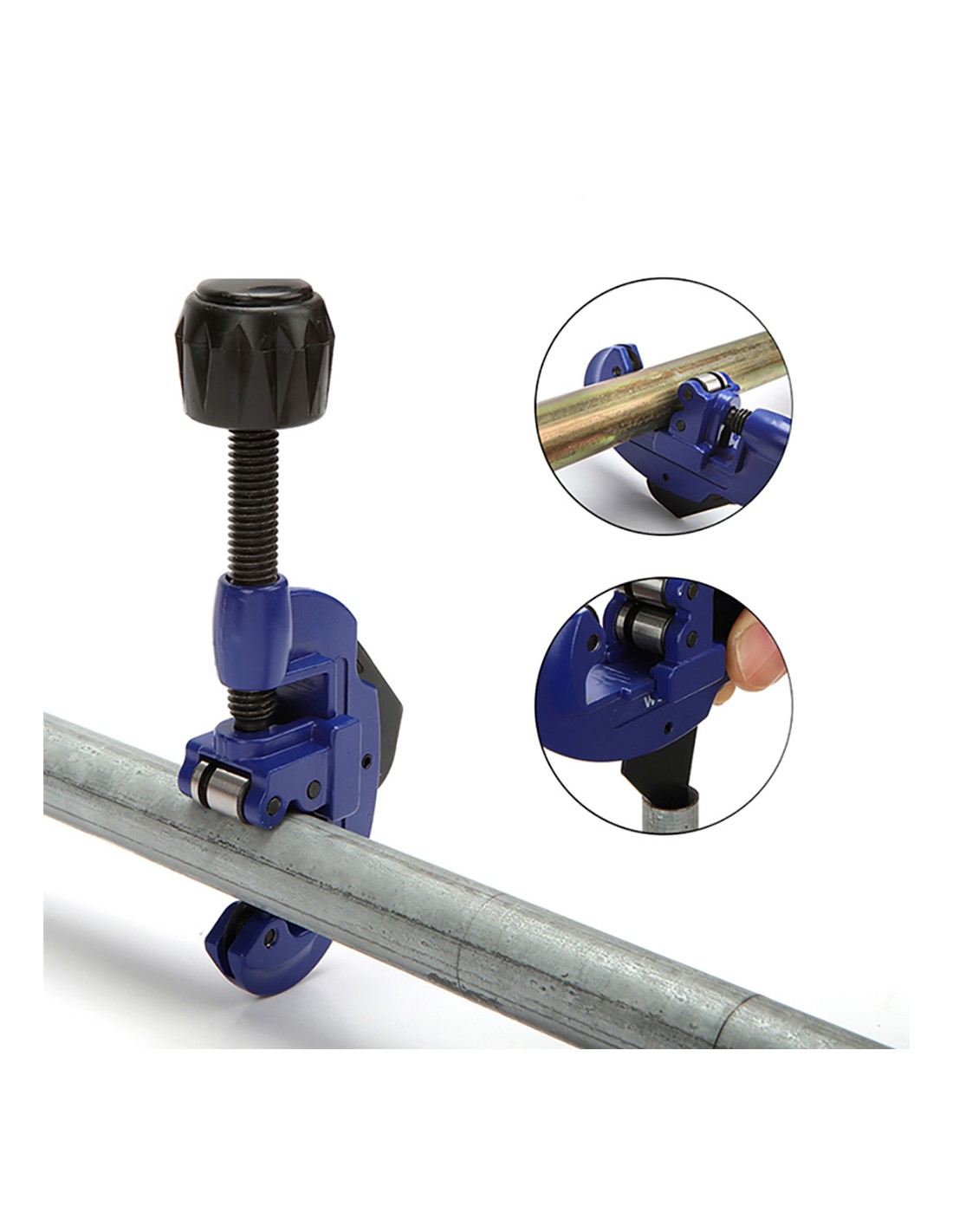 Cortatubos de 3 - 30 mm (1/8-1-1/8"). ideal para tubos de cobre y aluminio. hoja de acero duradera. construcción de aleación de zinc. rueda de corte adicional almacenada en el mango. hoja desbarbadora retráctil para eliminar rebabas internas. capacidad de corte: diámetro exterior 1/8" - 1-1/8" (3-30 mm). azul.