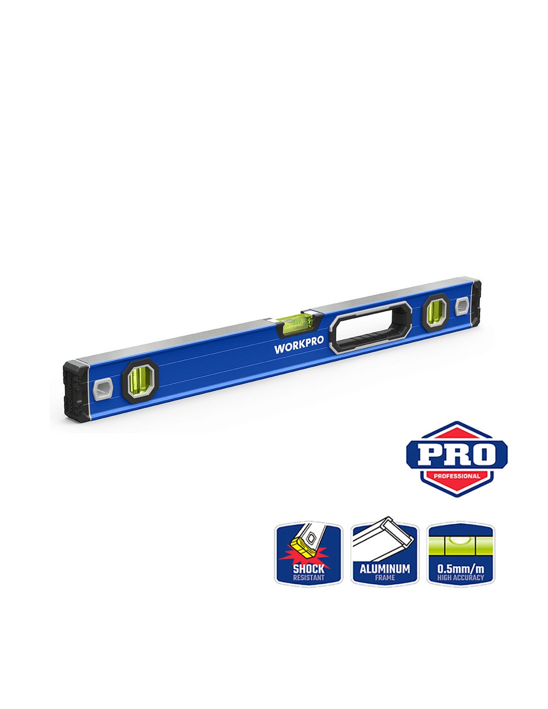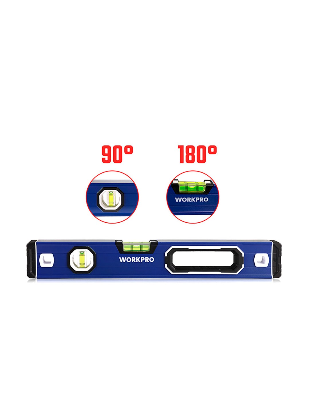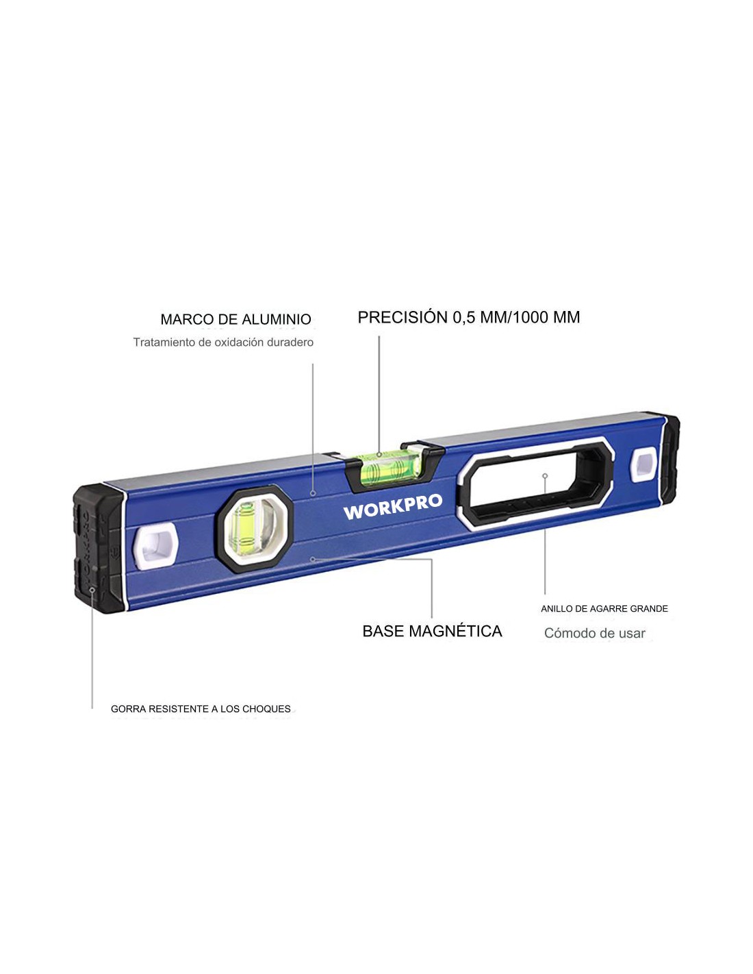 Nivel de burbuja con base mágnetica 40 cm pro. contera a prueba de golpes. anillo de agarre grande, cómodo de usar. aleación de aluminio con tratamiento de oxidación duradero. precisión: 0,5 mm/1 m, 2 viales (/90°/180°). la ranura en forma de v es adecuada para superficies redondas y de tuberías. con agujero para colgar. azul