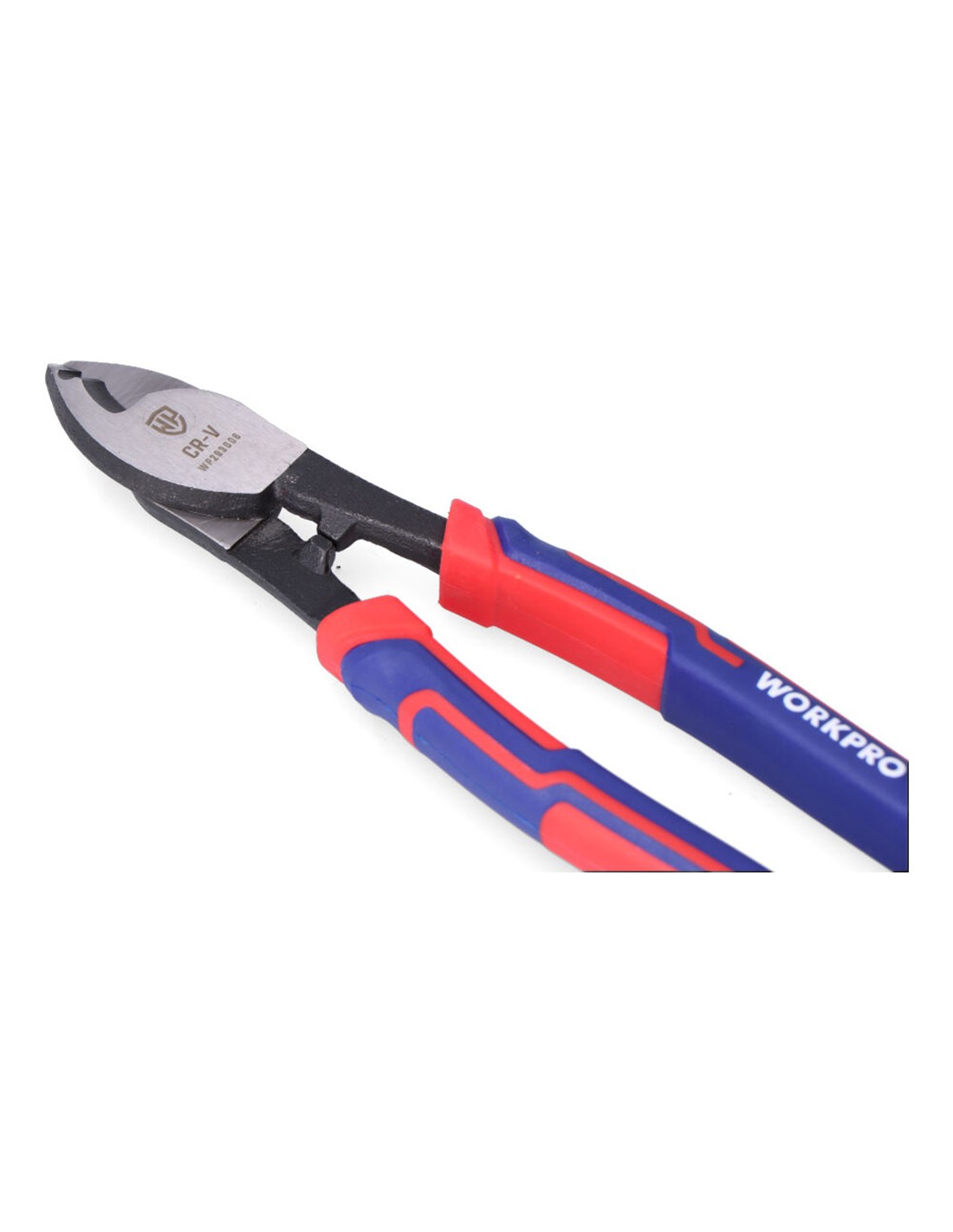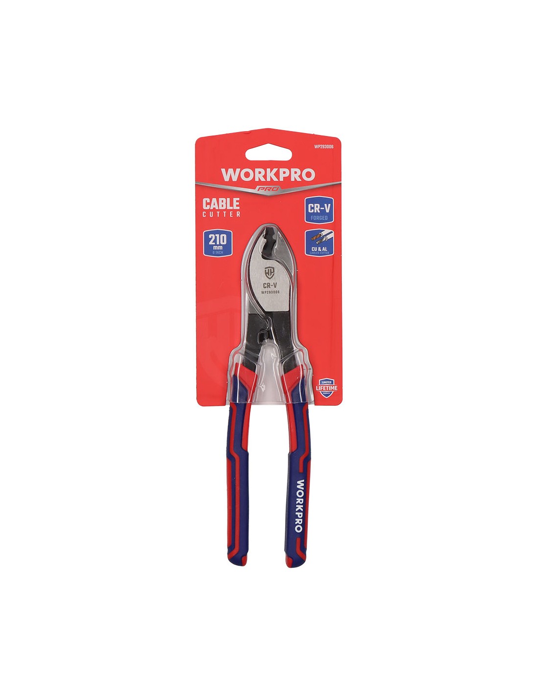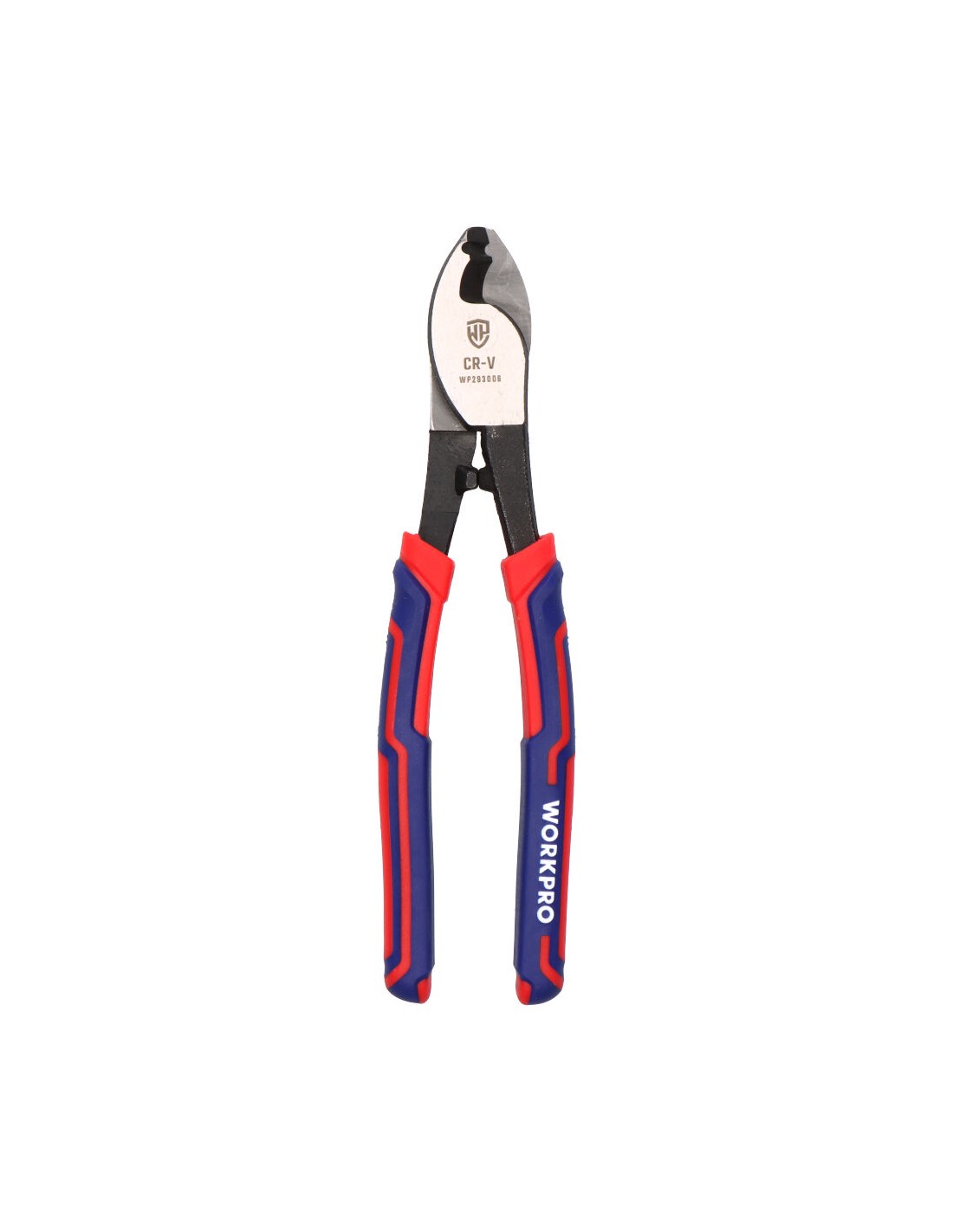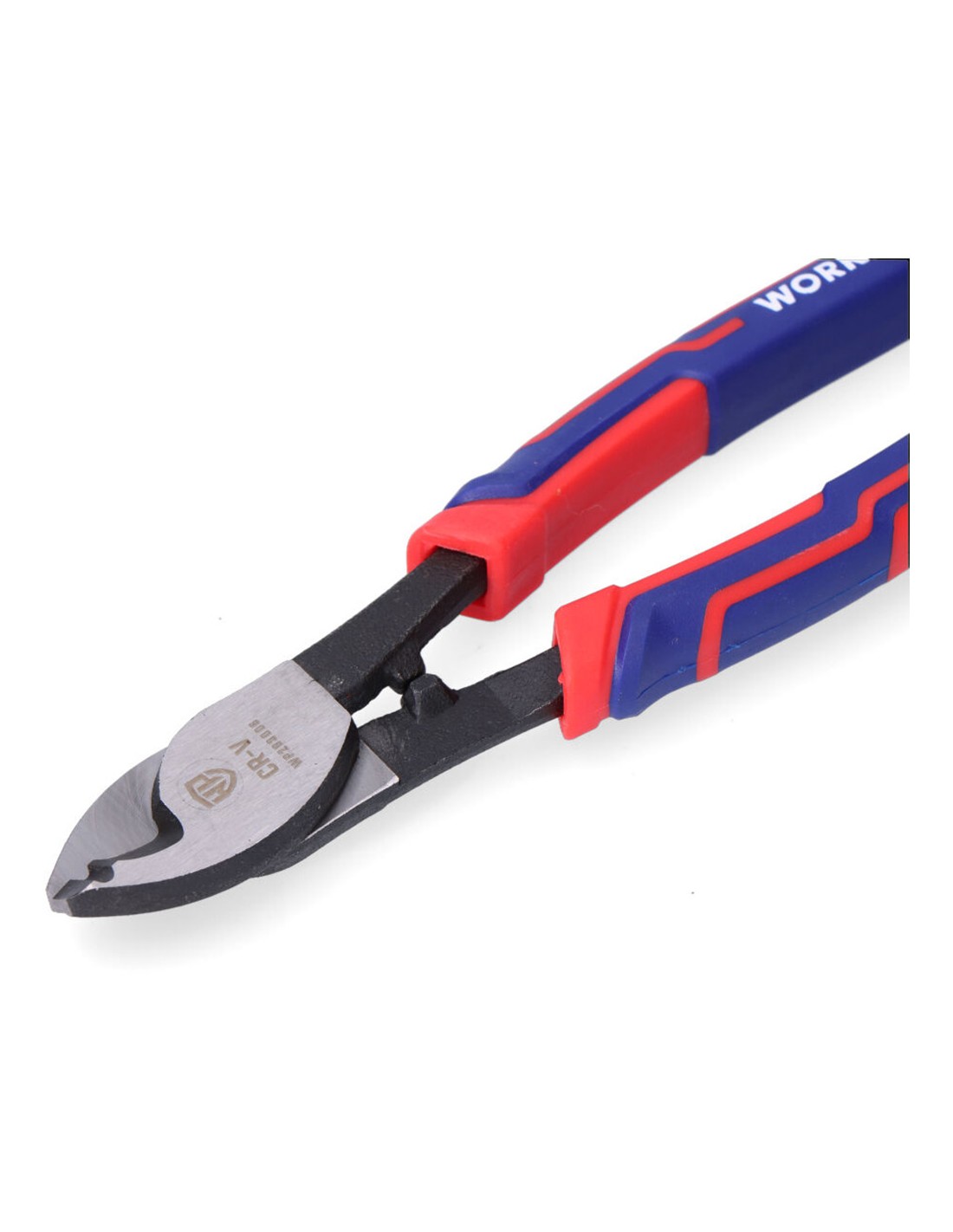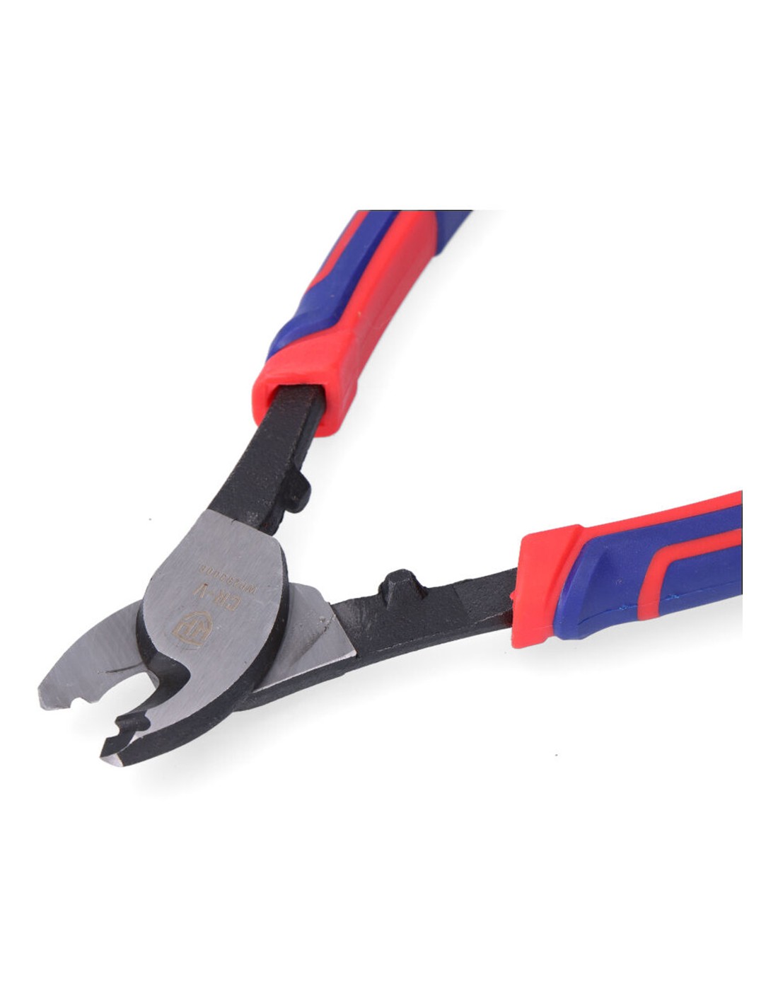 Tijera cortacable 210 mm. acero cr-v de alta calidad. cabeza ennegrecida y pulida. puede cortar cables de cobre y aluminio de varios hilos no apto para cortar alambres de hierro, alambres de acero y núcleos de cables de acero. mango de agarre cómodo de tres materiales