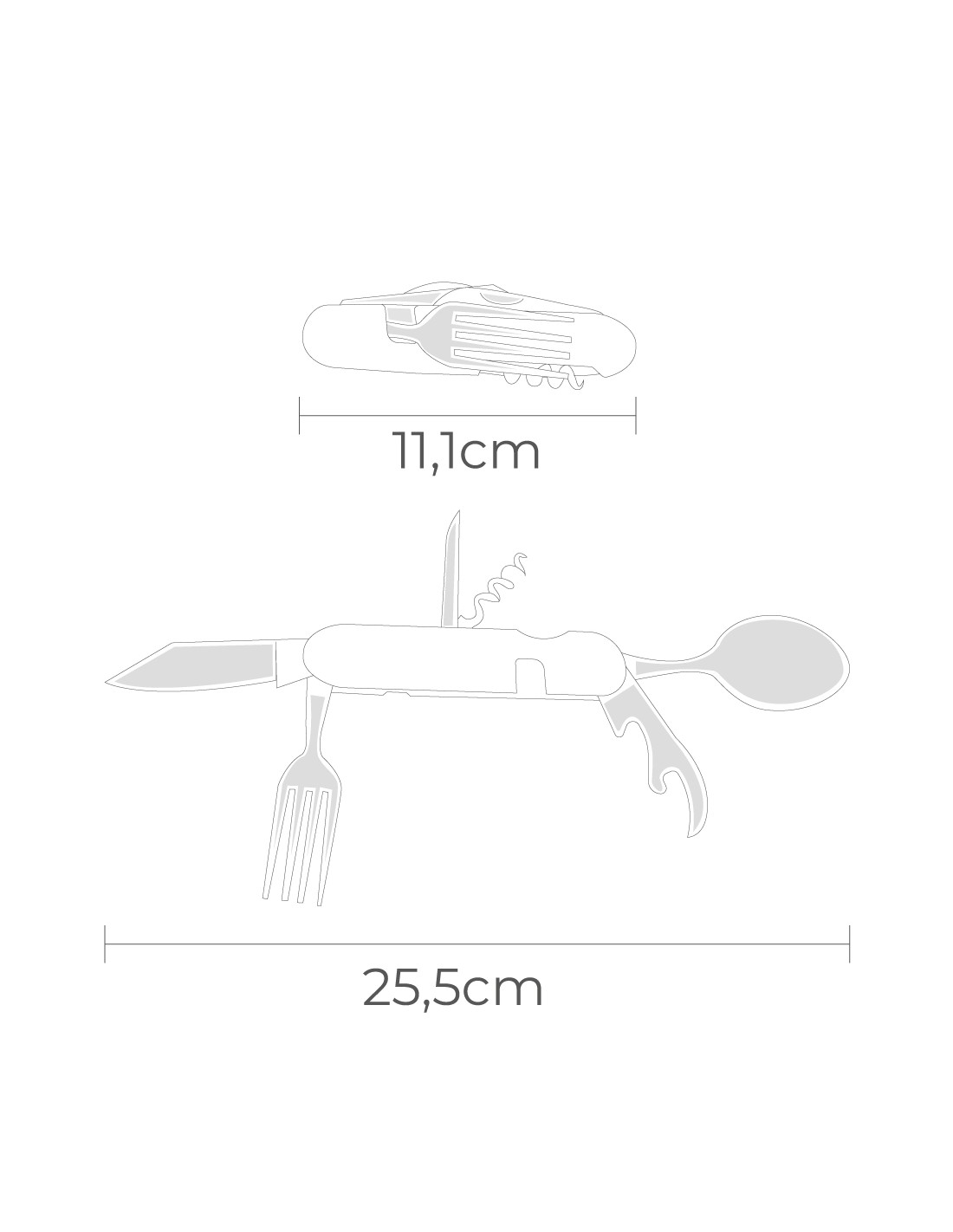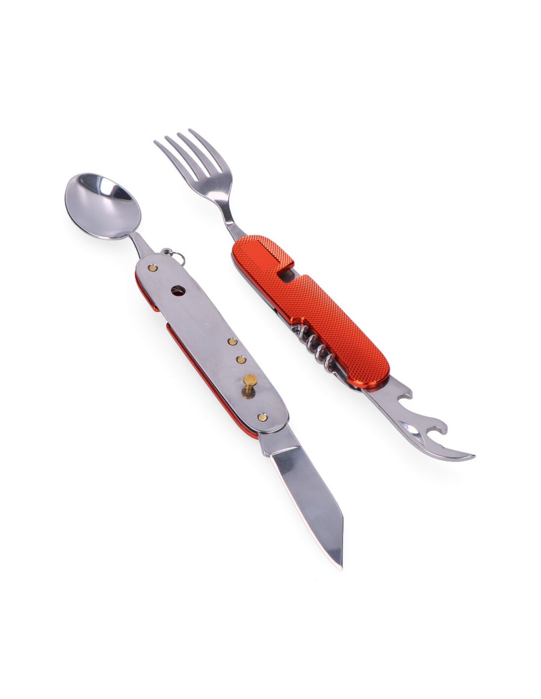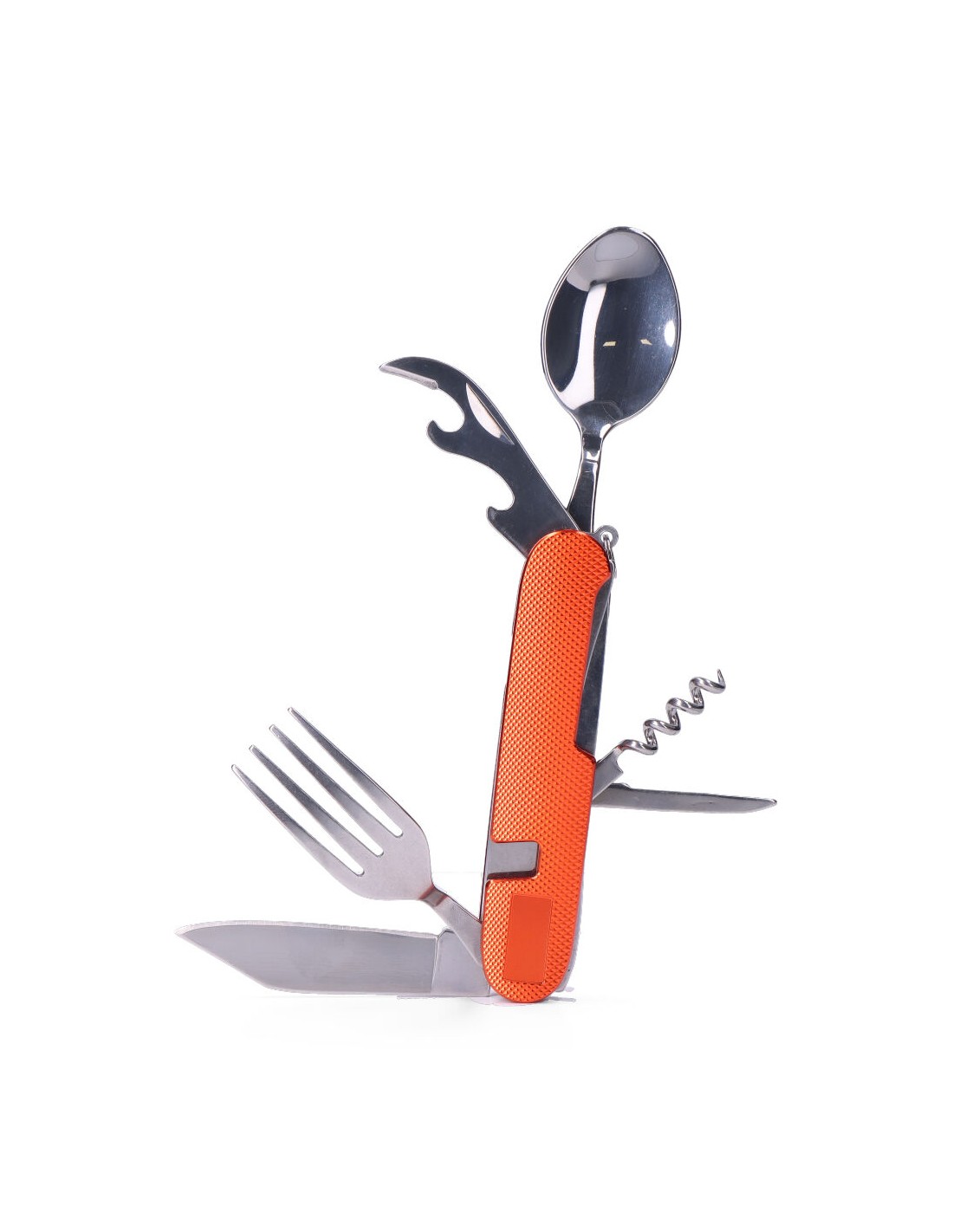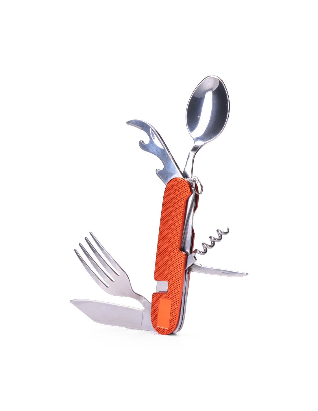 Multiherramienta navaja + cubiertos, con mango de aluminio, hoja de acero inoxidable 420, incluye estuche de nylon y enganche para cinturón, consta de 7 funciones: cuchara, tenedor, cuchillo, abrelatas, abrebotellas, perforador y sacacorchos, serie aconcagua.se divide en dos para poder utilizar la cuchara/navaja y el tenedor por separado