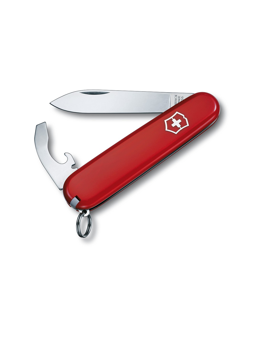 Navaja bantam roja de bolsillo, cuenta con 8 funciones: hoja grande, anilla, destapador, abrelatas, destornillador 5mm, pelacables, palillo y pinzas. acero inox. medida 23 x 11 x 84 mm, peso 33g