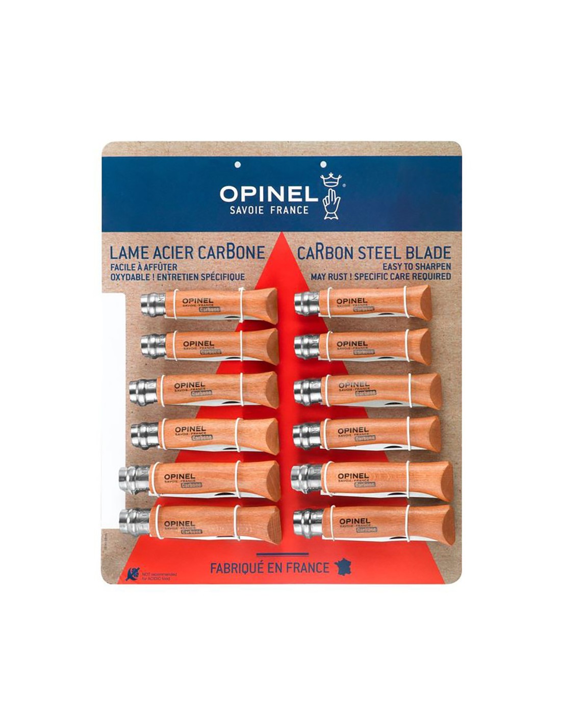 Expositor navajas opinel acero al carbono, 12 uds, contiene cuatro unidades de cada numero: n6 acero al carbono, hoja 7 cm, n7 acero al carbono, hoja 8 cm y n8 acero al carbono, hoja 8,5 cm