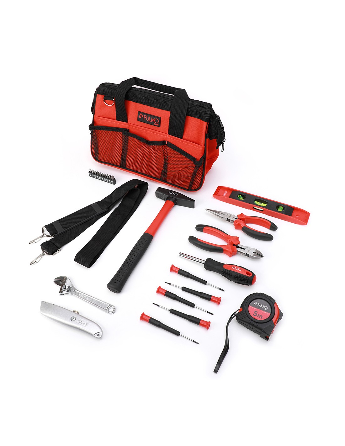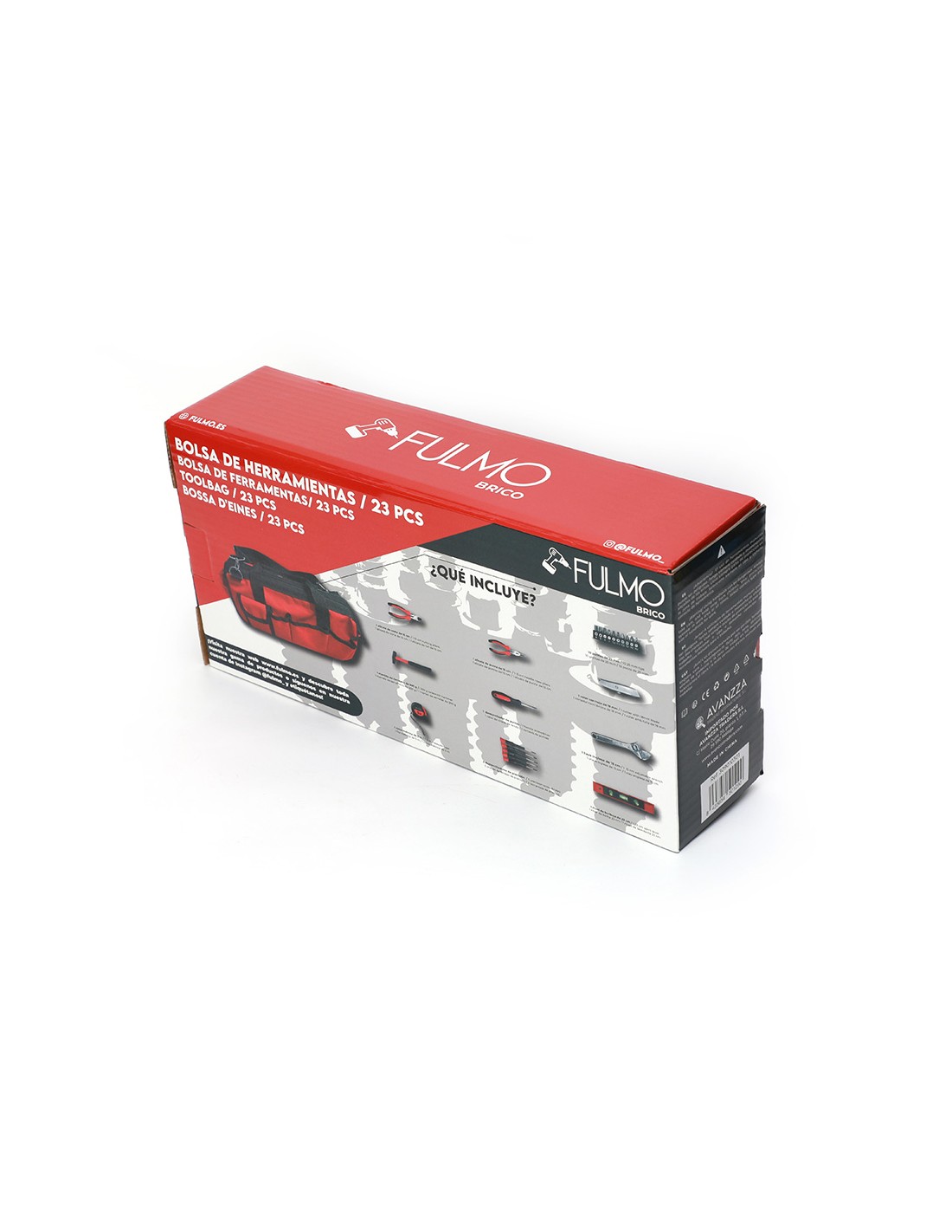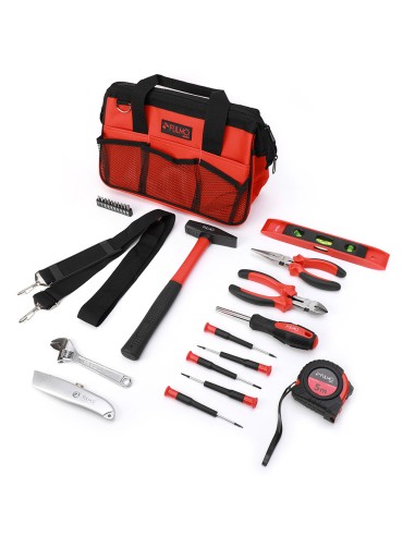 Conjunto de herramientas de 23 piezas que incluye: un alicate de corte de 15 cm un alicate de punta de 15 cm una llave inglesa de 15 cm cinco destornilladores de precisión sl2.0 - sl2.5 - sl3 - ph00 - ph0 un nivel de burbuja de 23 cm un martillo de cerrajero de 300g un cúter con hoja de 18 mm un destornillador de puntas diez puntas de 25 mm: sl4 - sl5 - ph1 - ph2 - pz1 - pz2 -t15 -t20 - h5 - h6 una cinta mètrica de 5 m y una bolsa de herramientas 32 x 15 x 21 cm de tela oxford 600d