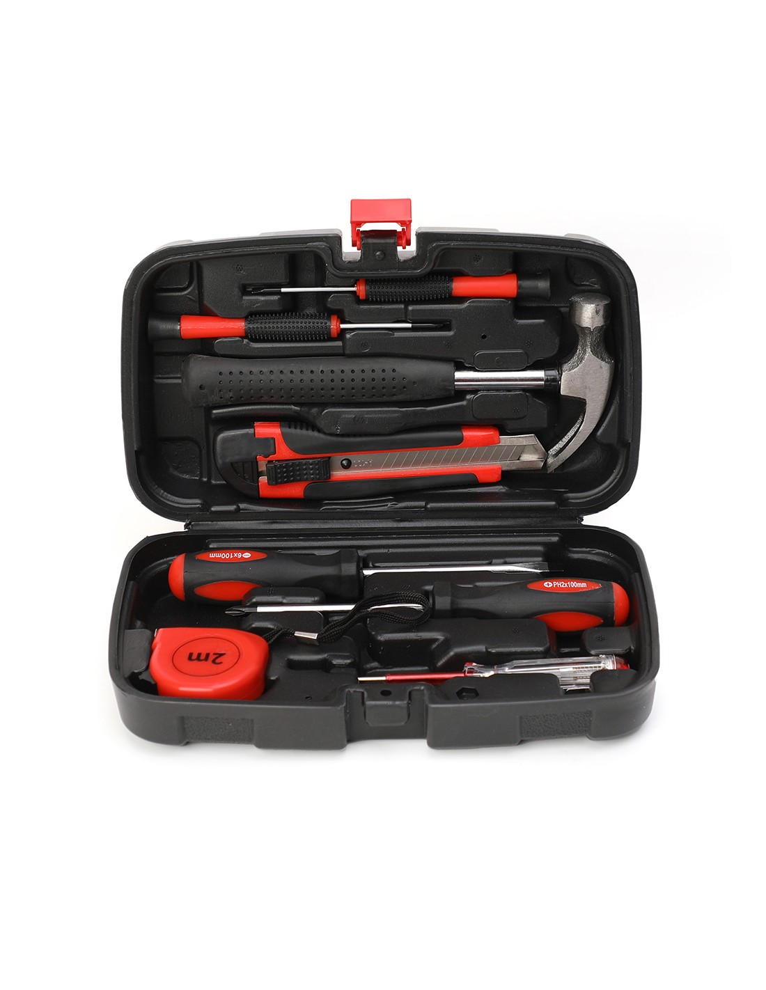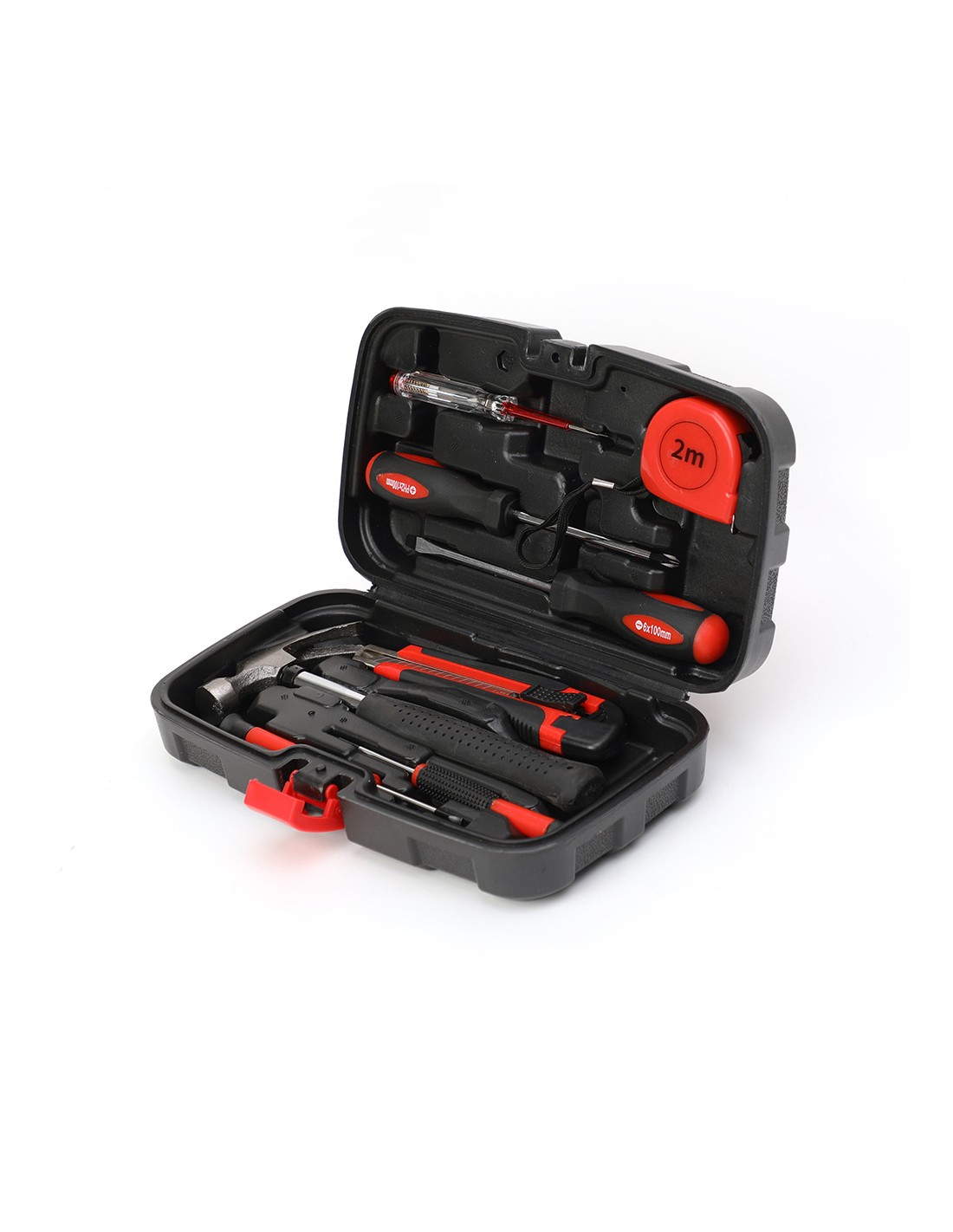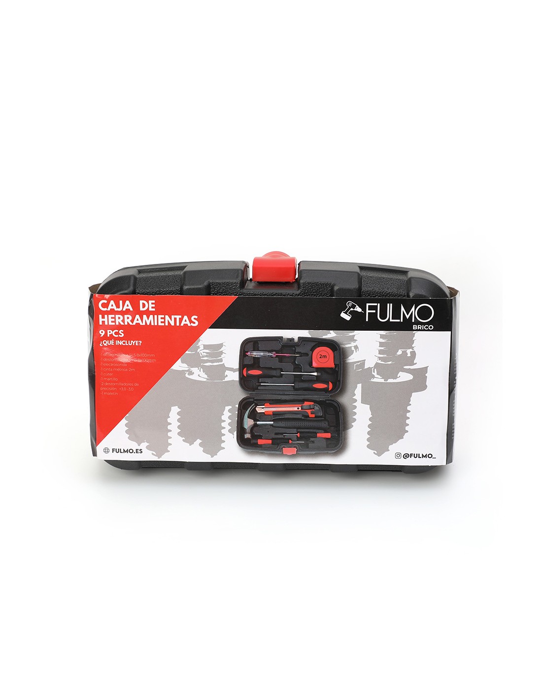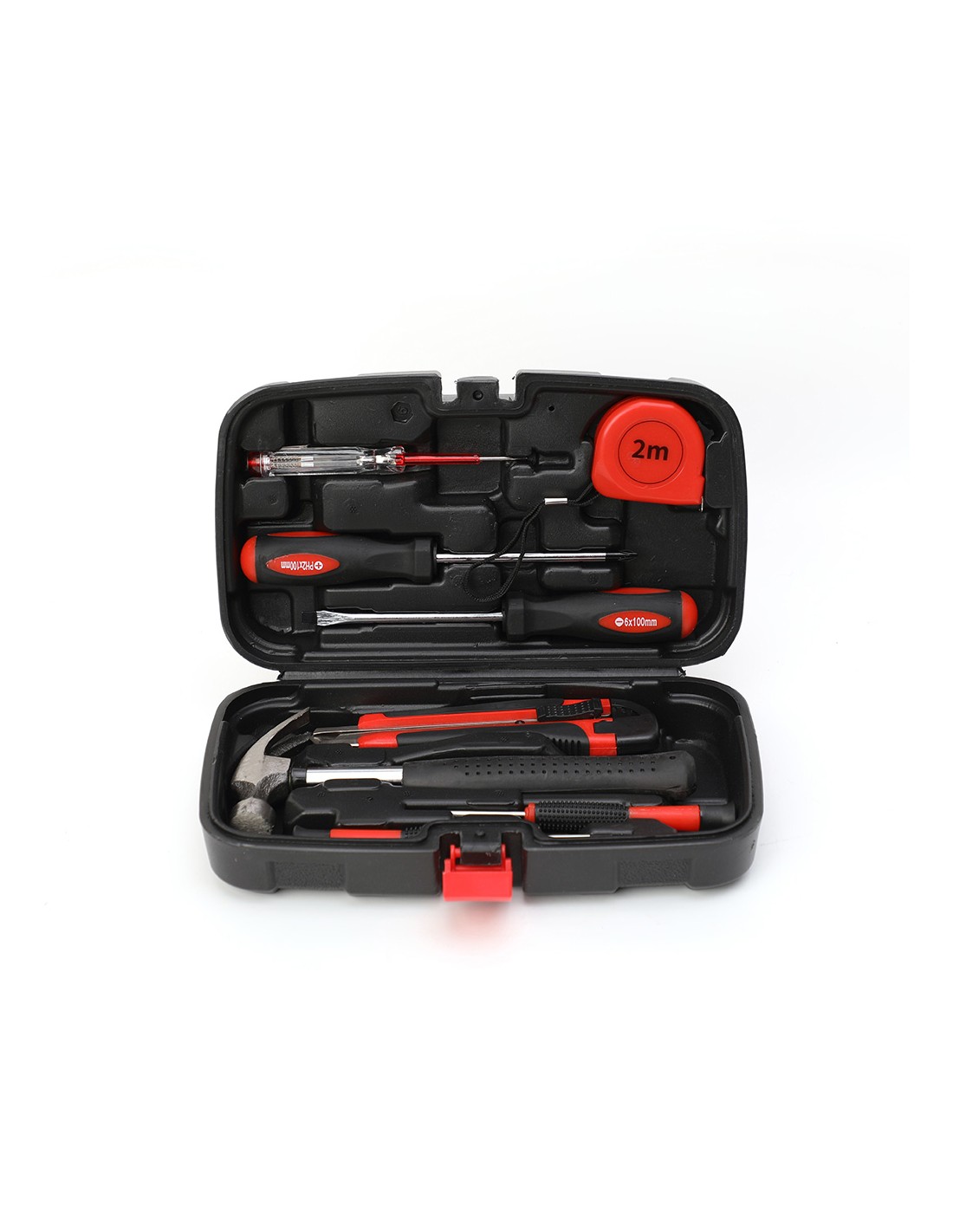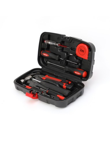 Conjunto de herramientas de 9 piezas que incluye: un destornillador sl5 8 x 100 mm un destornillador ph5 8 x 100 mm un buscapolos una cinta métrica de 2 m un cúter un martillo dos destronilladores de precisión +3,0 -3,0 y un maletín