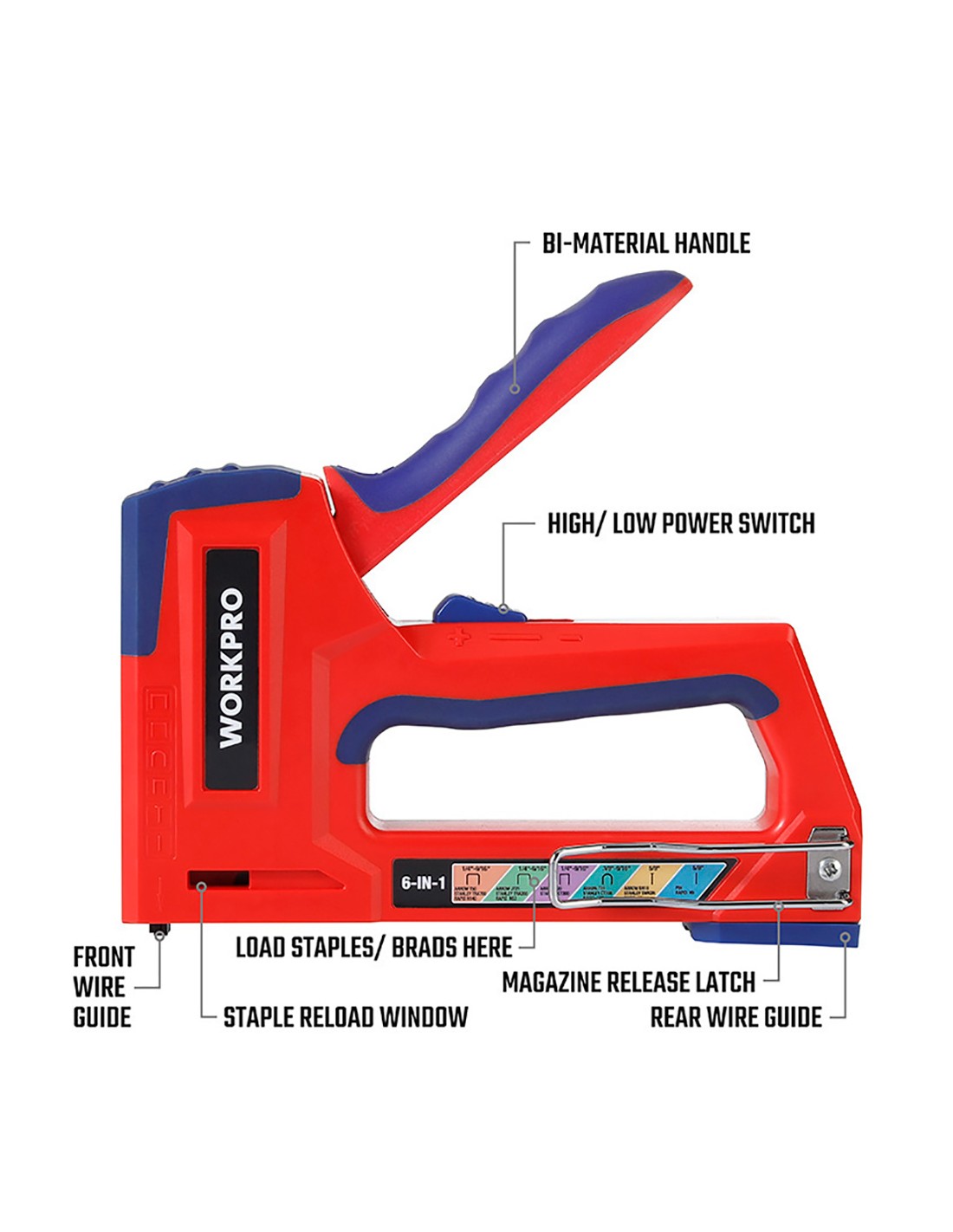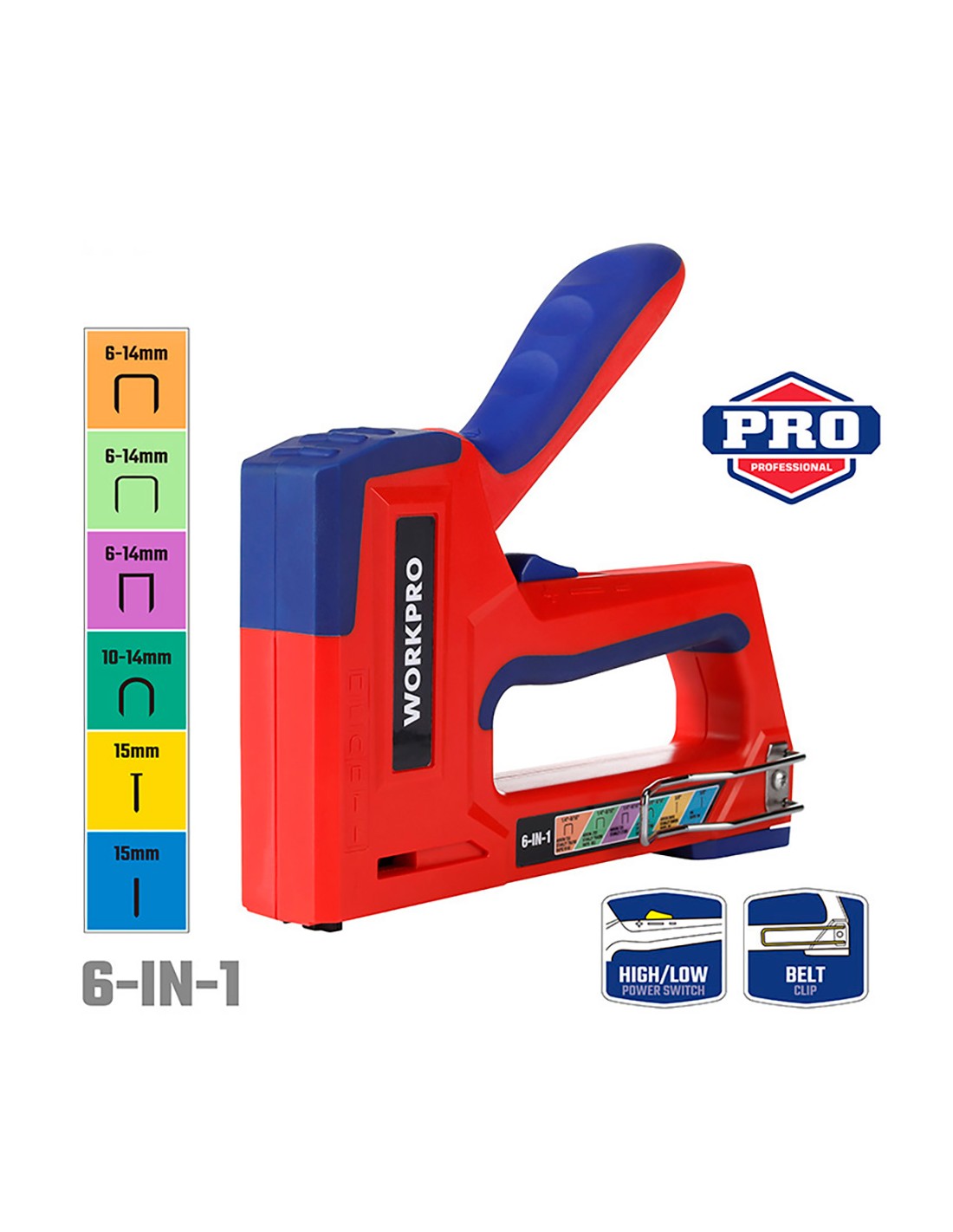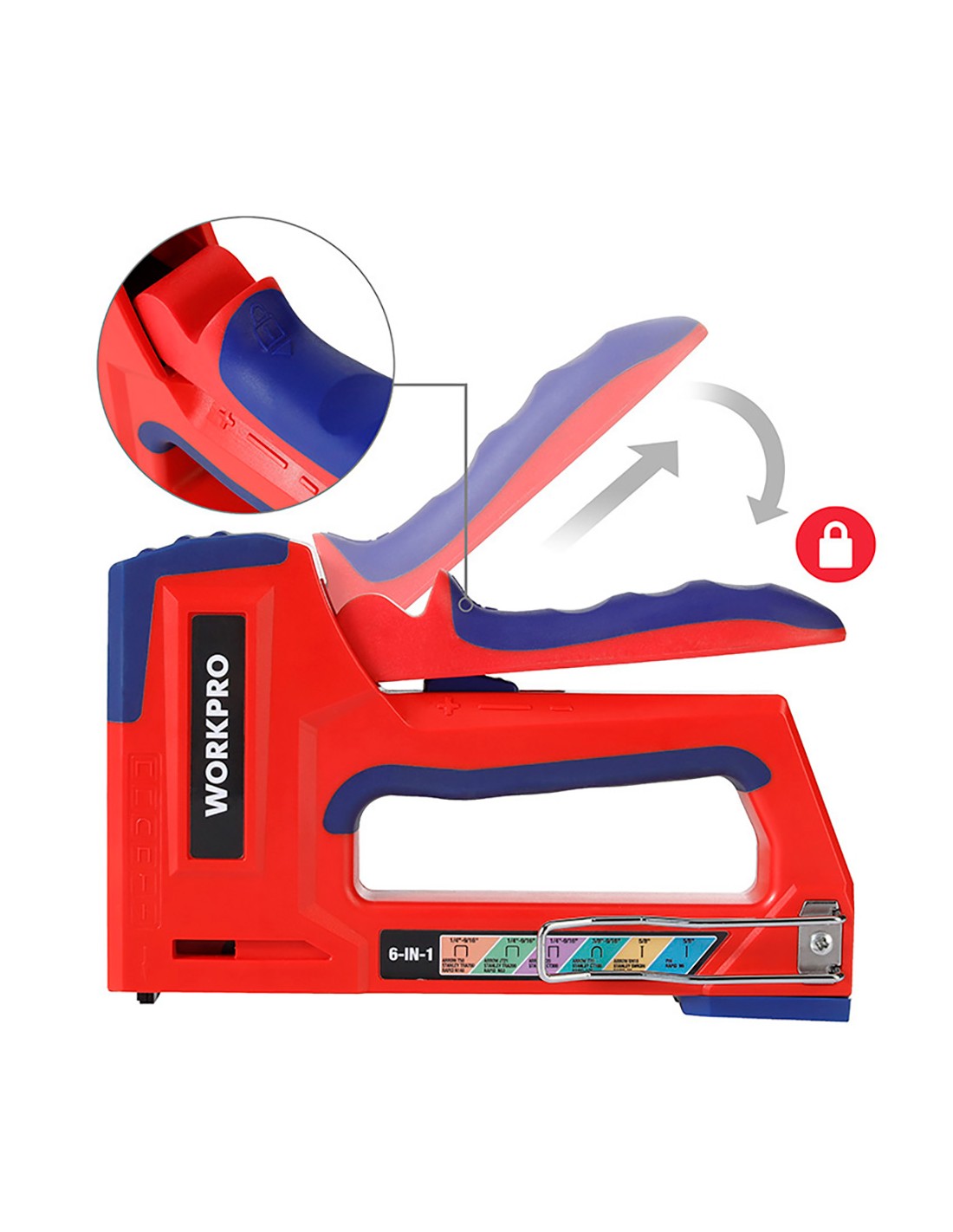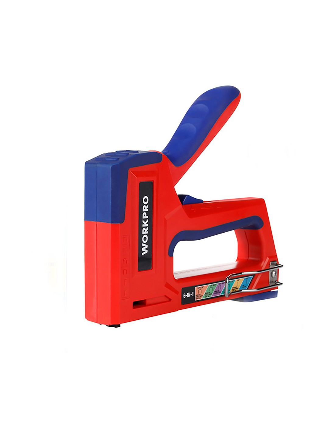 Grapadora 6 en 1 . multifunción 6 en 1, compatible con grapas tipo t21, t50, t25, t20, 18ga y pin. puede satisfacer la mayoría de sus necesidades de fijado sin reemplazar la grapadora. fácil y segura. dos potencias de grapado . diseño ergonómico revestido de goma. azul y rojo