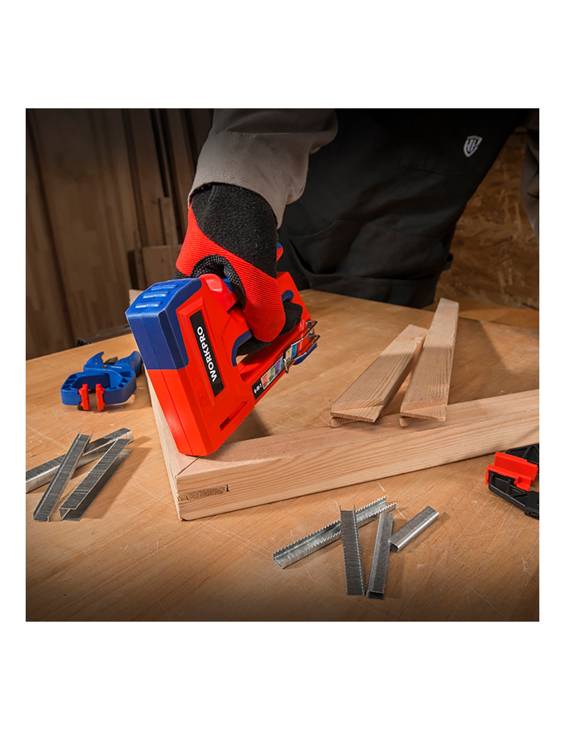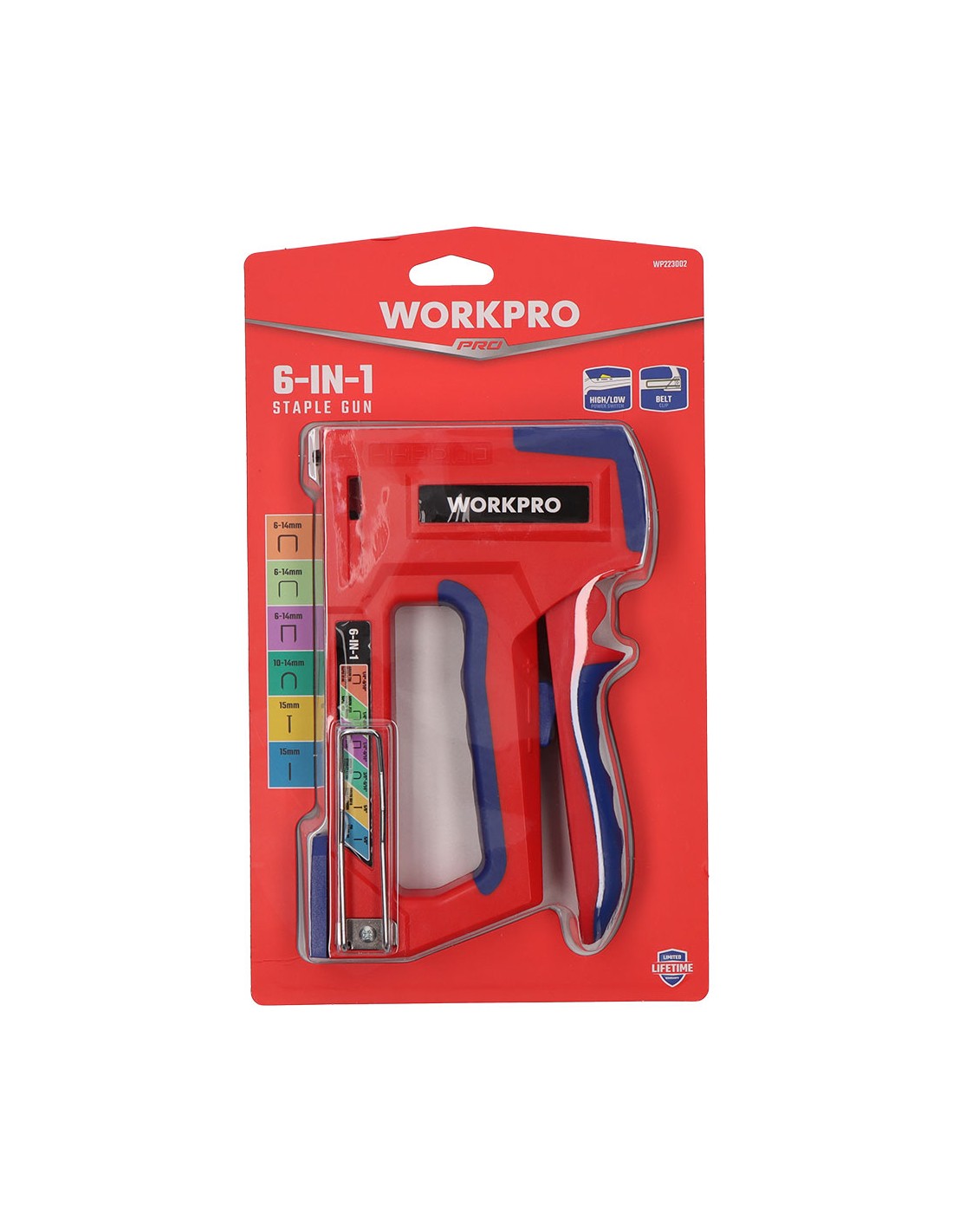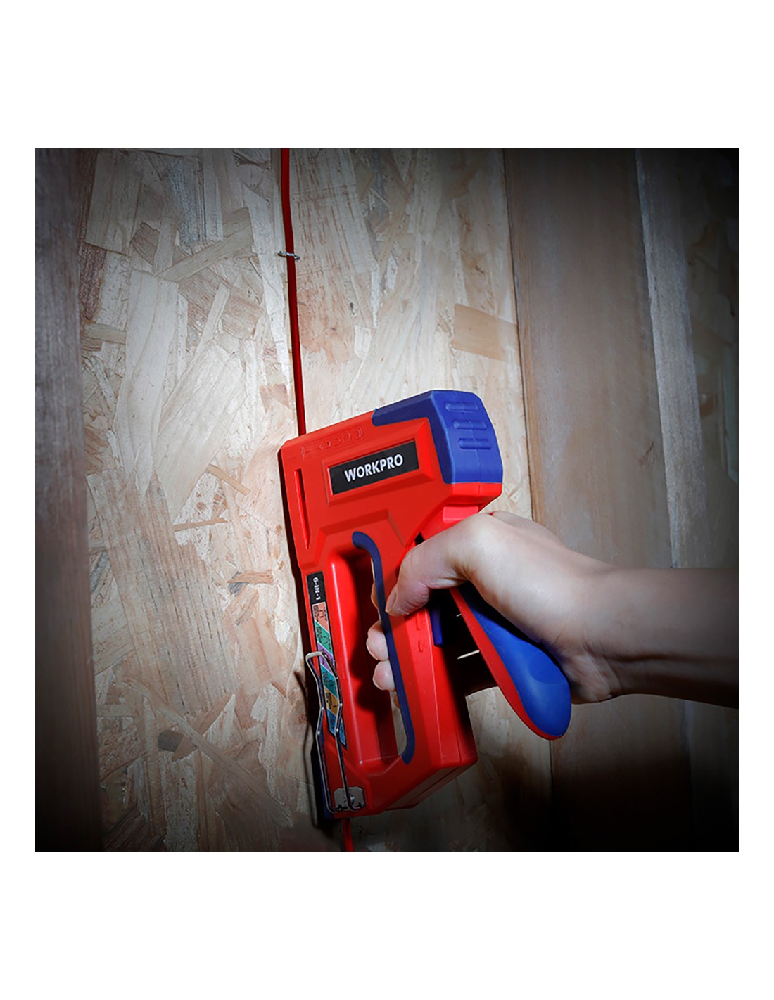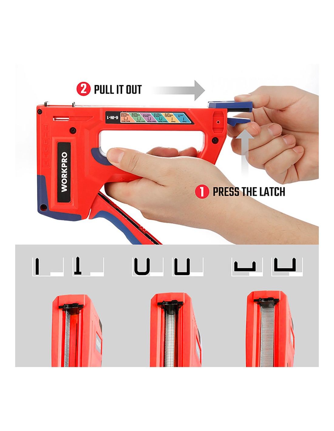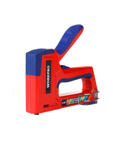 Grapadora 6 en 1 . multifunción 6 en 1, compatible con grapas tipo t21, t50, t25, t20, 18ga y pin. puede satisfacer la mayoría de sus necesidades de fijado sin reemplazar la grapadora. fácil y segura. dos potencias de grapado . diseño ergonómico revestido de goma. azul y rojo