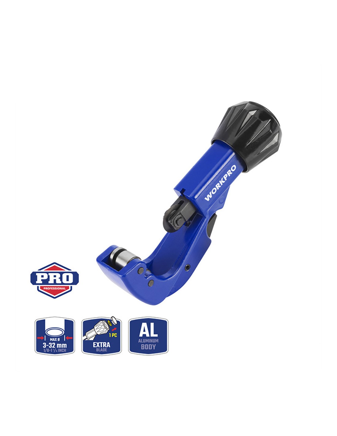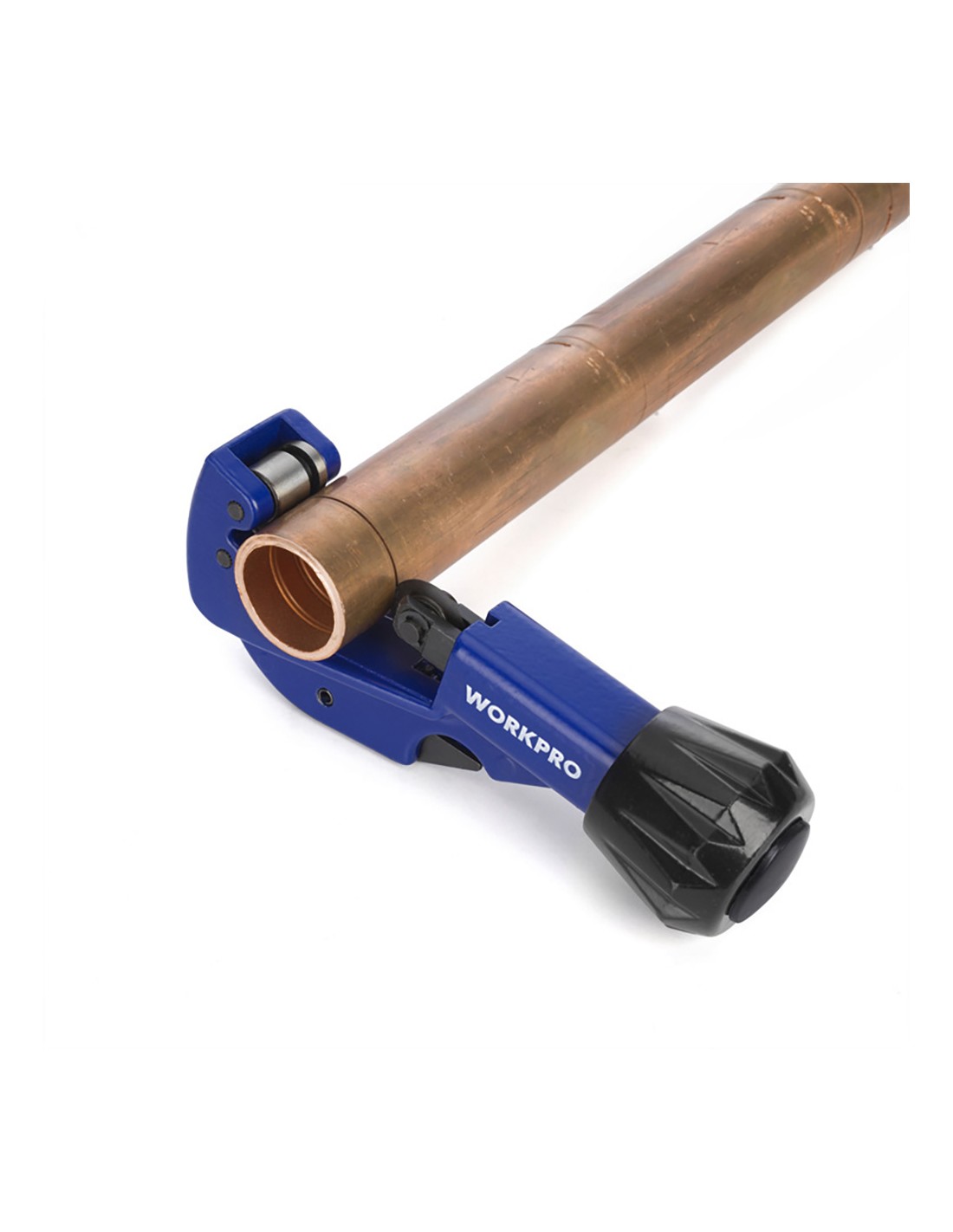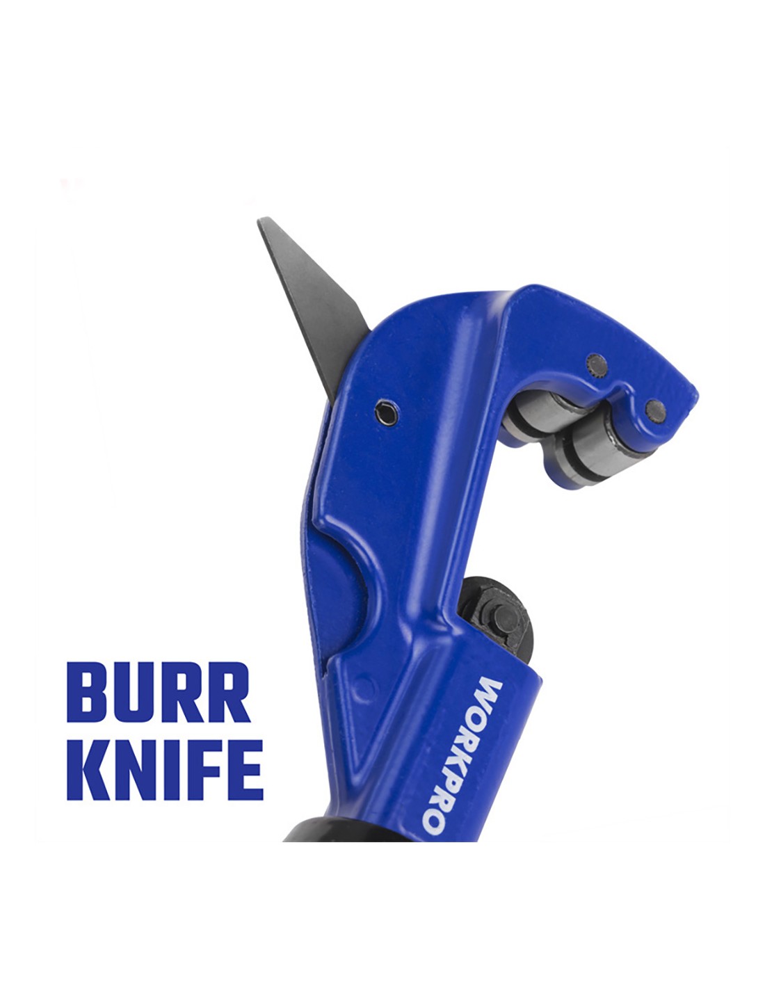 Cortatubos de 3 - 32 mm (1/8" - 1 1/4") . ideal para tubos de cobre y aluminio. hoja de acero duradera. construcción de aleación de zinc. rueda de corte adicional almacenada en el mango. hoja desbarbadora retráctil para eliminar rebabas internas. capacidad de corte: diámetro exterior 1/8" - 1 1/4" (3-32 mm). azul