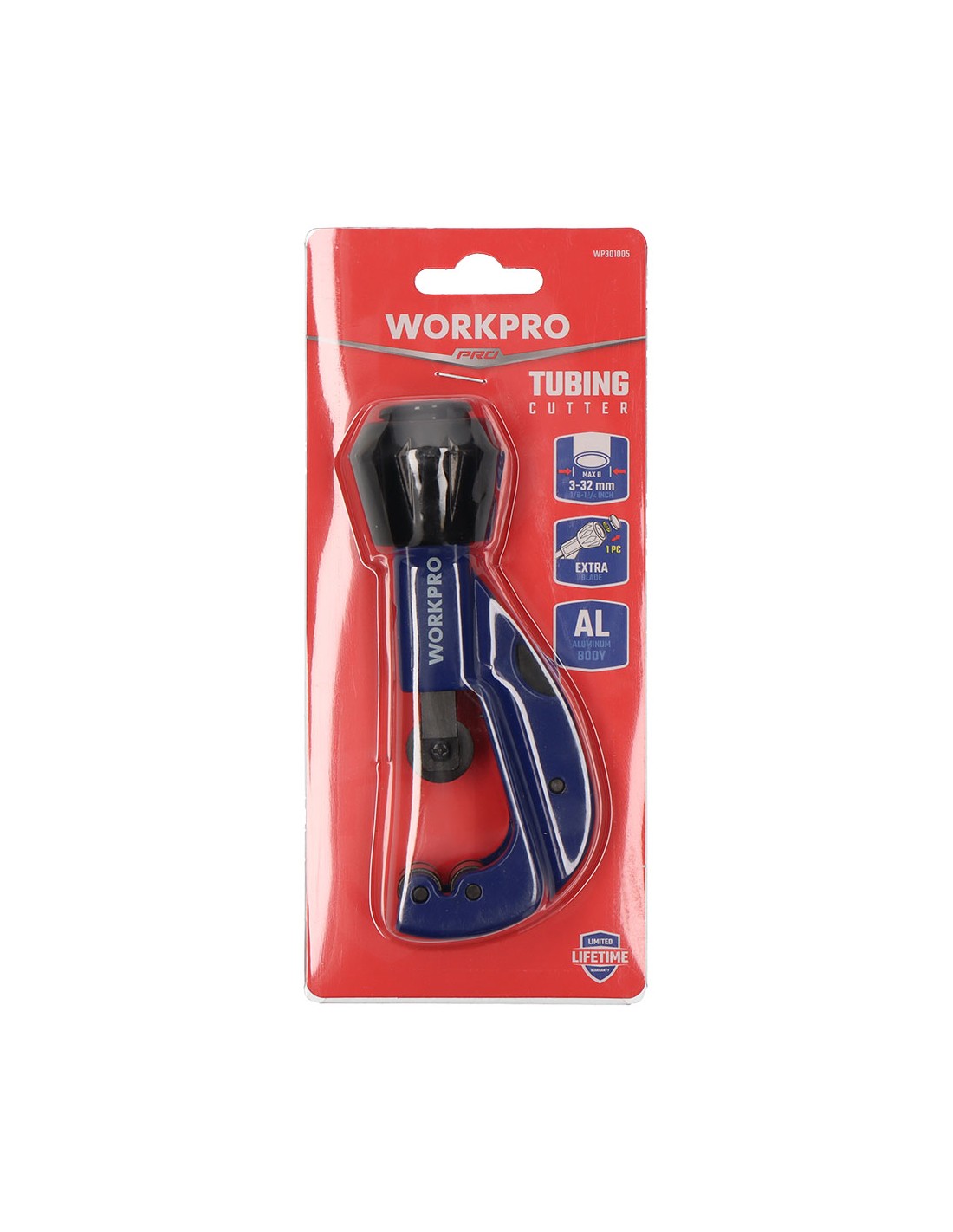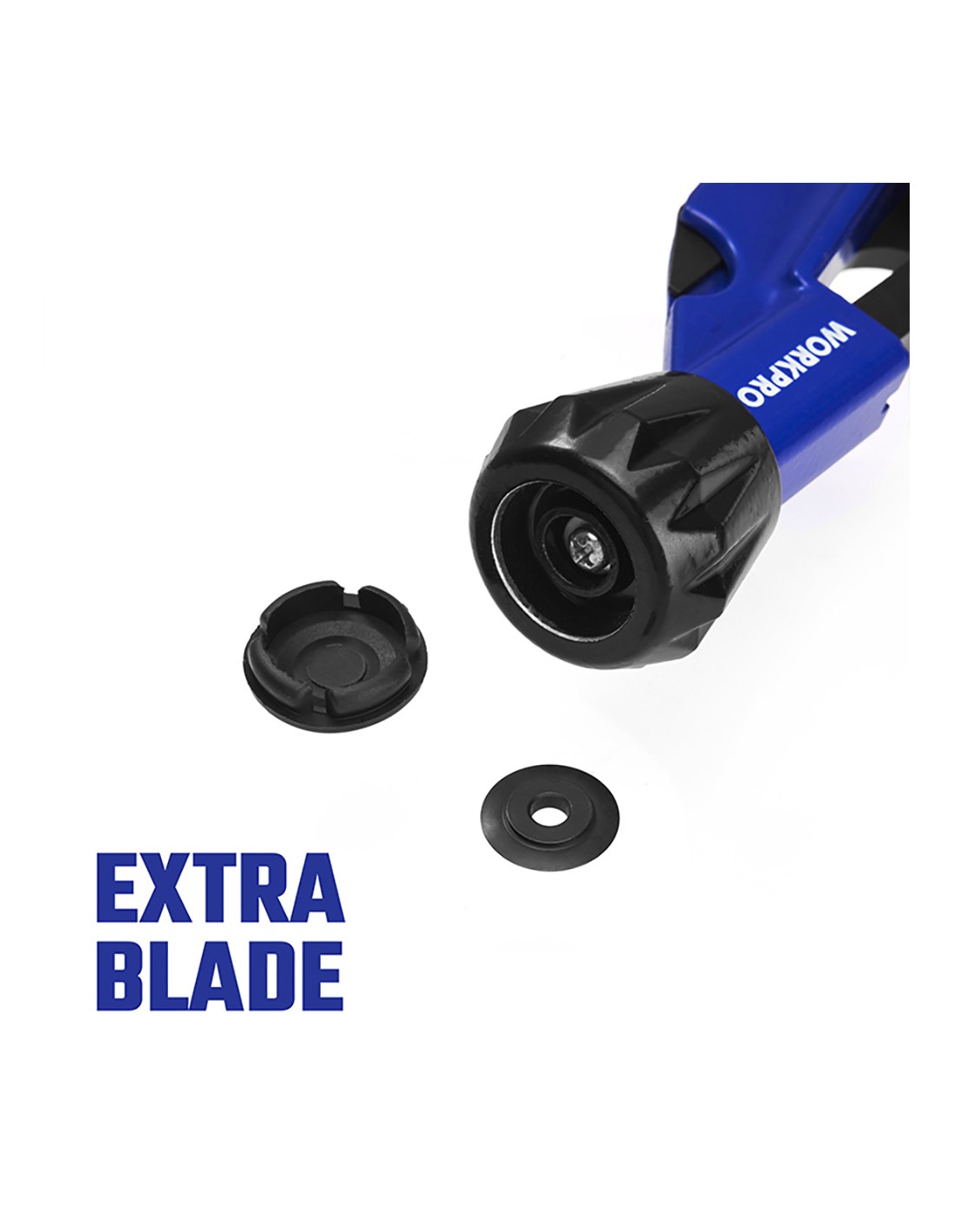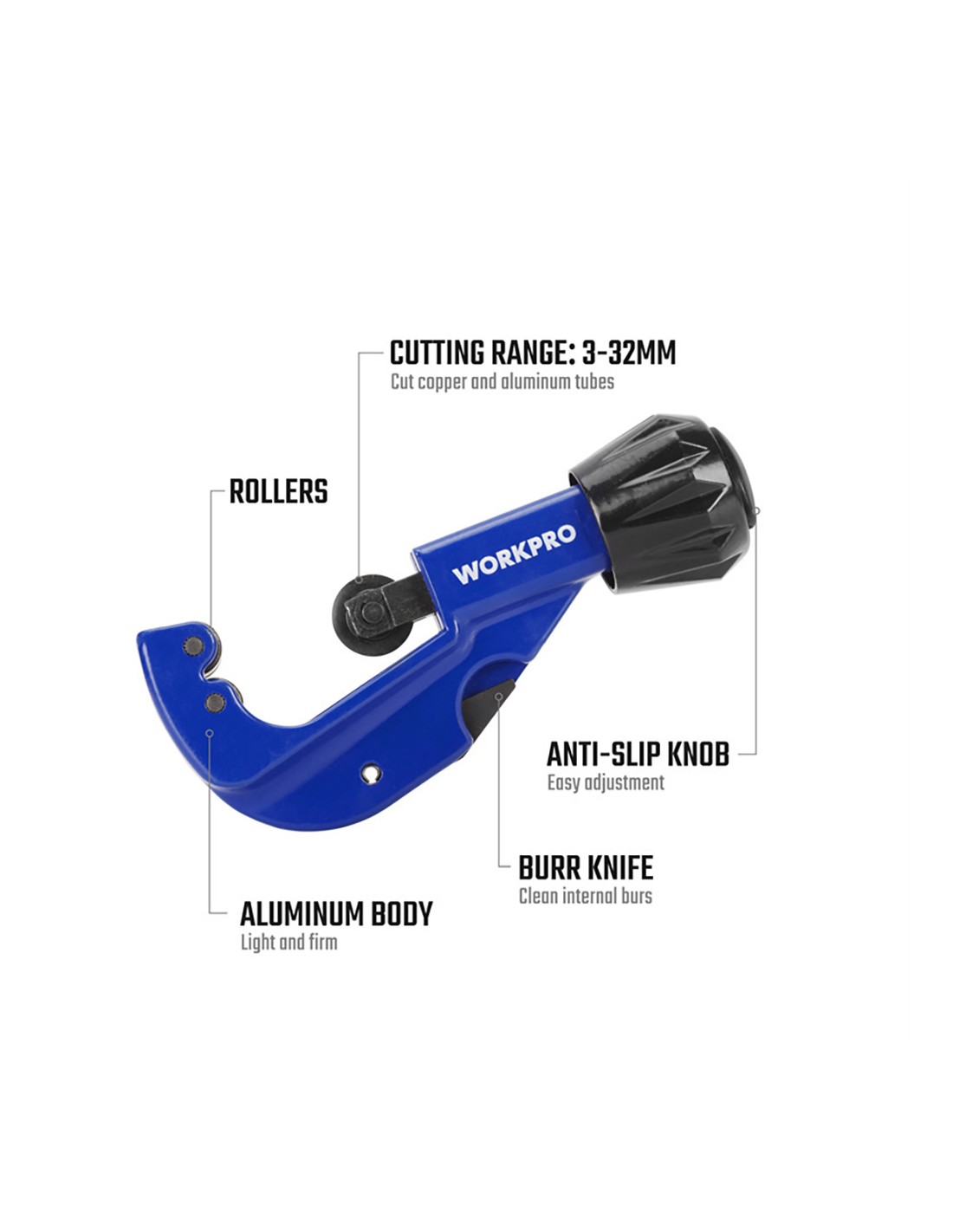 Cortatubos de 3 - 32 mm (1/8" - 1 1/4") . ideal para tubos de cobre y aluminio. hoja de acero duradera. construcción de aleación de zinc. rueda de corte adicional almacenada en el mango. hoja desbarbadora retráctil para eliminar rebabas internas. capacidad de corte: diámetro exterior 1/8" - 1 1/4" (3-32 mm). azul