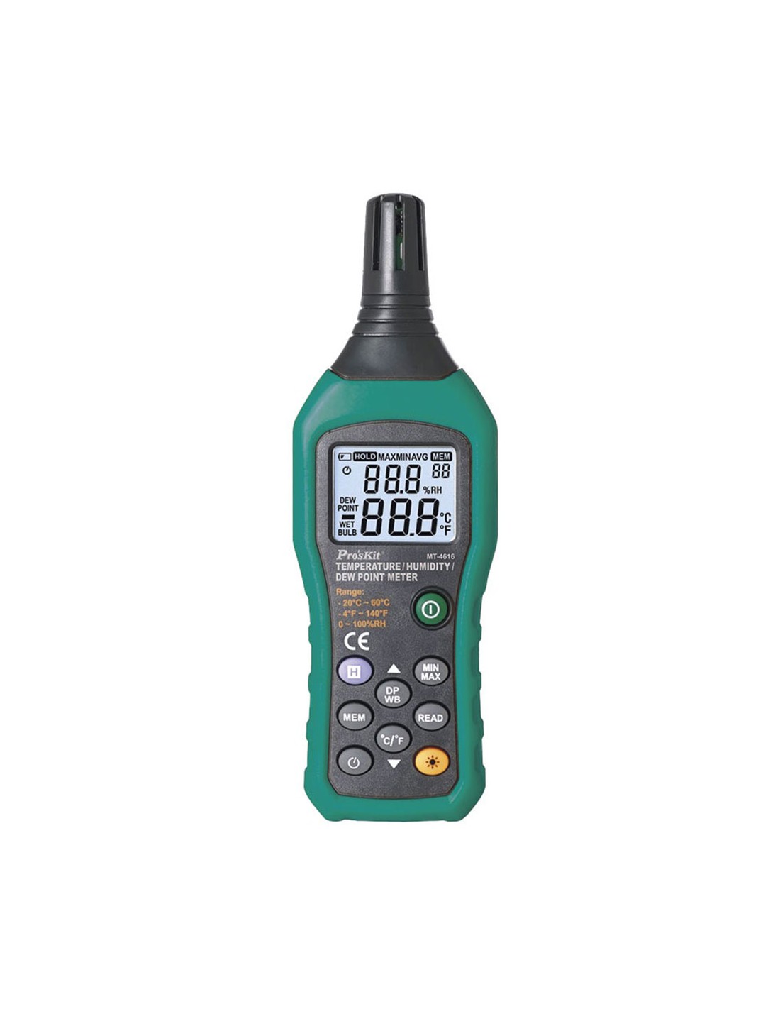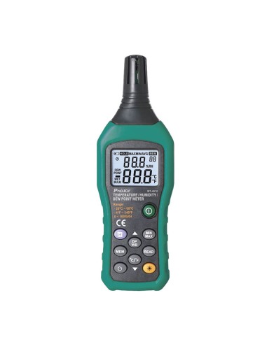 Medidor digital compacto de temperatura, humedad relativa y punto de rocío. medición en c y f, memoriza temperatura máxima, mínima y hasta 99 mediciones. alimentación: 4 pilas aaa (no incluidas). pantalla lcd de 3 dígitos. rango: -20c a +60c, 0 a 100%rh. frecuencia: 400ms. resolución: 0,1c, 0,1%rh. 60 x 29 x 184 mm