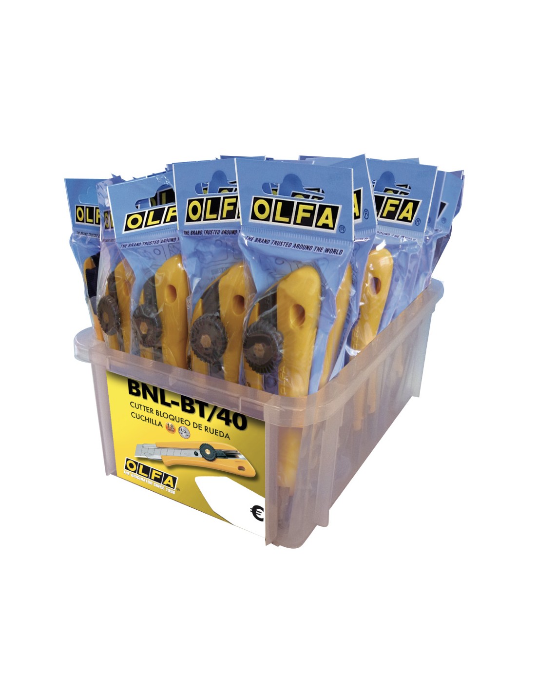 Cúter bnl-bt/40 con cuchilla 18 mm con bloqueo de ruedecilla. mango único especialmente diseñado para adaptarse a la mano confortablemente. presentado en caja expositora de 40 unidades
