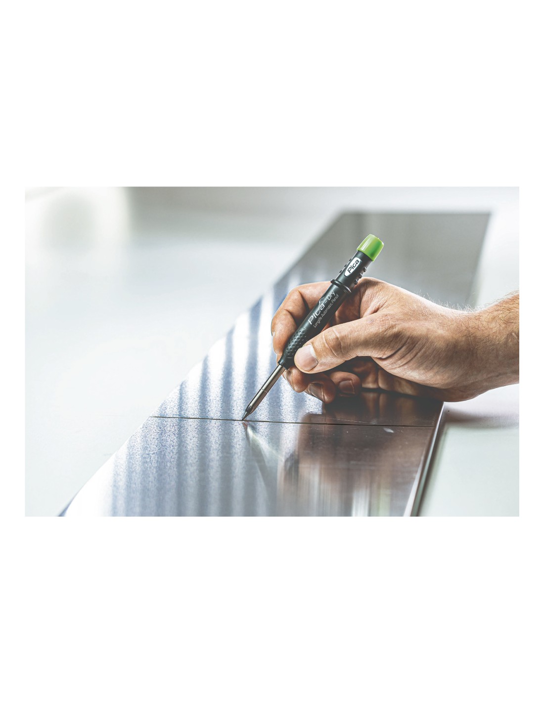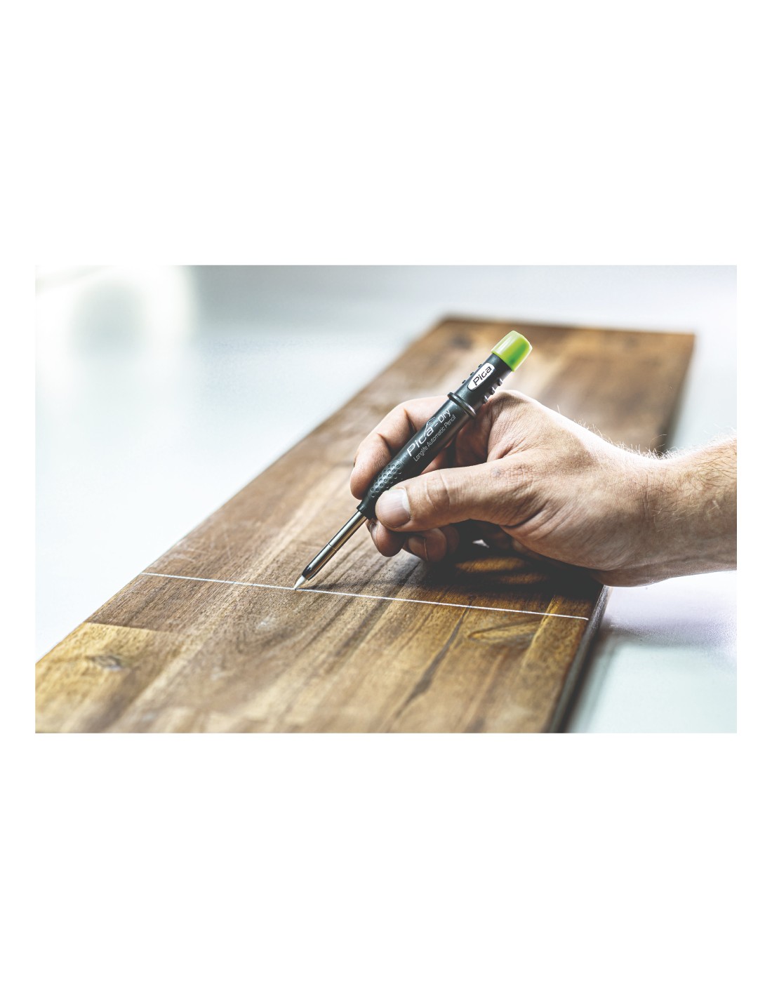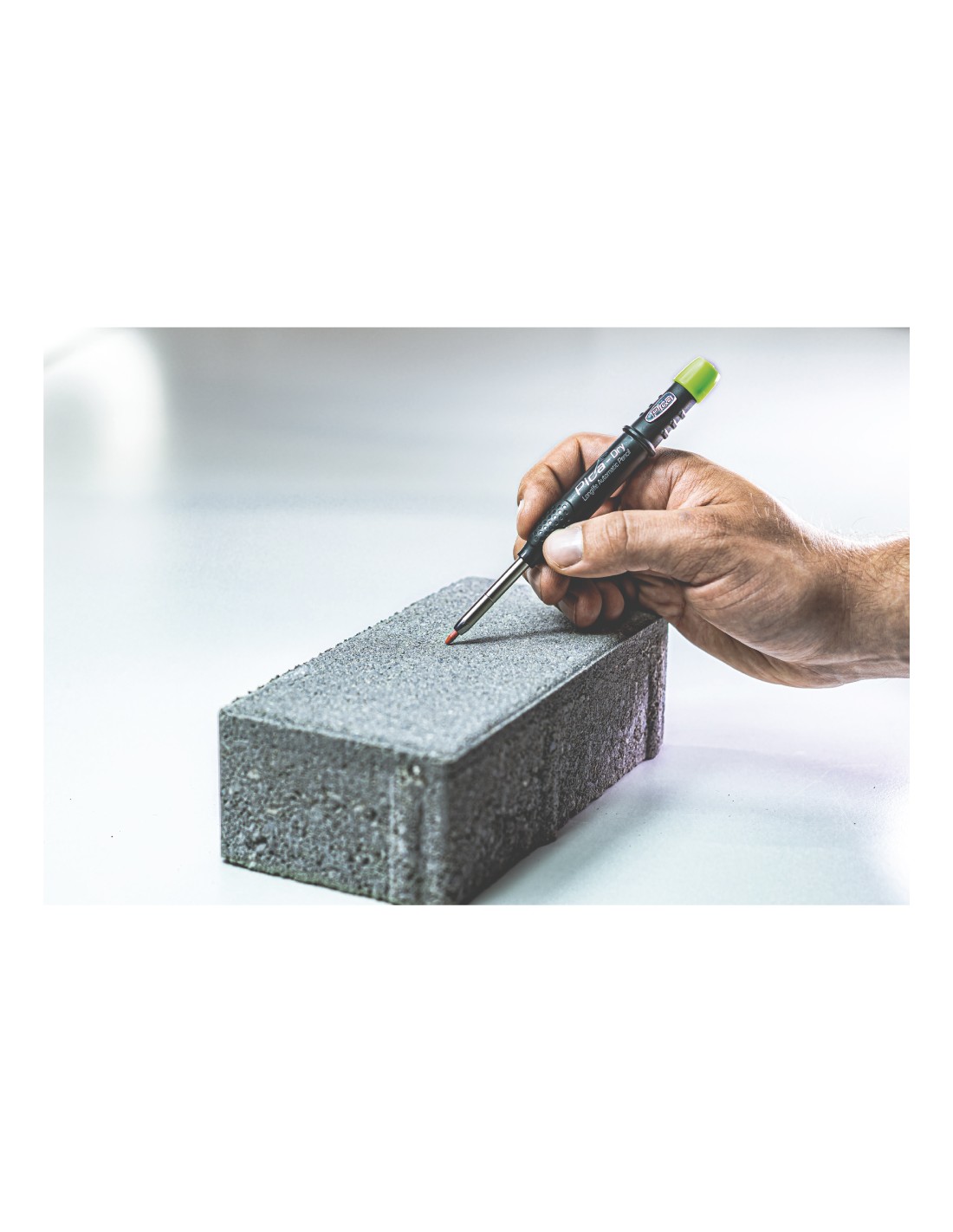 Marcador automático dry grafito para artesanos profesionales. la mina de grafito especial marca en casi todas las superficies, secas o mojadas, lisas o rugosas, polvorientas o aceitosas. lavable con un paño húmedo. gran versatilidad por las minas de colores: para marcar en superficies claras u oscuras, solubles al agua o resistentes al agua. práctica funda con clip, que permite trabajar con una sola mano. sacapuntas integrado, patentado. mecanismo impulsor de alimentación automática de la mina cubierta por un tubo de acero inoxidable. recarga de minas por el extremo superior. larga duración por la alta calidad de los componentes