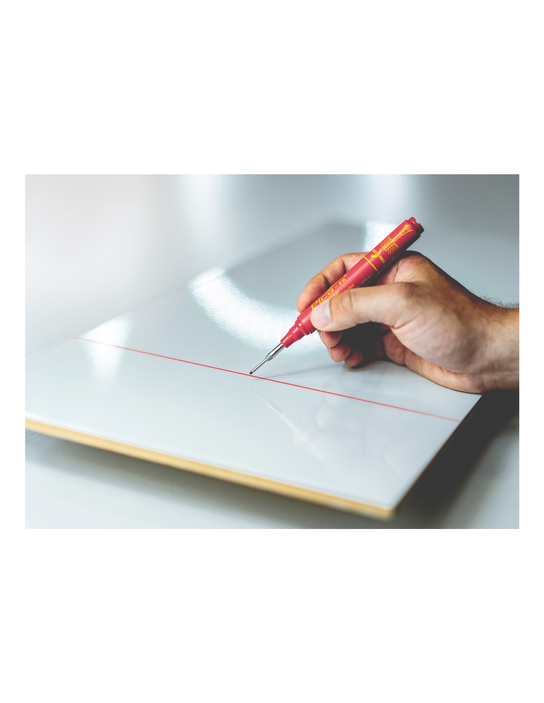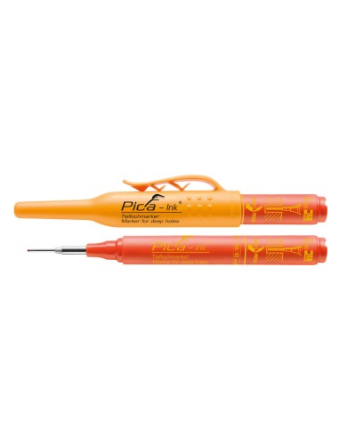 Marcador permanente de tinta para agujeros profundos rojo, ideal para puntos de difícil acceso. apto para la mayor parte de superficies secas. práctica funda con clip, para trabajar con una sola mano. tinta permanente, eliminable en superficies lisas brillantes con alcohol y otros solventes. punta telescópica ajustable de acero inoxidable, patentada: 3 veces más capacidad de marcaje al usar 7 mm. máximo rendimiento: mina utilizable por ambos lados. la mina se puede girar 180° hasta 7 veces y más para una larga vida útil del marcador