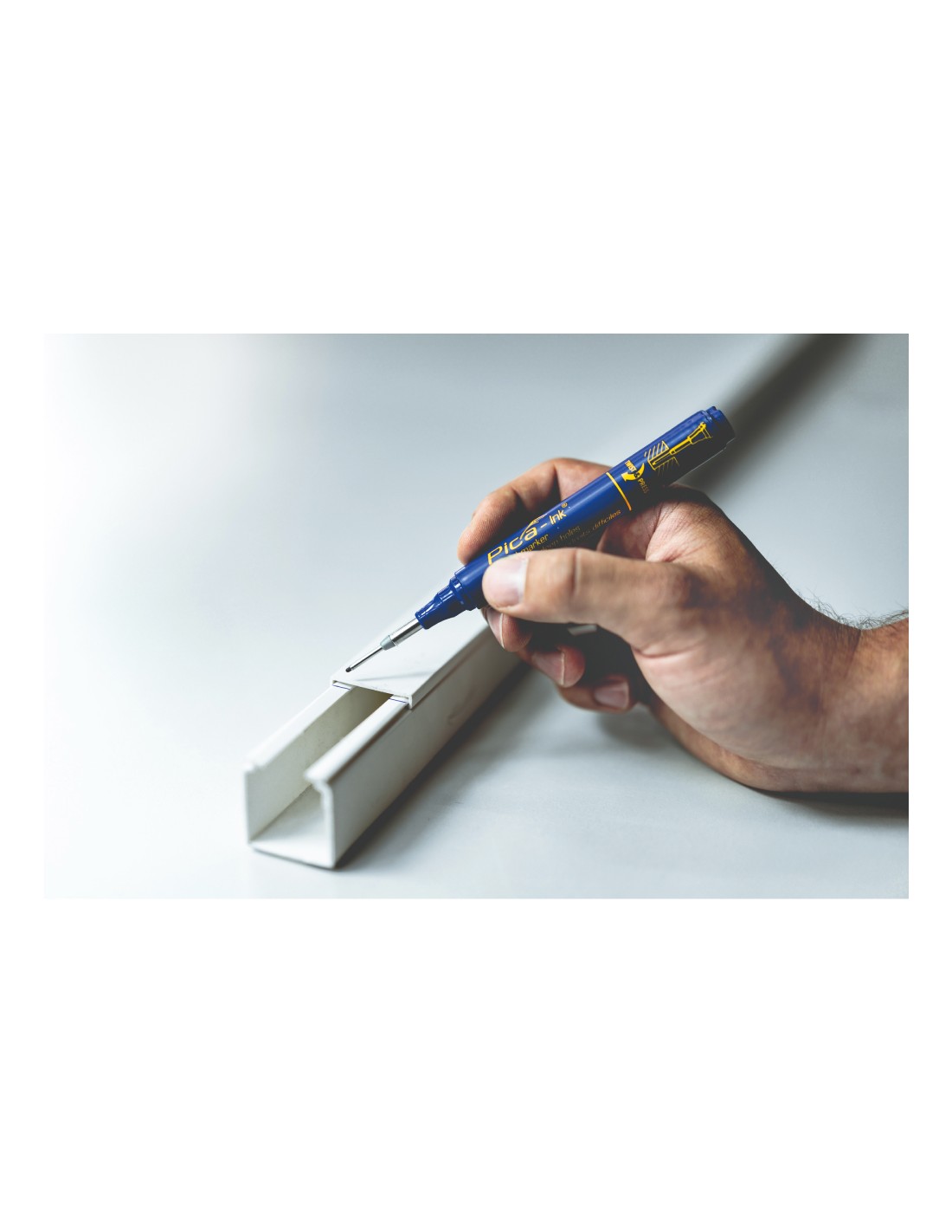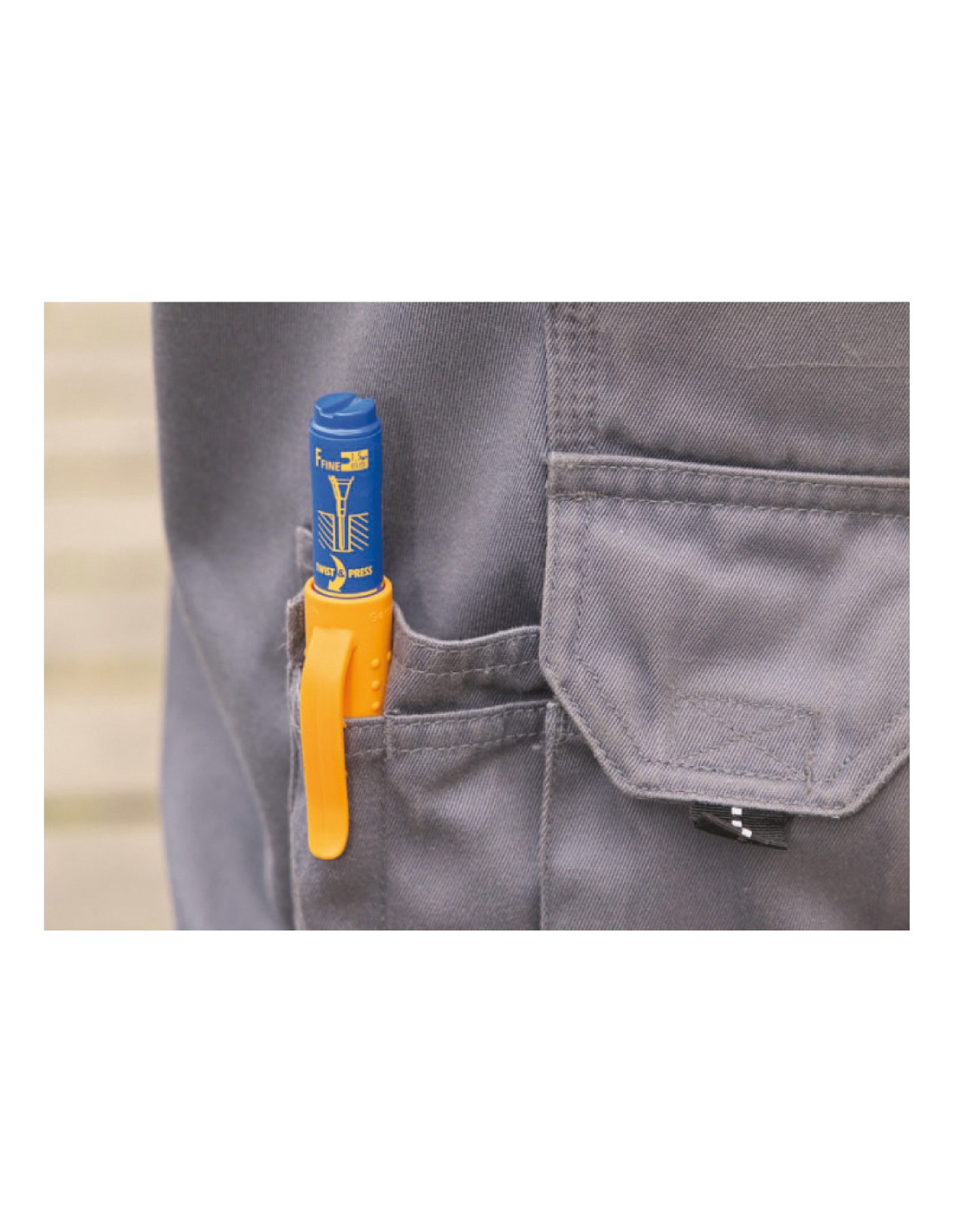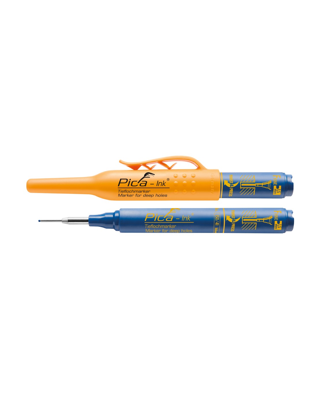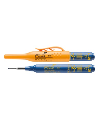 Marcador permanente de tinta para agujeros profundos azul, ideal para puntos de difícil acceso. apto para la mayor parte de superficies secas. práctica funda con clip, para trabajar con una sola mano. tinta permanente, eliminable en superficies lisas brillantes con alcohol y otros solventes. punta telescópica ajustable de acero inoxidable, patentada: 3 veces más capacidad de marcaje al usar 7 mm. máximo rendimiento: mina utilizable por ambos lados. la mina se puede girar 180° hasta 7 veces y más para una larga vida útil del marcador