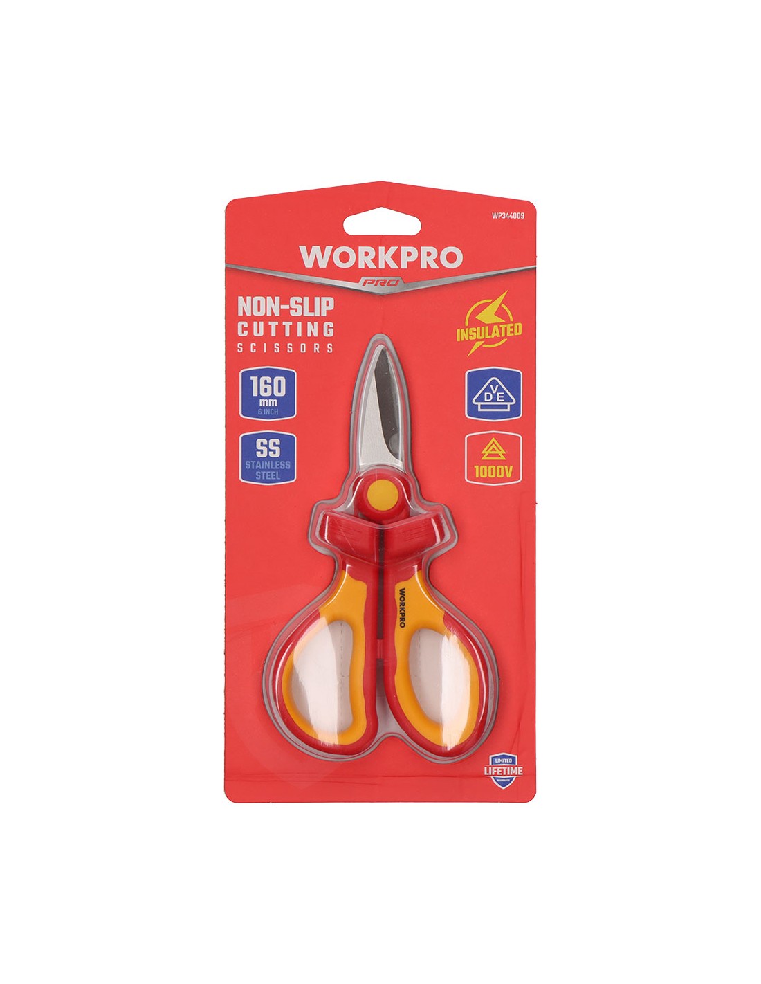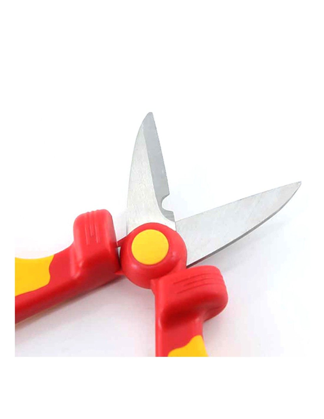 Tijera de electricista aisladas 160 mm, acordes a en/iec 60900, mango de agarre cómodo de dos materiales. las protecciones integrales evitan el contacto de las manos con elementos conductores. tensión aislada hasta 1.000 v ac