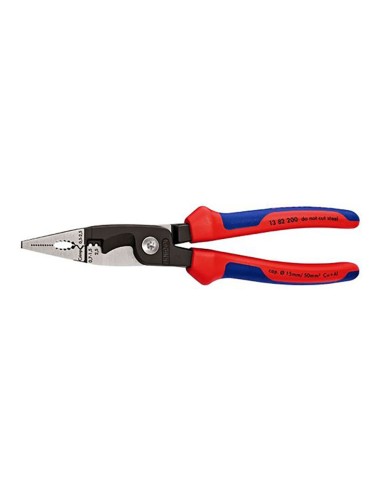 Alicates negro para instalaciones eléctricas. mangos aislados con fundas multicomponentes, tiene 6 funciones para sujetar material plano y redondo, doblar, desbarbar, cortar cables, pelar y crimpar punteras huecas. superficie de agarre lisa en la punta para agarrar los cables individuales. superficie de agarre dentada y mordaza para agarrar material plano y redondo. canto exterior marcado en la boca para manipular las cajas de los mecanismos eléctricos y desbarbar orificios de paso. orificios para pelar cables de 0,75 a 1,5 mm y 2,5 mm. mordaza para crimpar punteras huecas de 0,5 a 2,5 mm. tijeras cortacables con filos de precisión (templados por inducción). seguridad con certificación vde hasta 1000v. 200 x 85 x 20 mm