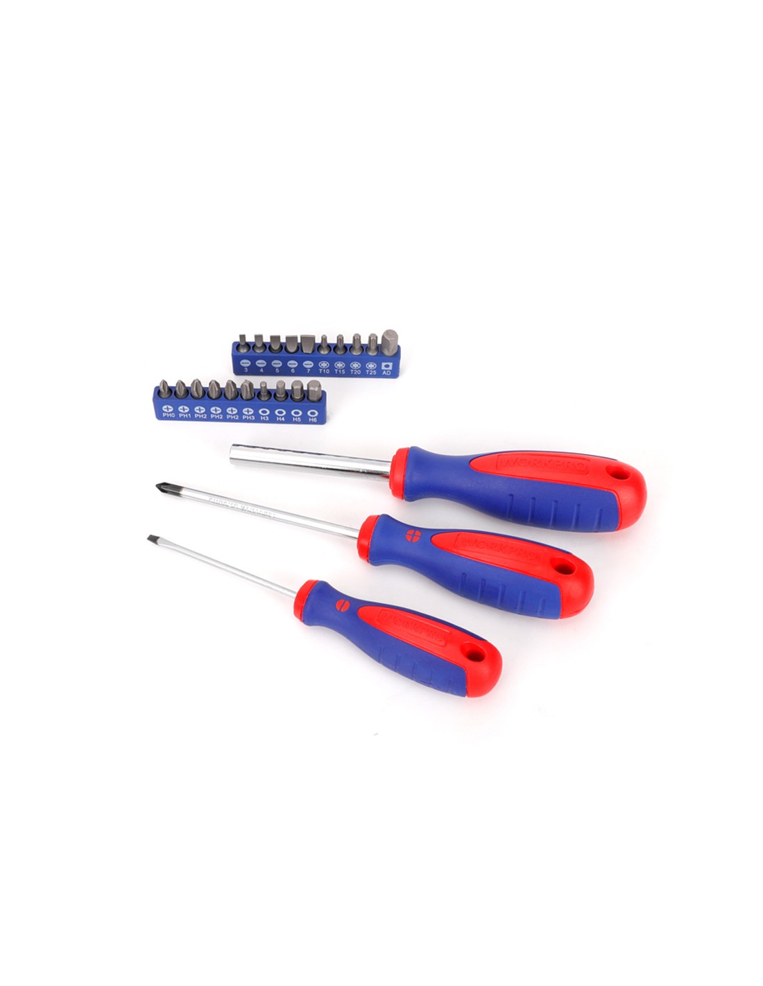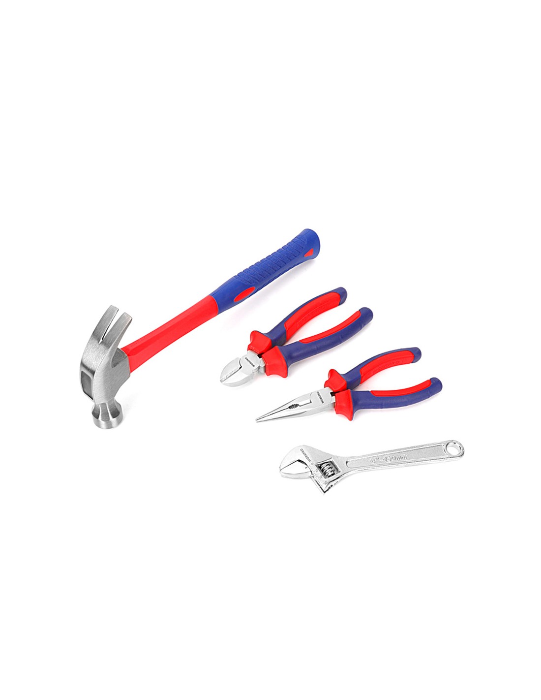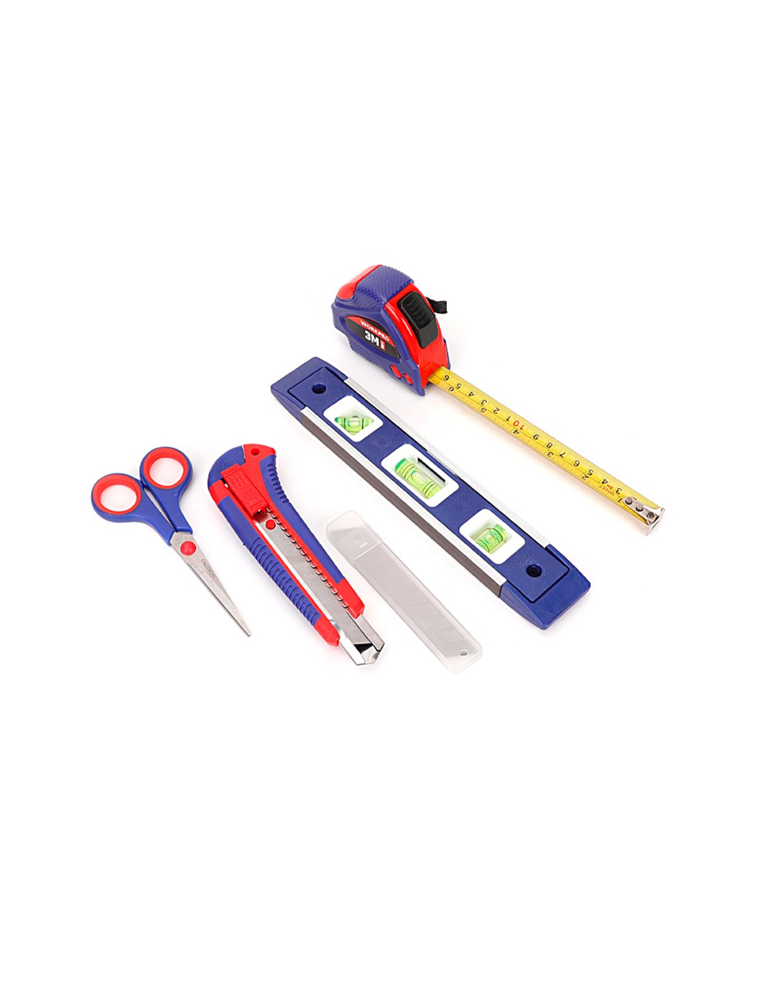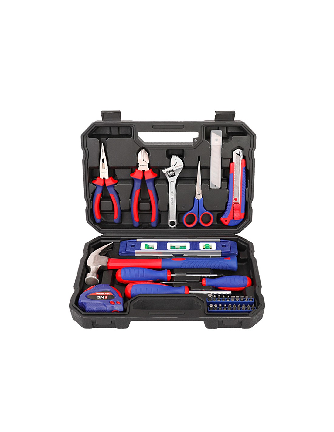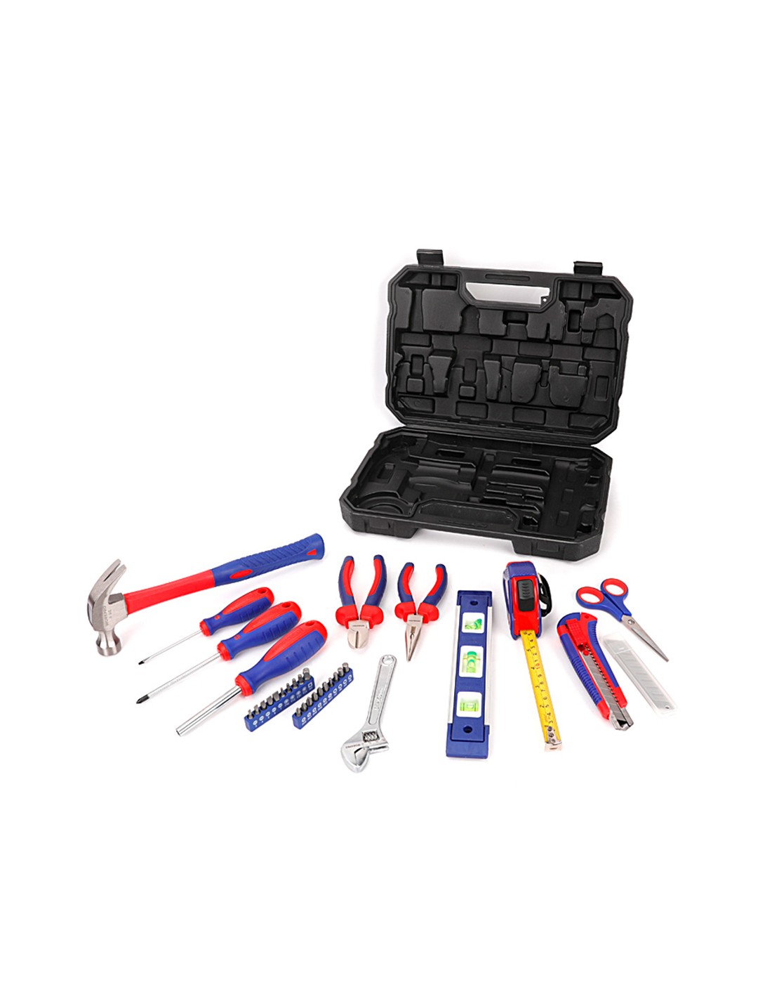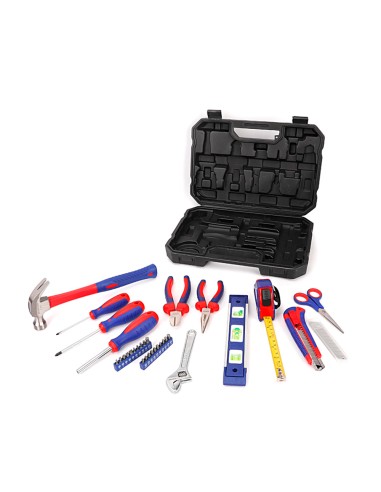 Juego de herramientas 32 piezas. contiene: alicate de punta larga de 150 mm alicate corte diagonal de 160 mm llave ajustable de 150 mm tijera de 140 mm cutter de 18 mm 3 cuchillas cutter 18 mm martillo de carpintero cinta métrica de 3m 2 destornilladores cromo vanadio: ph1 x 100, 3 x 75 destornillador magnético 20 puntas cromo vanadio de 25 mm pozi: pz0, pz1, pz2, pz3, nivel 225 mm maletín plástico
