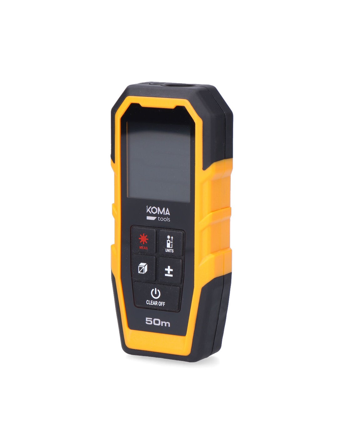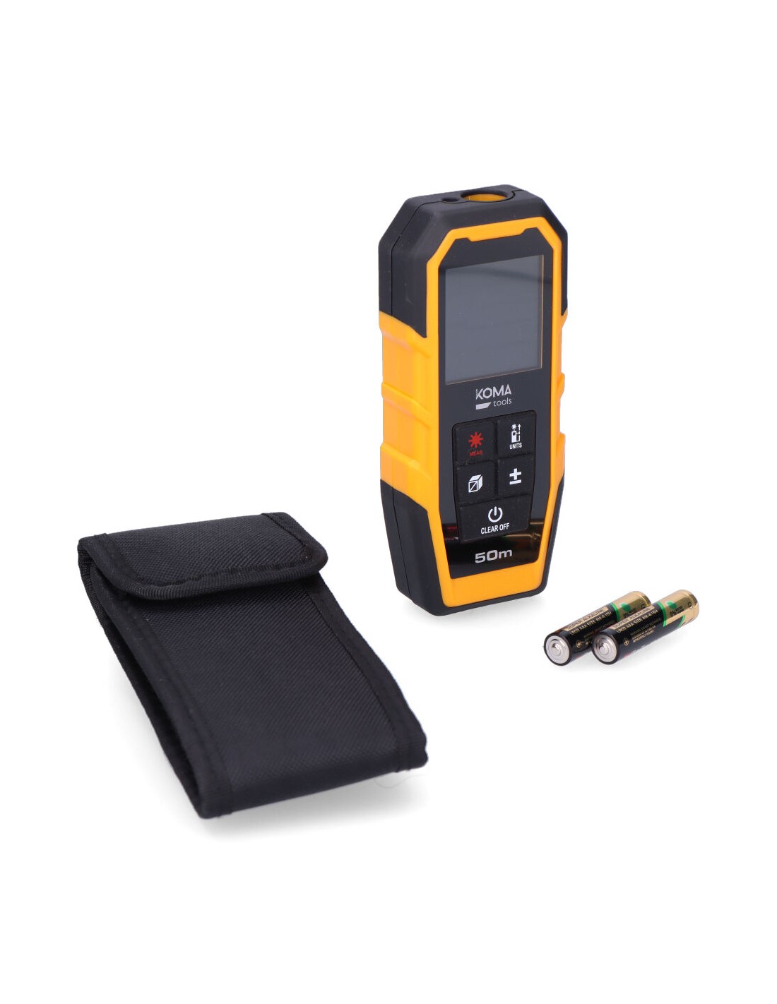 Medidor laser con funda, láser de clase ii, longitud de onda 650 nanómetros, precisión ±2 mm, rango de medición 0,05 - 50 m. funciona con 2 pilas aaa (incluidas). temperatura de funcionamiento 0°c 40°c. opciones de unidad de medida en m, pugadas, pies y medición de retraso. función de medición contínua, de área, volumen, ángulo, teorema de pitágoras, suma y resta, suma/resta de área y volumen. aviso de máximo y mínimo, pantalla retroiluminada y tono de tecla, almacenamiento máximo 99 unidades. apagado automático del láser a los 20 segundos, del aparato a los 150. medida 5,2 x 2,4 x 12,3 cm