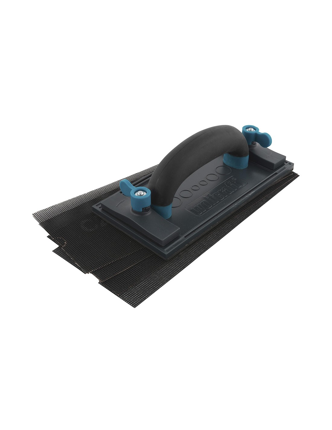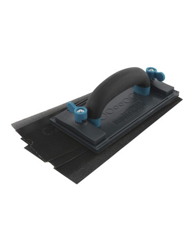 Lijadora juego de 5 piezas, para lijado de placas de yeso. incluye una lijadora manual con una superficie de lijado de 110 x 230 mm, 2 lijas de rejilla de grano 120 / 115 x 280 mm y 2 lijas de rejilla de grano 220 / 115 x 280 mm
