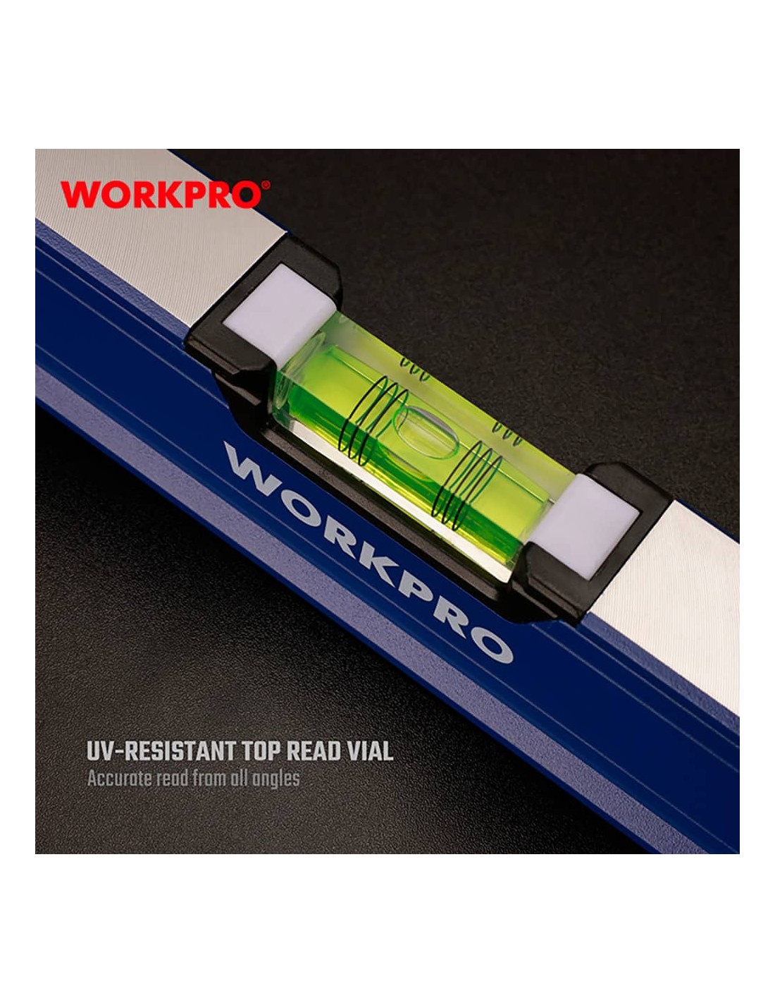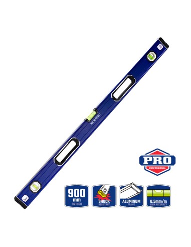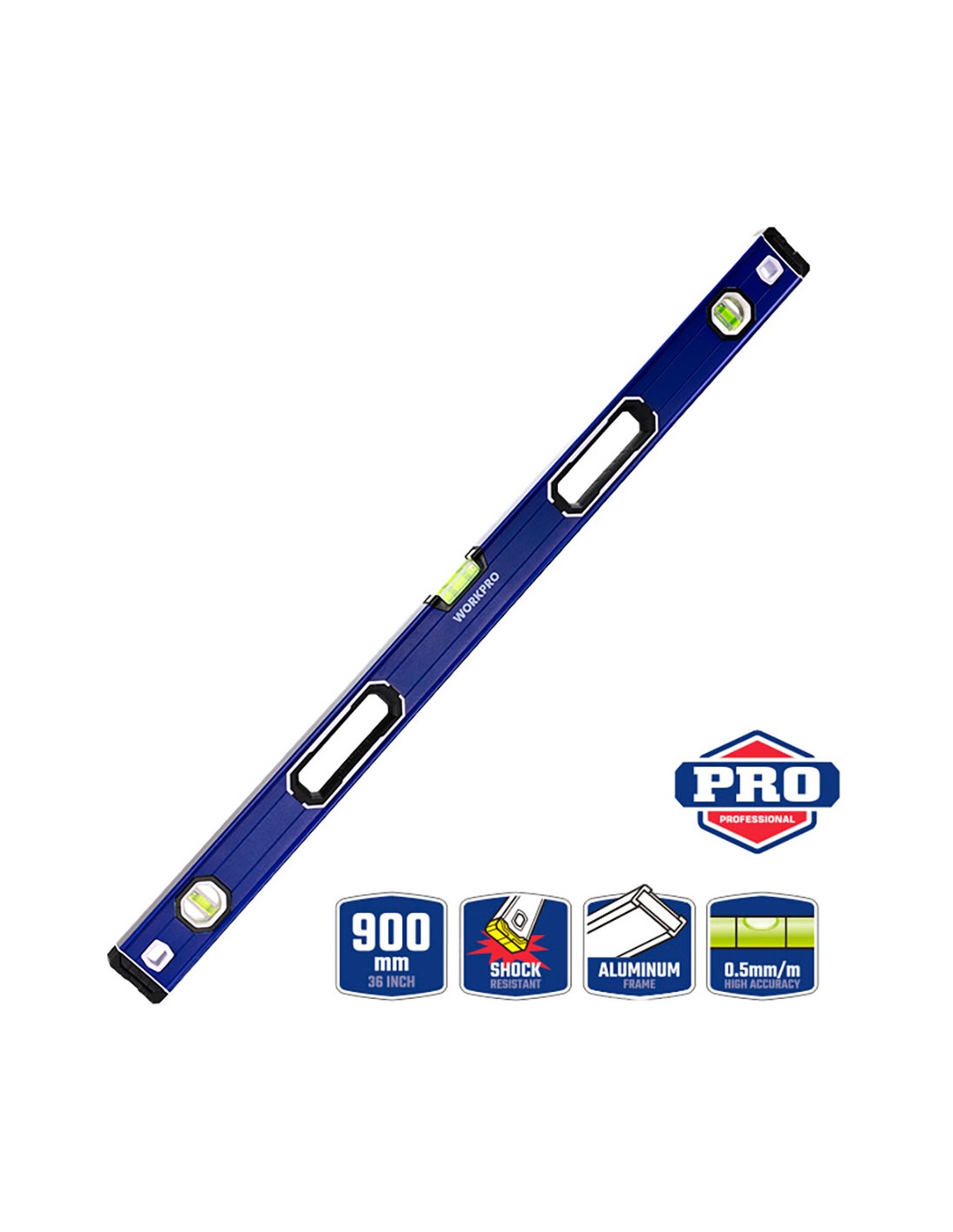 Nivel de caja de aluminio de 900 mm, con base magnética, conteras a prueba de golpes, anillo de agarre grande, cómodo de usar, aleación de aluminio con tratamiento de oxidación duradero, precisión: 0,5 mm/1 m, 3 viales (45°/90°/180°) la ranura en forma de v es adecuada para superficies redondas y de tuberías con agujero para colgar, color azul