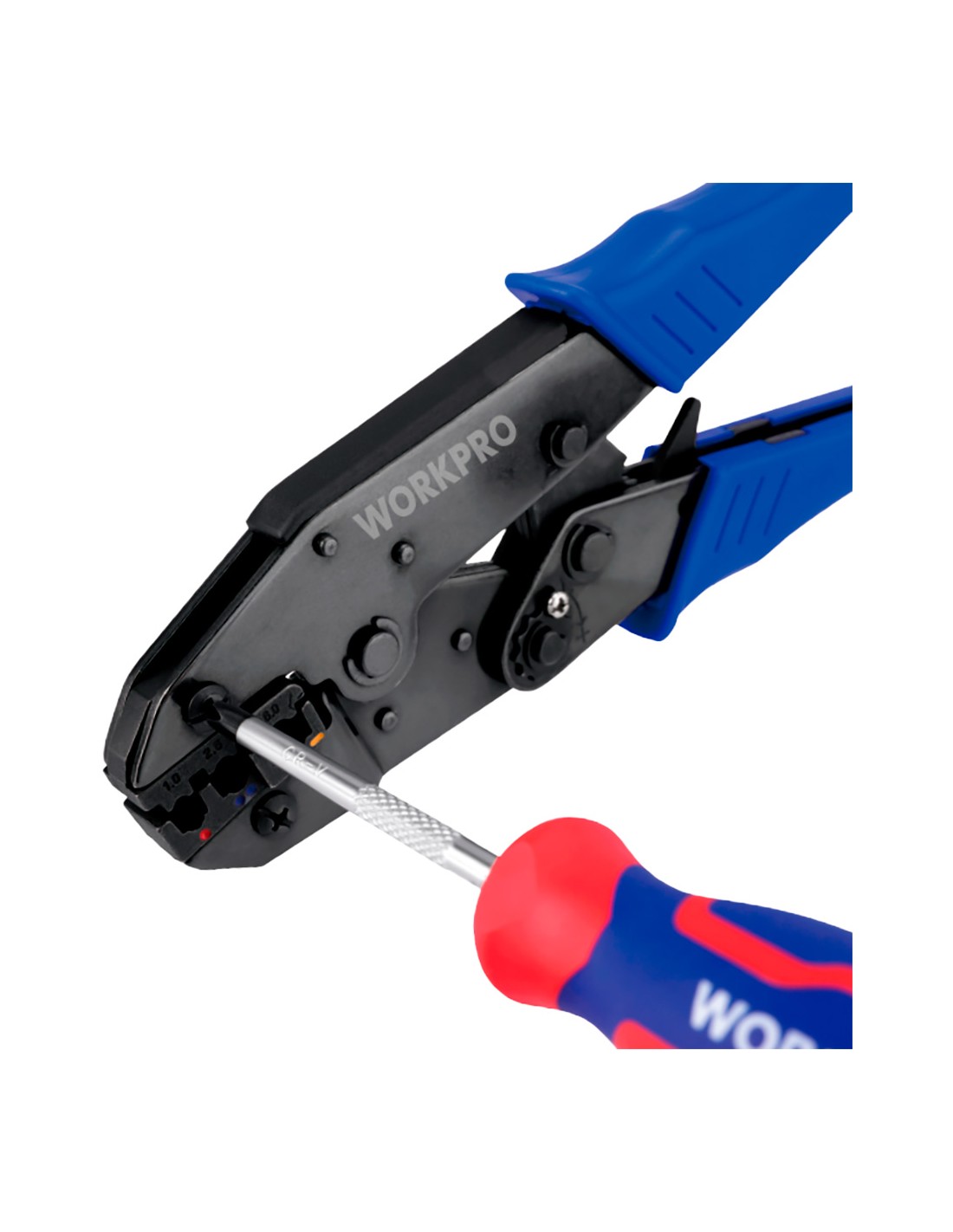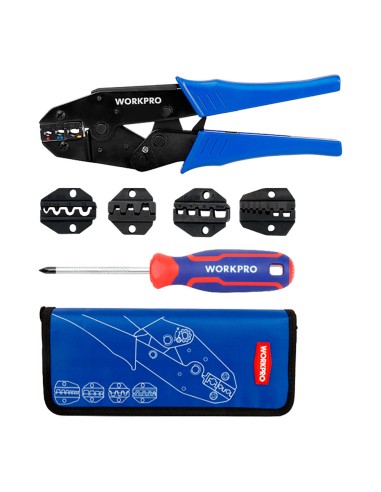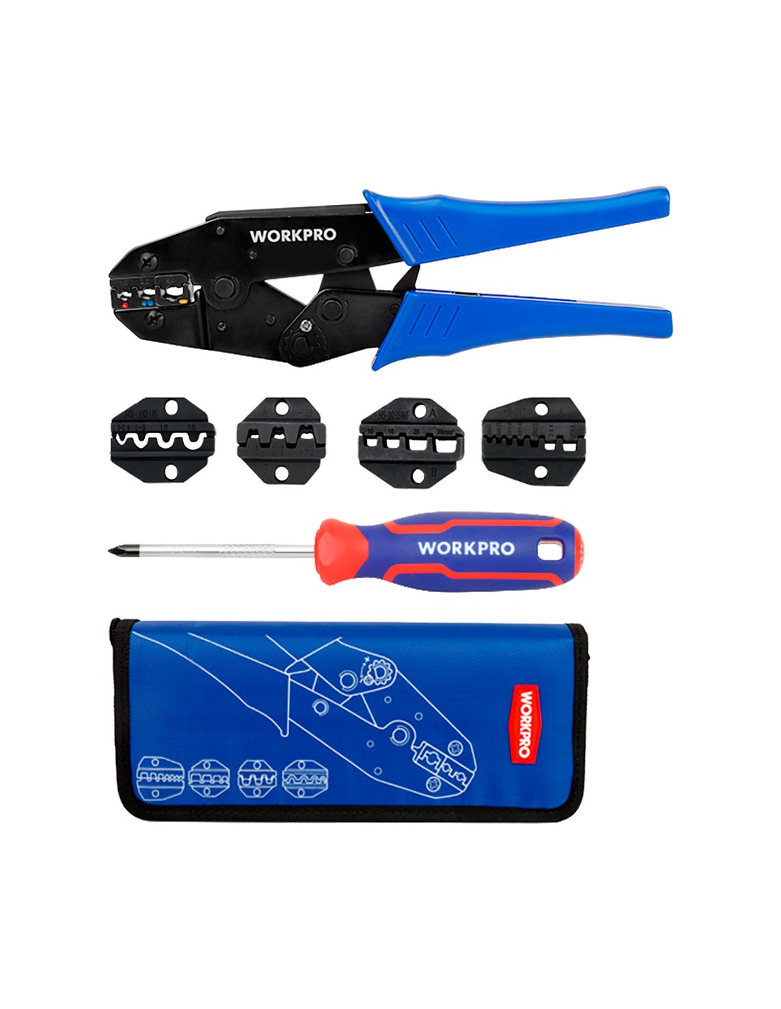 Juego de herramientas para crimpar, incluye 1 alicate de 225 mm para crimpar terminales, 5 mordazas de crimpar, 1 destornillador ph1 x 75mm y una bolsa de almacenamiento acero de mn, para crimpar la mayoría de terminales y conectores de cable no aislados y aislados mordazas intercambiables: 1,0-2,5-6,0 mm, s1016 (0.3-2.5, 4-6, 10,16), s03b (0.5-1, 1-2, 5, 4-6), s26tw (2 x 0.5, 2 x 0.75, 2 x 1.0, 2 x 1.5, 2 x 2.5, 2 x 4, 2 x 6), s35wf (10,16, 25, 35 mm), rango total de crimpar 0.5 - 35 mm (20-2 awg) diseño de mecanismo de trinquete autoajustable