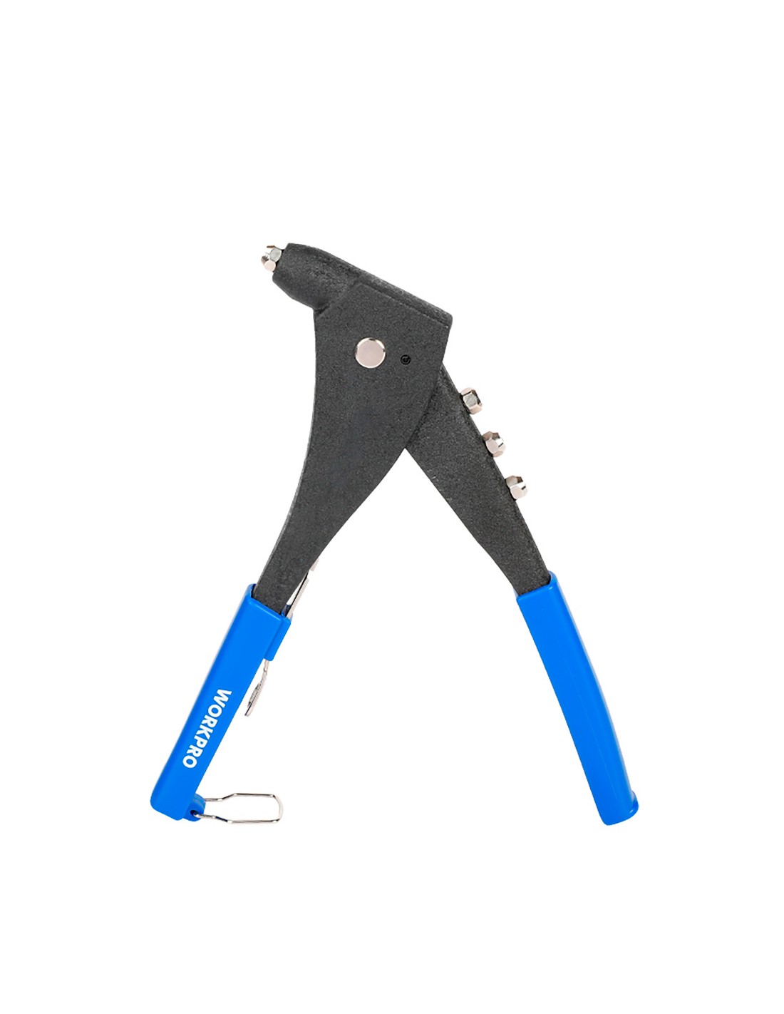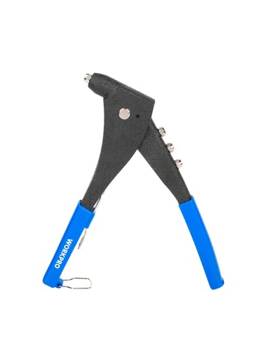 Remachadora aluminio 250 mm mordazas de cromo molibdeno, construcción de aleación de aluminio con mango de agarre ergonómico, mango con resorte que expulsa el vástago del remache automáticamente se adapta a tamaños de remache: 2,4mm (3/32"), 3,2mm (1/8"), 4,0mm (5/32") y 4,8mm (3/16") llave para bocas almacenada en el mango