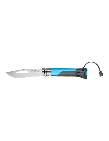 Navaja n. 08 outdoor azul.hoja robusta de 8,5 cm de longitud y 2,5 mm de espesor de acero inoxidable tiene un área dentada de 3,5 cm para cortar cuerdas y desmanillador de ø4 a 10 mm. mango bimaterial de polímero relleno de fibra de vidrio para una excelente resistencia al agua, golpes y temperaturas extremas (-40 °c a +80 °c), y la zona blanda garantiza un buen agarre. incorpora un silbato de 110 db, con alcance de 300 metros en áreas abiertas y anillo virobloc de doble seguridad