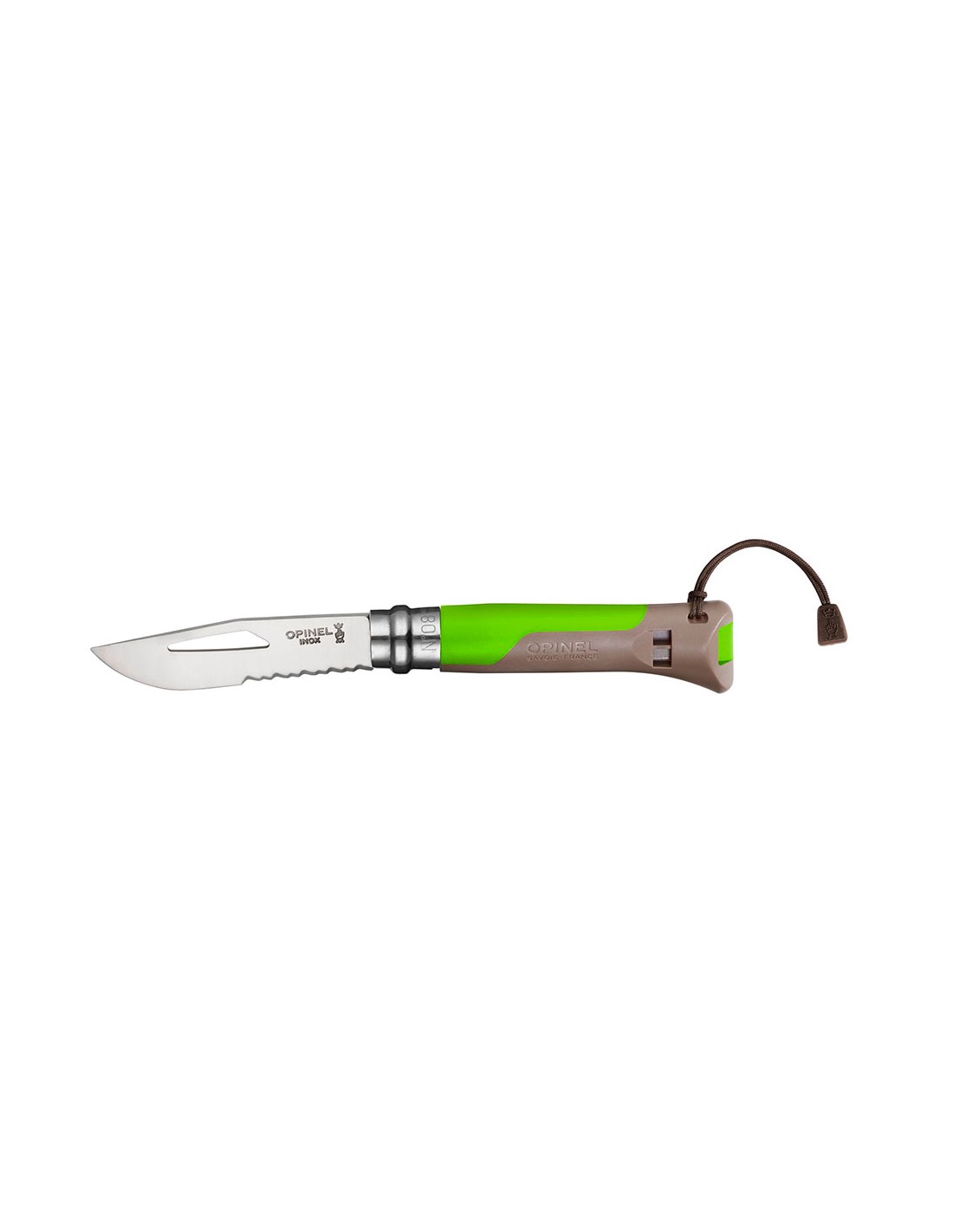 Navaja n. 08 outdoor verde.hoja robusta de 8,5 cm de longitud y 2,5 mm de espesor de acero inoxidable tiene un área dentada de 3,5 cm para cortar cuerdas y desmanillador de ø4 a 10 mm. mango bimaterial de polímero relleno de fibra de vidrio para una excelente resistencia al agua, golpes y temperaturas extremas (-40 °c a +80 °c), y la zona blanda garantiza un buen agarre. incorpora un silbato de 110 db, con alcance de 300 metros en áreas abiertas y anillo virobloc de doble seguridad