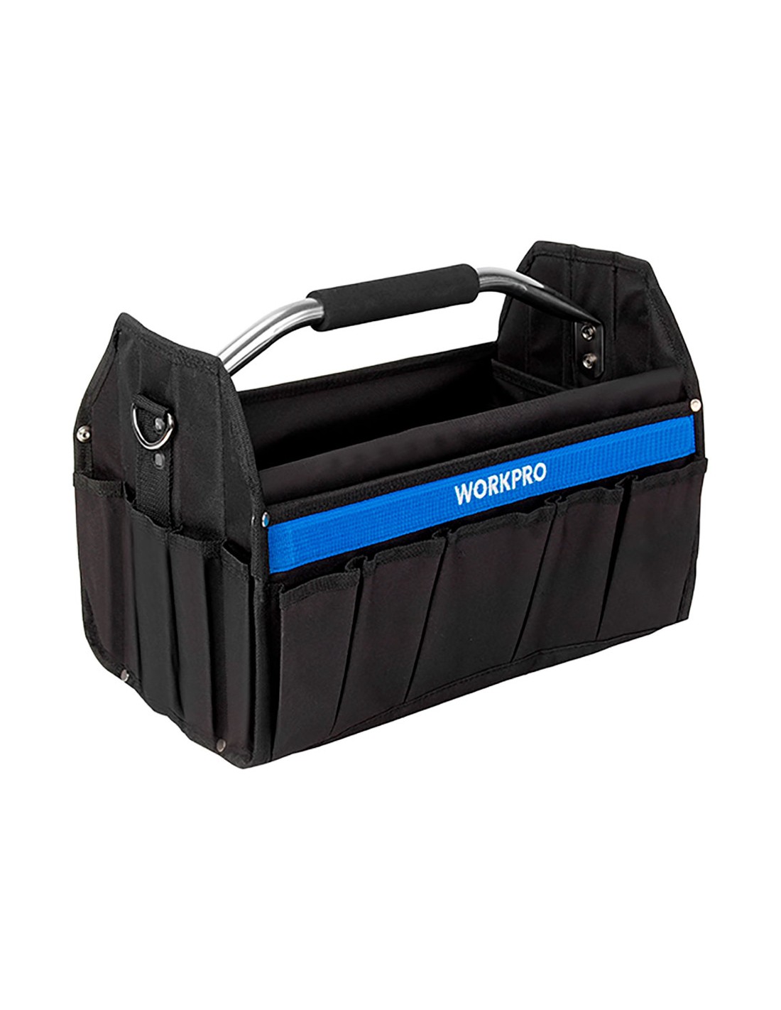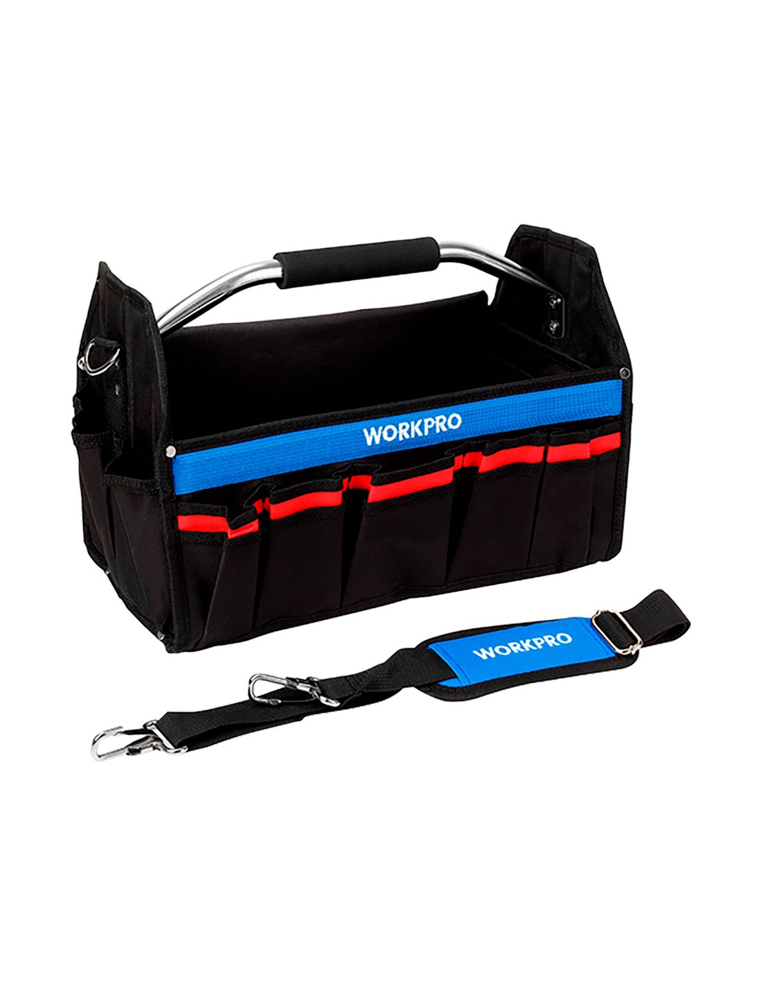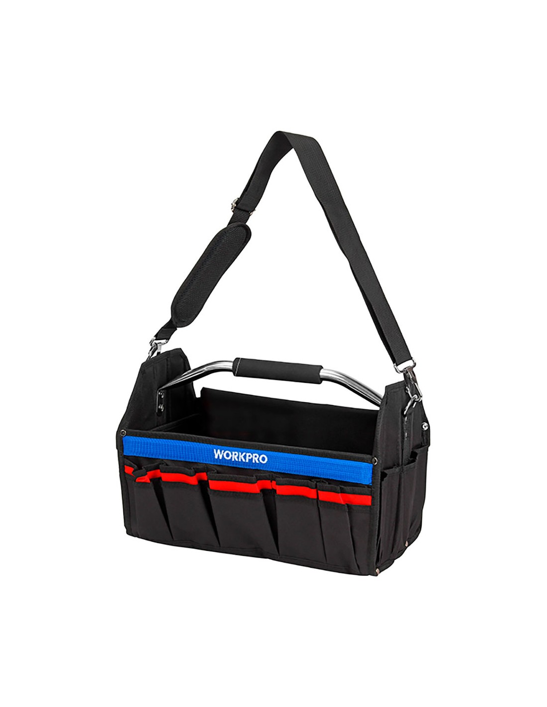 Bolsa de herramientas plegable 41 x 23,5 x 27 cm. poliéster 600d. con asa metálica y correa ajustable, ideal para transportar herramientas manuales y otros artículos pequeños y medianos. con apertura superior para facilitar el acceso de las herramientas. bolsillos exteriores para guardar objetos personales, herramientas pequeñas y accesorios. negra, azul y roja