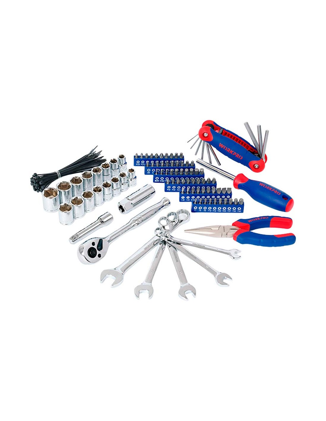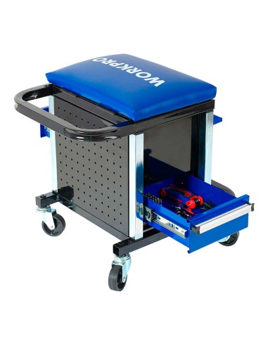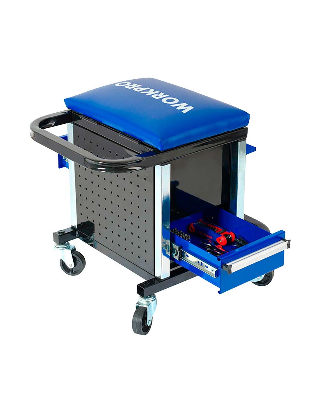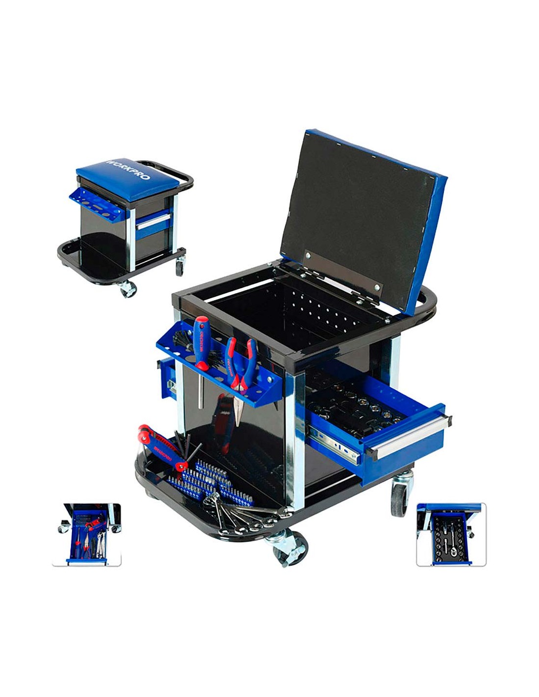 Asiento con ruedas de dos cajones que contiene: 1 ud alicates de punta larga de 160 mm 5 uds llaves combinadas (8,10,11,13 y 15 mm) 9 uds llaves hexagonales 1 ud mango portapuntas magnético 60 puntas cr-v de 25 mm 1 ud mango de carraca de 3/8 8 uds vasos métricos (8,9,10,11,12,14,15 y 16 mm) 8 uds vasos sae (5/16,3/8,7/16,1/2,9/16,5/8,11/16 y ¾ pulg) 1 ud barra de extensión 75 mm 1 ud vaso para bujías de 3/8 pulg 16 mm 40 uds brida para cables