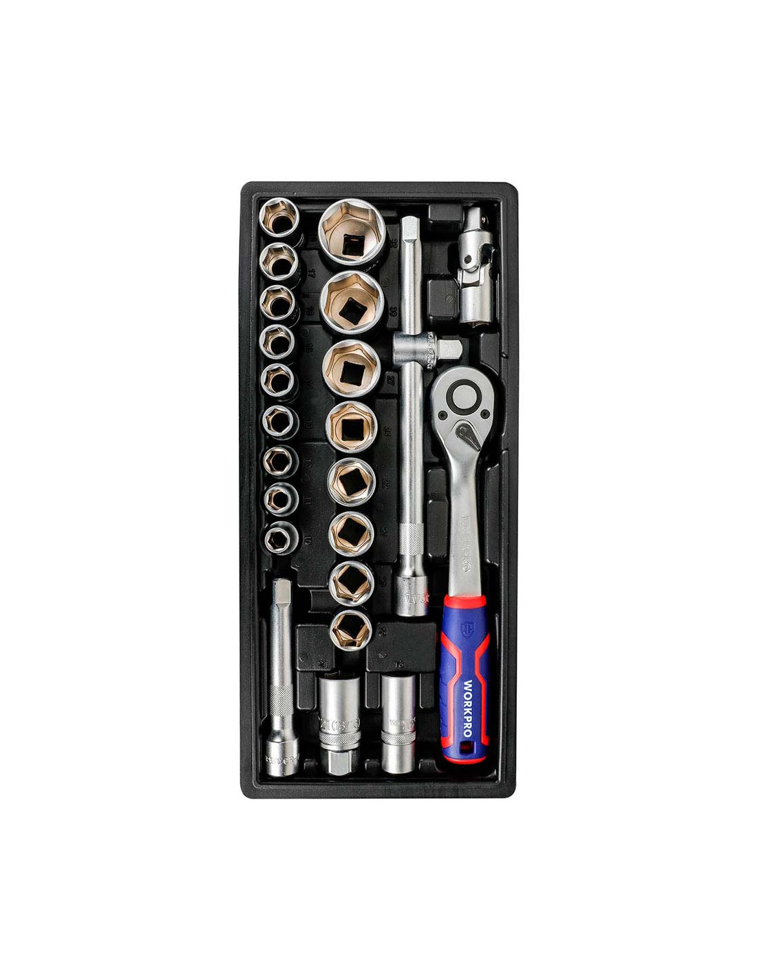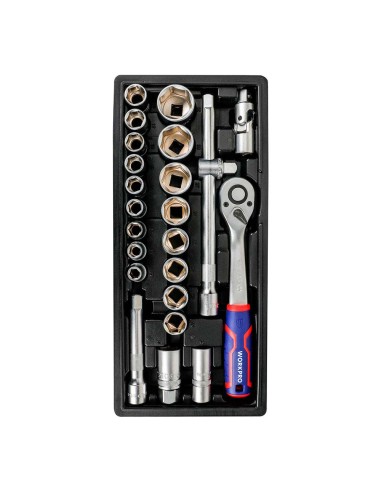Juego carraca y vasos ½ pulg, 24 piezas al cromo vanadio, (métrico) incluye: 1 llave de carraca de ½ pulg y 72 dientes 17 vasos hexagonales: 10, 11, 12, 13, 14, 15, 16, 17, 18, 19, 20, 21, 22, 24, 27, 30 y 32 mm 2 barras de extensión 125 y 250 mm 2 vasos para bujías 16 y 21 mm 1 articulación universal 1 adaptador de 3 vías