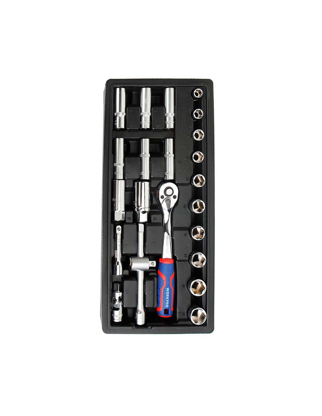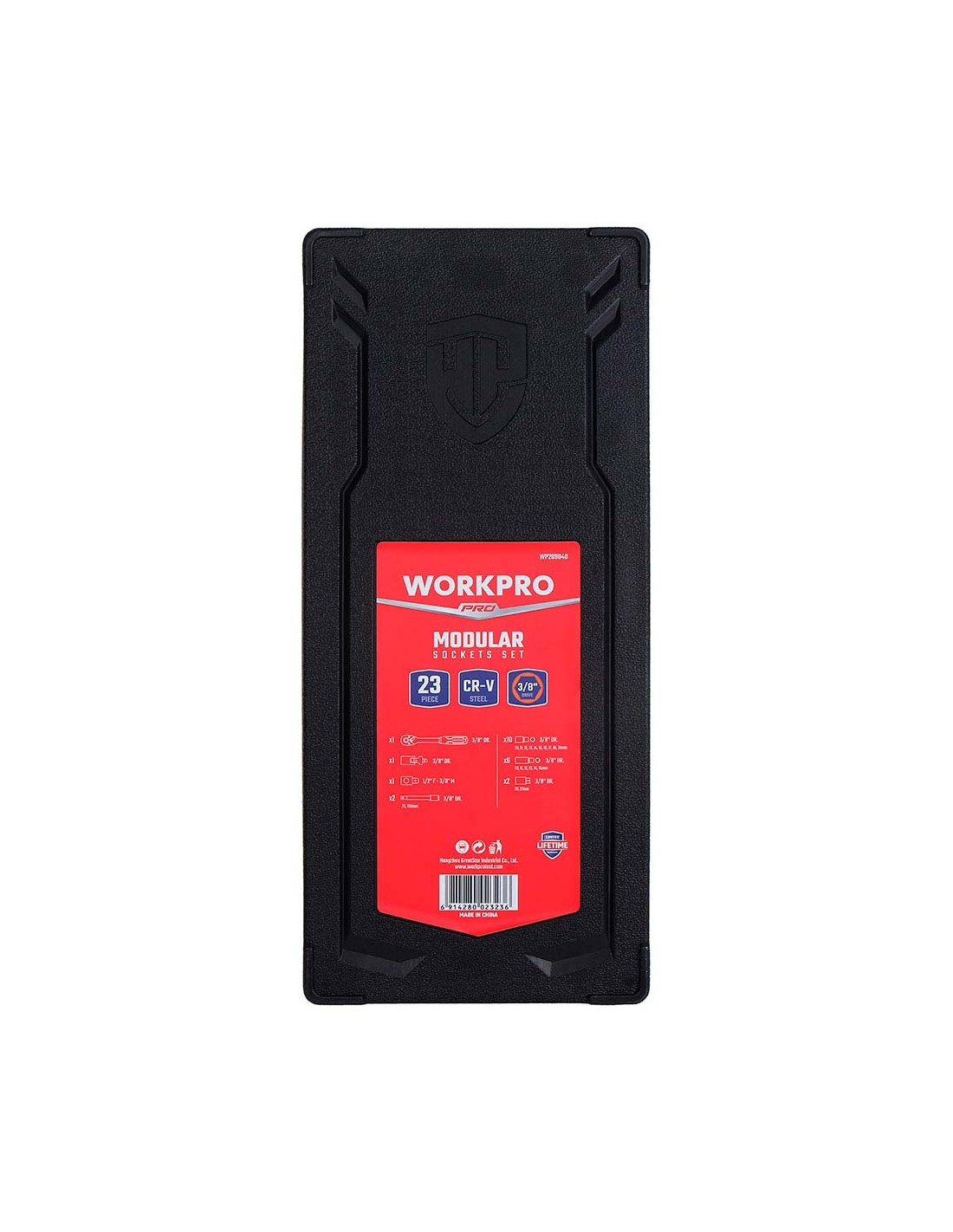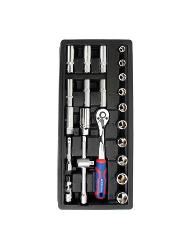 Juego carraca y vasos 3/8 pulg, 23 piezas, (métrico) incluye: 1 llave de carraca de 3/8 pulg y 72 dientes 10 vasos hexagonales: 10, 11, 12, 13, 14, 15, 16, 17, 18 y 19 mm 6 vasos largos de 3/8 pulg: 10, 11, 12, 13, 14 y 15 mm 2 barras de extensión 75 y 150 mm 2 vasos para bujías 16 y 21 mm 1 articulación universal 1 adaptador de 3 vías, ½ pulg f-3/8 pulg m