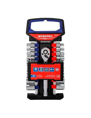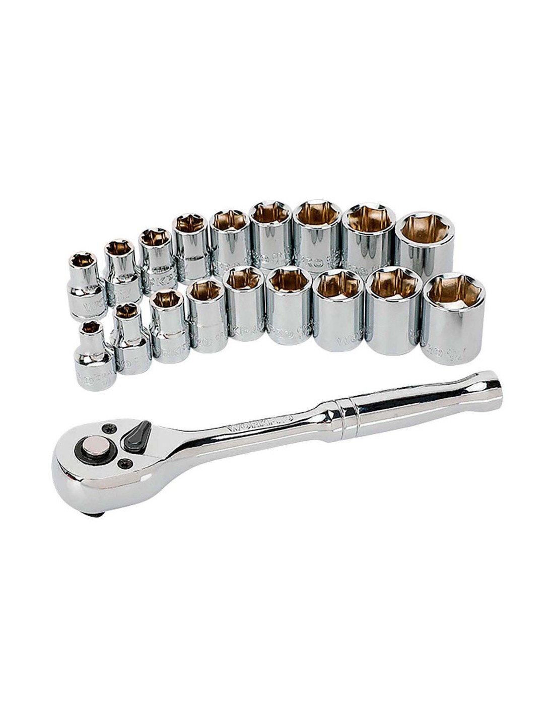 Juego de 19 piezas con carraca y vasos, de acero al cromo vanadio pulido acabado brillante, incluye: 1 llave de carraca de 3/8 pulg con liberación rápida y 72 dientes 9 vasos sae hexagonales ¼ pulg, 5/16 pulg, 3/8 pulg, 7/16 pulg, ½ pulg, 9/16 pulg, ¾ pulg, 11/16 pulg y 5/8 pulg 9 vasos métricos hexagonales 8, 9, 10, 11, 13, 14, 16, 17 y 18 mm