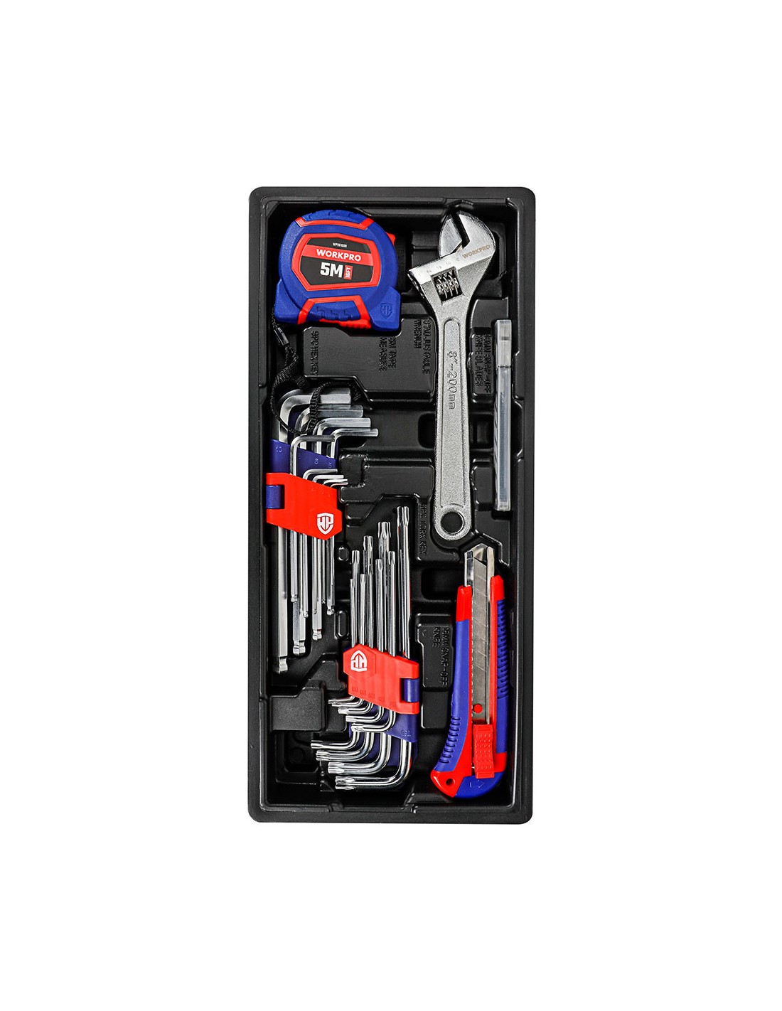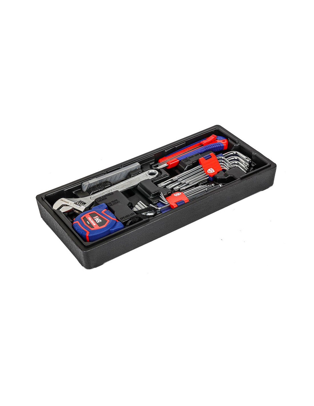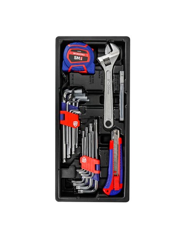 Juego herramientas mixtas, 31 piezas contiene: 9 llaves allen cromo-vanadio de brazo largo 1.5, 2, 2.5, 3, 4, 5, 6, 8 y 10 mm 9 llaves torx cromo-vanadio de brazo largo t10, t15, t20, t25, t27, t30, t40, t45, t50 1 llave ajustable de 200 mm 1 cinta métrica de 5 m 1 cúter recuvierto con cuchilla seccionable de 18 mm 10 cuchillas seccionables de 18 mm