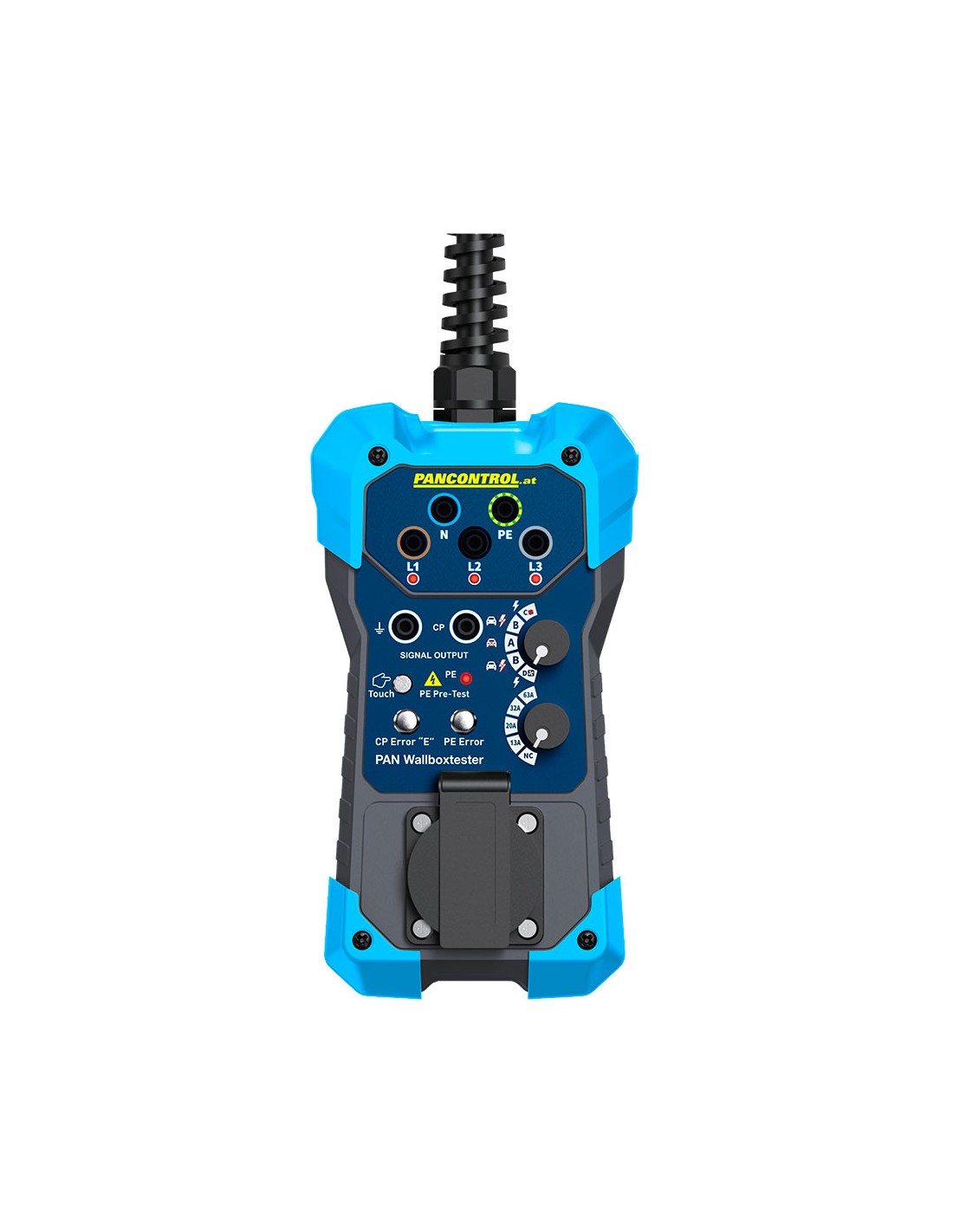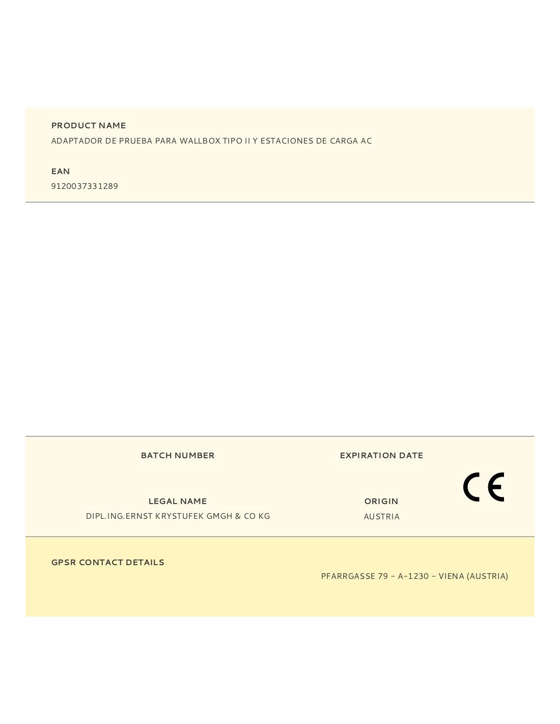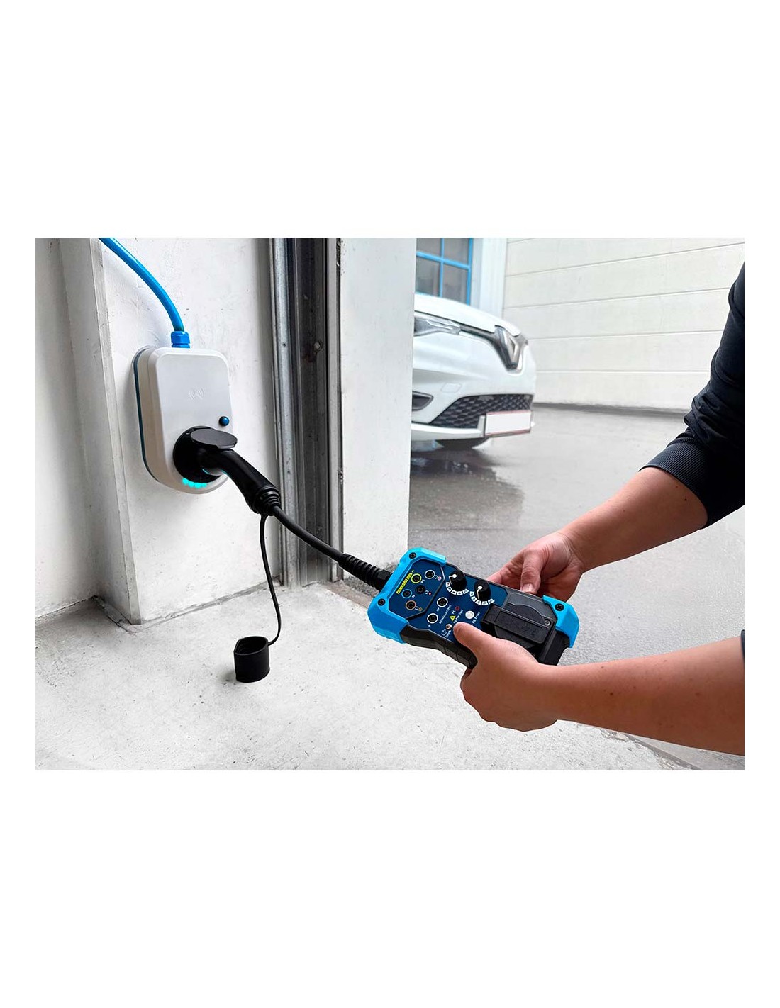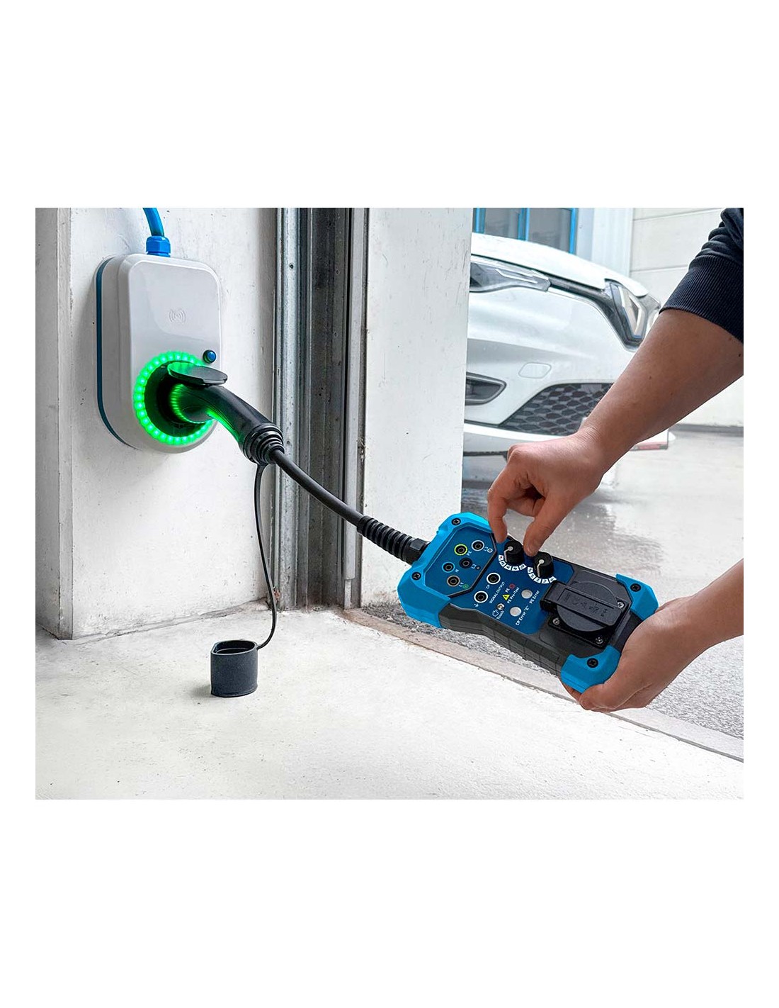 Adaptador para comprobar wallbox tipo 2 y estaciones de carga ac en e-movilidad, mediante simulación de un vehículo eléctrico según iec62196-2, estados de carga a-d seleccionables según norma iec 61851-1 simulación de corrientes de carga tres led indicación fases, prueba tierra, simulación fallo tierra o cortocircuito, prueba línea comunicación toma schuko para cargas externas 10a ip54 cat iii 600 v incluye estuche de almacenamiento, dimensiones 210 x 110 x 55 mm