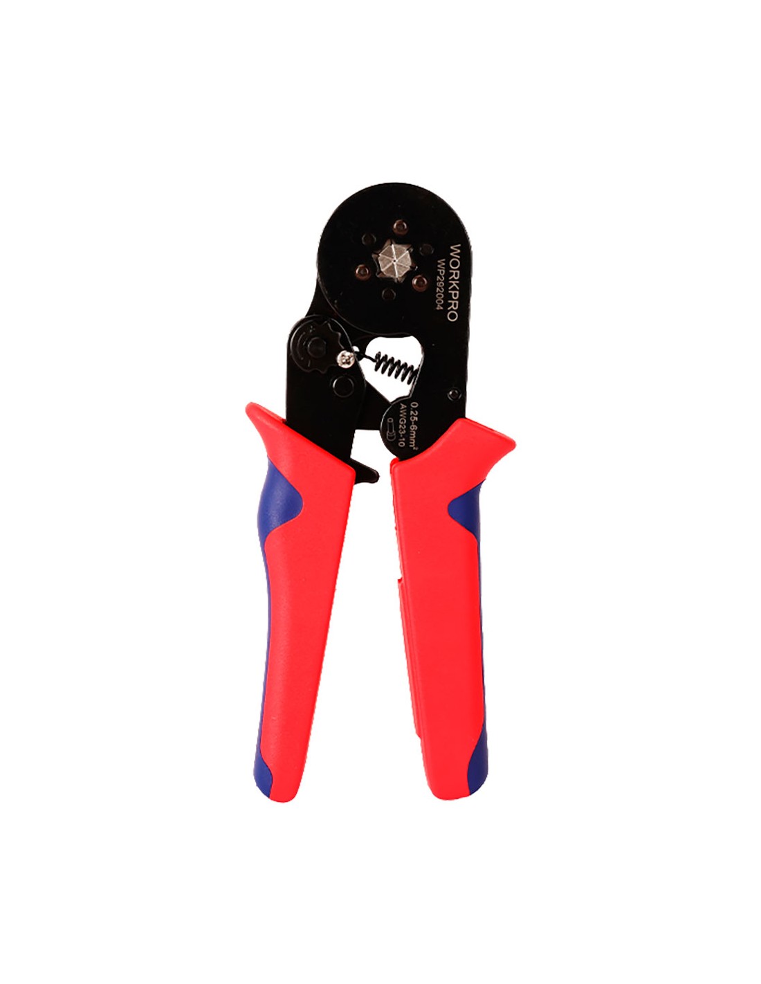 Crimpadora de punteras, rango de crimpar 0,25 - 6 mm / 23-10 awg, apertura de 70°, fabricado en placa de acero de alta calidad, cabezal de crimpar fe8ni, adecuado para terminales de crimpar aislados y no aislados con perfil de crimpar hexagonal, se autoajusta al tamaño deseado de la férrula, mecanismo de trinquete ergonómico, dispositivo de autobloqueo con detección de carga, liberación automática al apretar