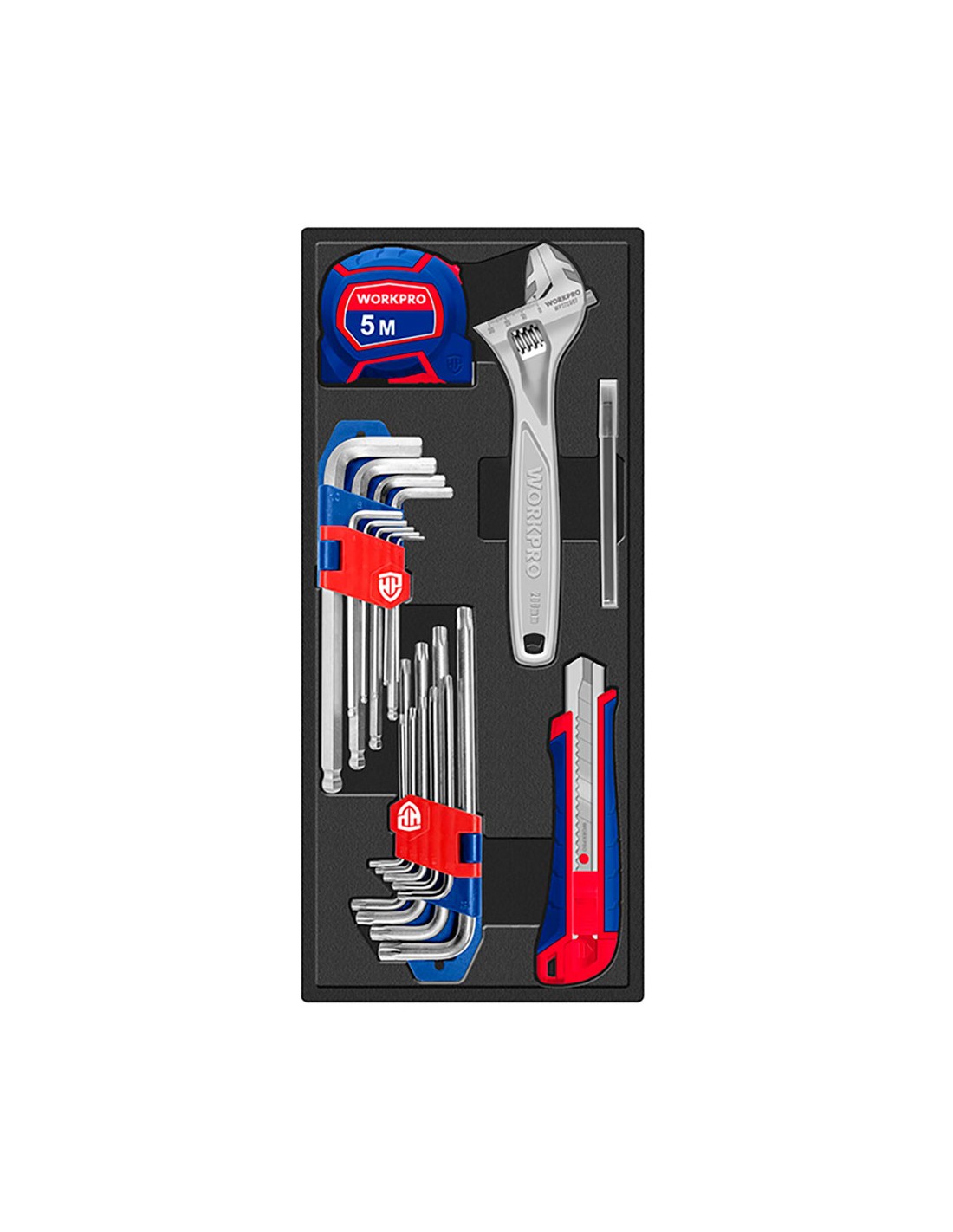 Juego de herramientas, 31 piezas contiene: 9 llaves allen de cromo vanadio de brazo largo 1.5, 2, 2.5, 3, 4, 5, 6, 8 y 10 mm 9 llaves torx de cromo vanadio de brazo largo t10, t15, t20, t25, t27, t30, t40, t45, t50 1 llave ajustable de 200 mm 1 cinta métrica de 5 m x 19 mm 1 cúter recubierto con cuchilla seccionable de 18 mm 10 cuchillas seccionables de 18 mm en un estuche de almacenamiento