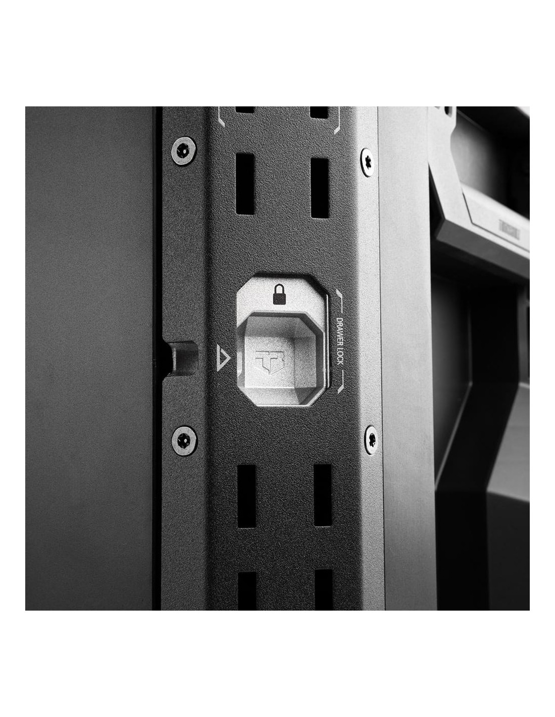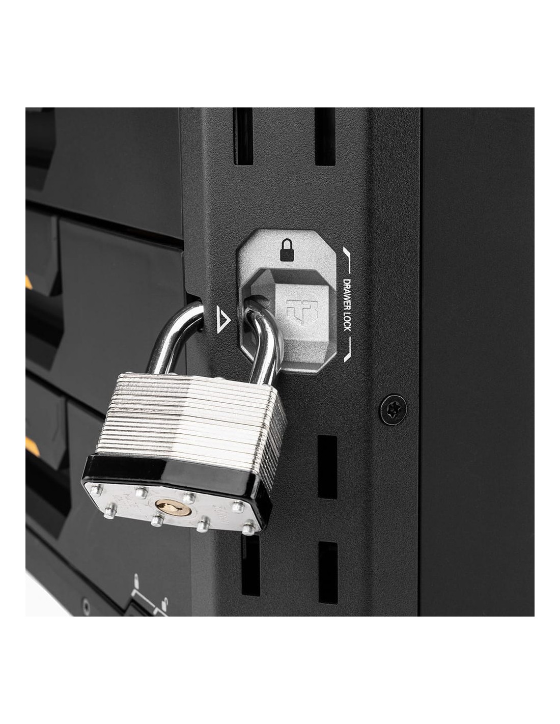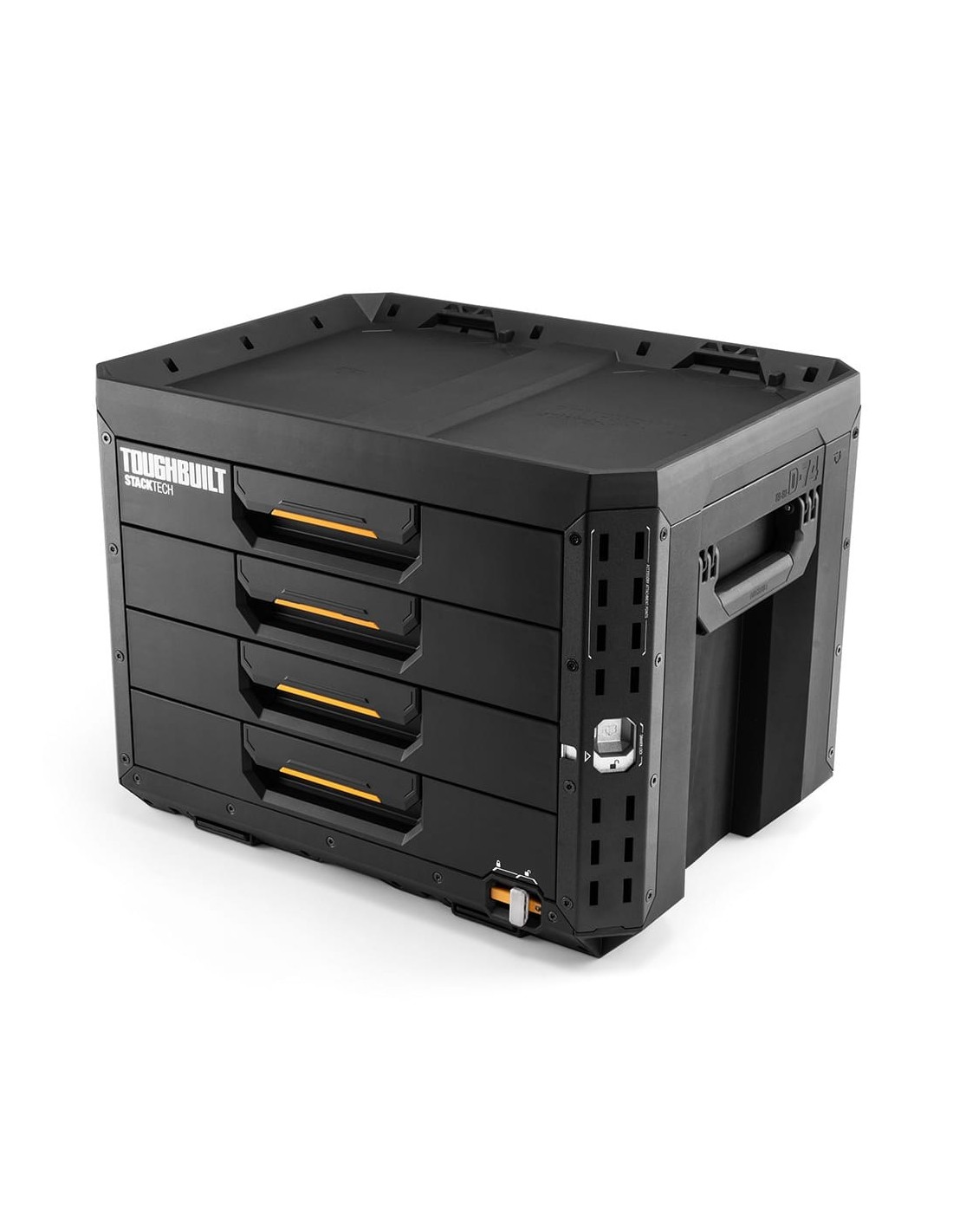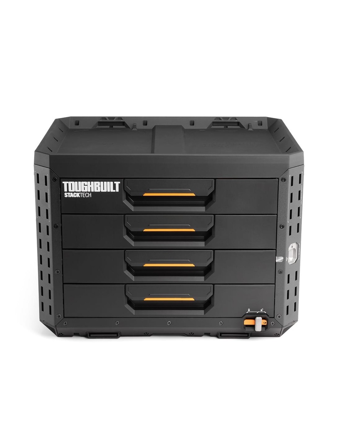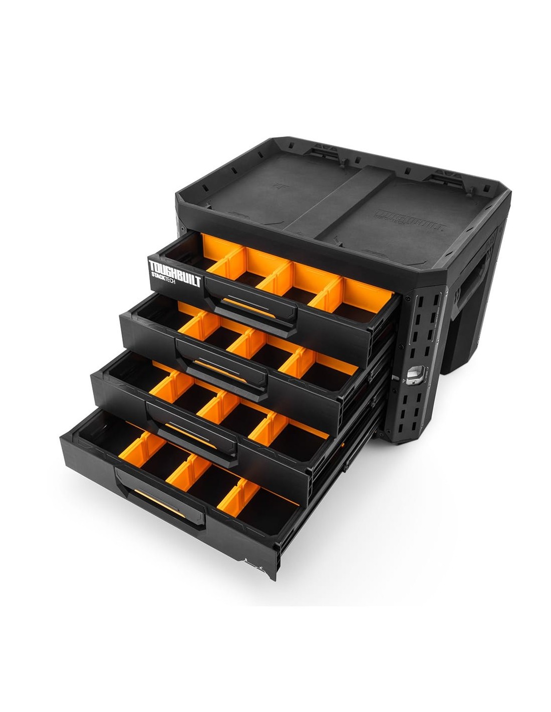 Maletín stacktech de 4 cajones estructura autoalienable y encajable el autobloqueo se activa automáticamente cuando cada caja se coloca en su sitio acceso rápido al espacio de almacenamiento sin necesidad de desapilar la posición del cierre indica cuando es seguro transportarla asas de transporte laterales robustas y abatibles rieles para accesorios para añadir complementos de liberación rápida cierre deslizante apto para candado, no incluido polímero negro de alto rendimiento y esquinas de acero incluye 12 separadores largos y 32 separadores cortos en su interior 53 x 40,5 x 39,5 cm