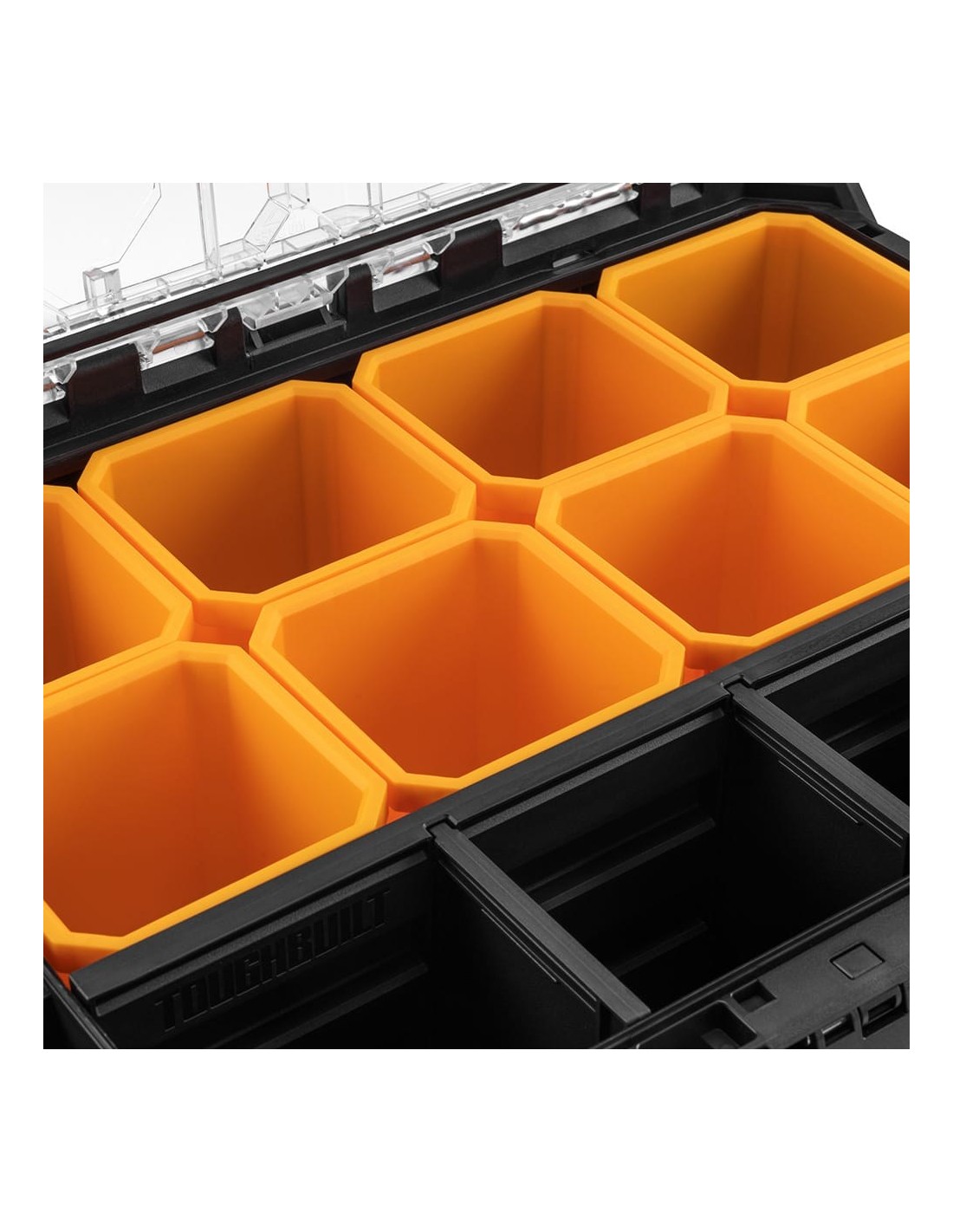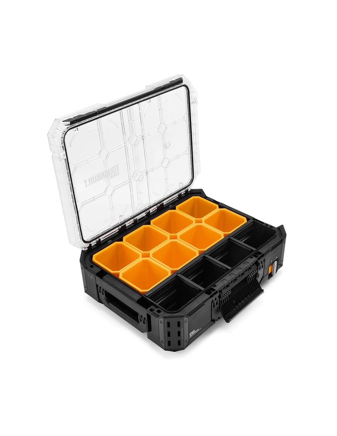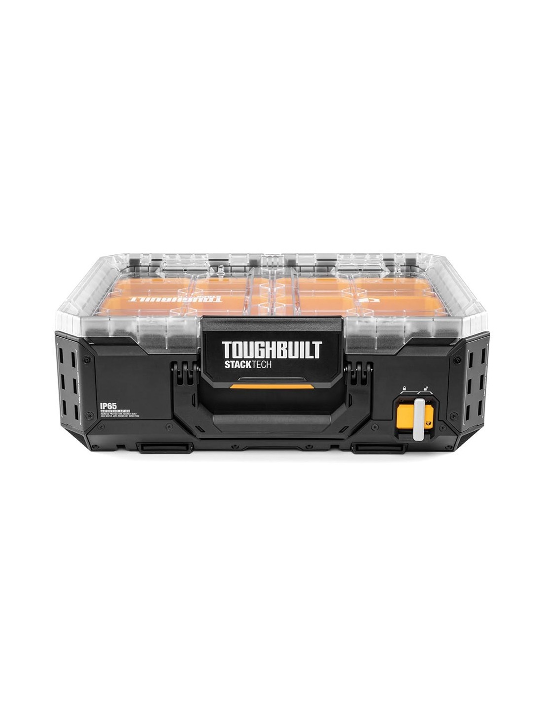 Organizador encajable autoalineable, el mecanismo de autobloqueo se activa cuando la caja se coloca en su sitio, el interruptor deslizante desbloquea el apilamiento e indica cuándo está lista para el transporte rieles para accesorios de liberación rápida totalmente personalizables cierre central proporciona acceso rápido a las herramientas construcción en polímero negro de alto rendimiento, esquinas de acero, tapa transparente reforzada con acero 2 puntos de cierre compatibles con la mayoría de candados, no incluidos capacidad máxima de 34 kg, ip65, incluye: 8 contenedores, 1 separador largo, 3 separadores cortos en su interior, dimensiones: 53 × 40,5 × 19 cm