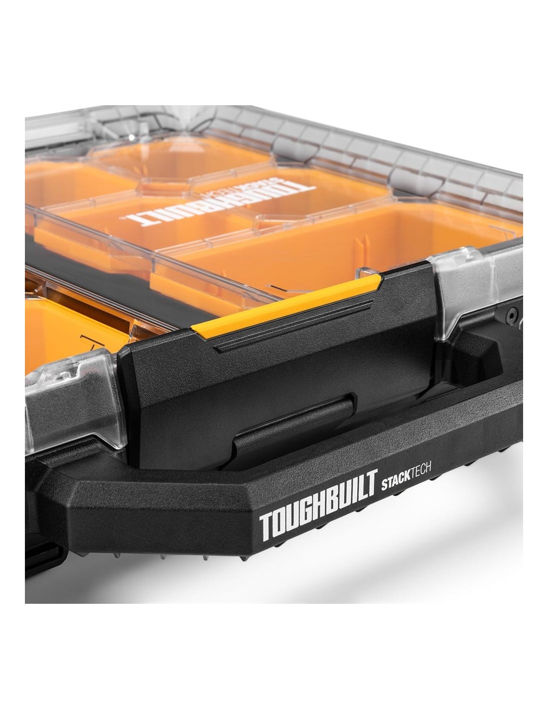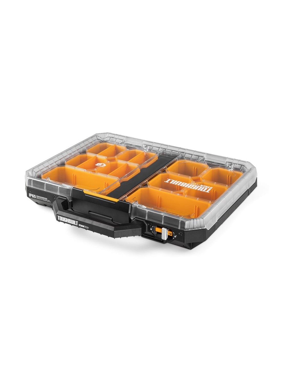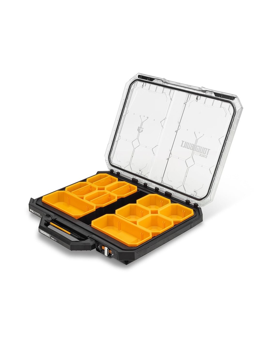 Organizador stacktech, bajo perfil, encajable autoalineable el mecanismo de autobloqueo se activa cuando la caja se coloca en su sitio el interruptor deslizante desbloquea el apilamiento e indica lista para el transporte el cierre central proporciona un acceso rápido a las herramientas construcción en polímero de alto rendimiento negro y una tapa transparente reforzada con acero ip65 incluye 10 contenedores y 4 separadores en su interior. 53 x 40,5 x 10 cm