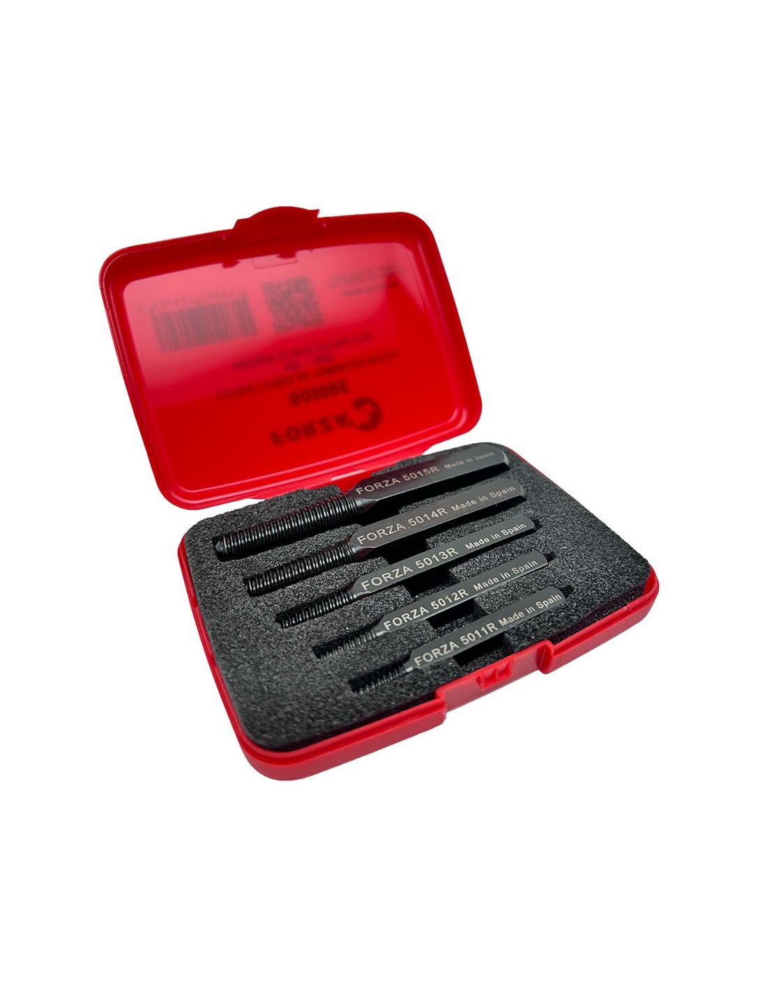 Extractor tornillos rotos roscados 5010re, juego de 5 piezas. incluye 5 extractores de distintos tamaños con diámetros de ø3, 4, 5, 6, 8 mm, diseñados específicamente para remover tornillos rotos o dañados desde m4 a m16 con facilidad y precisión. cada extractor cuenta con una rosca cónica a izquierdas, lo que significa que, mientras se gira en sentido horario, se ajusta más firmemente al tornillo roto, facilitando su extracción sin dañar las superficies circundantes. fabricados con acero de alta resistencia. presentado en estuche de plástico rojo